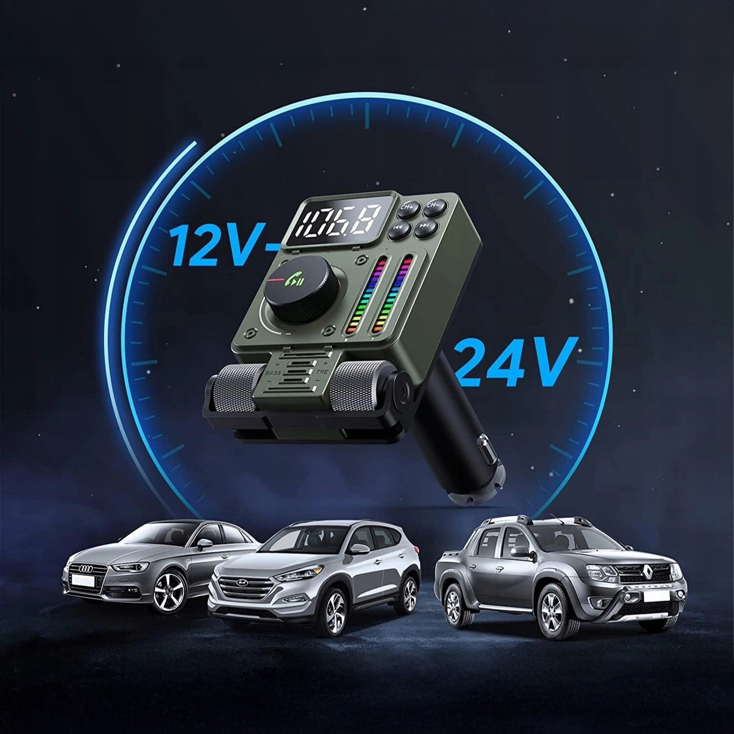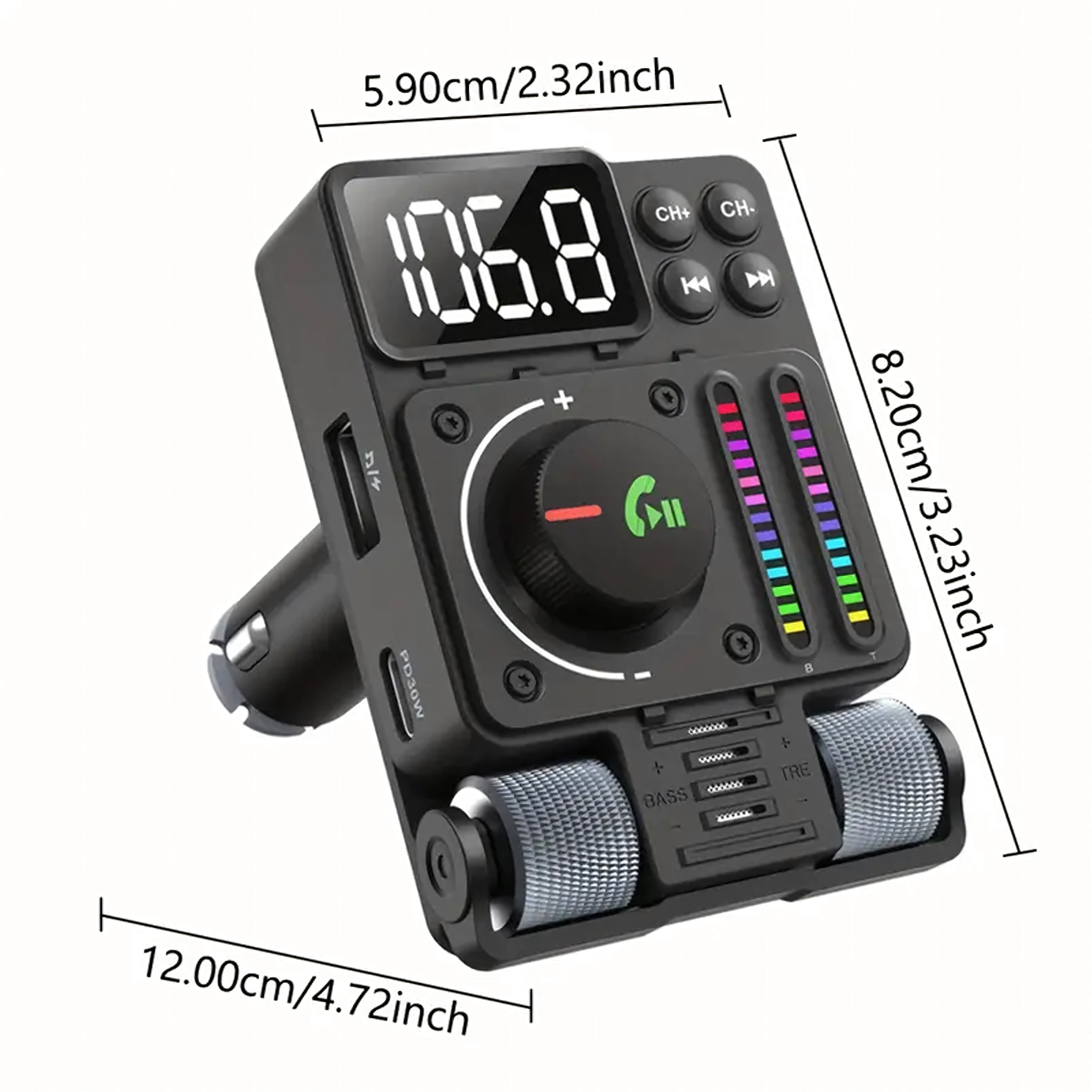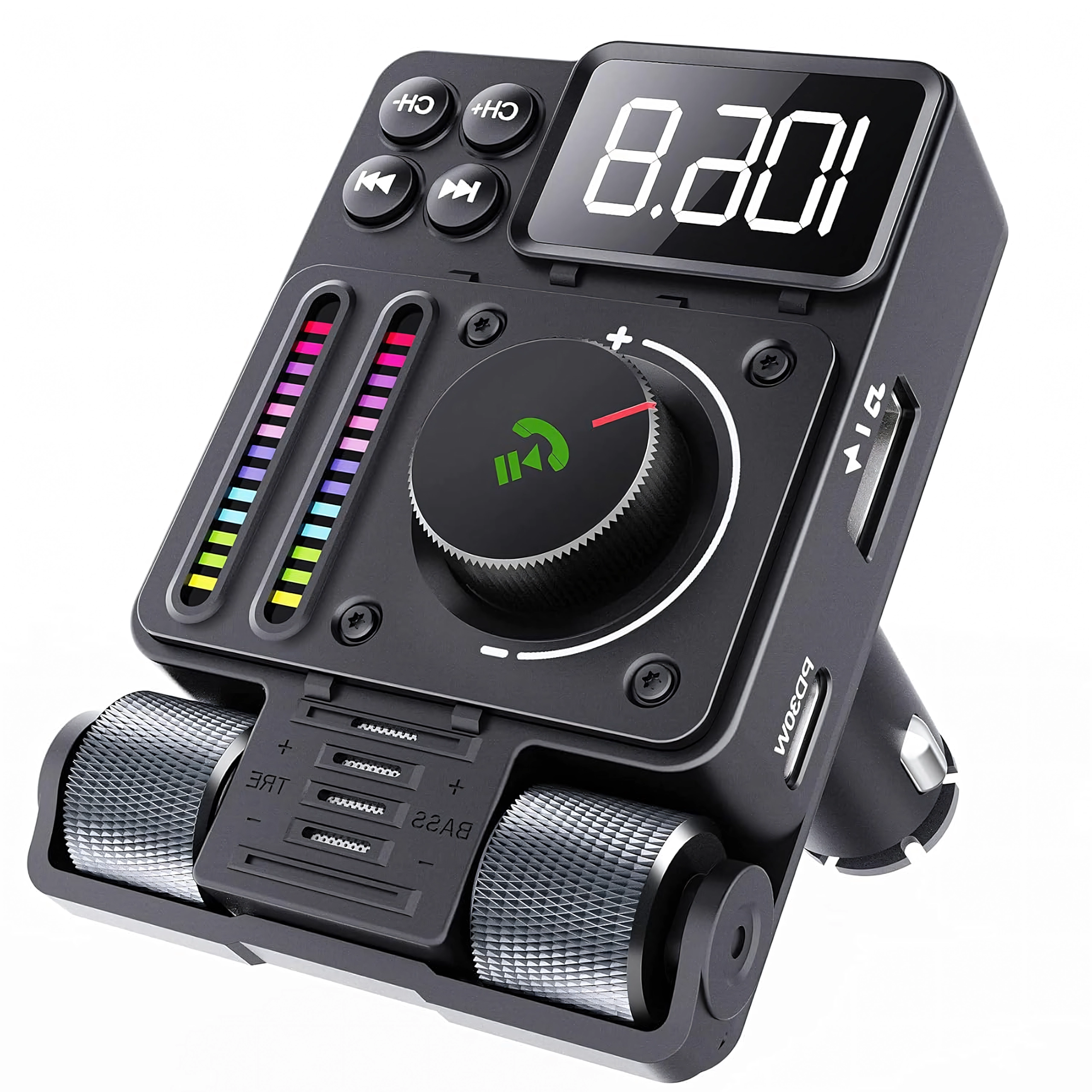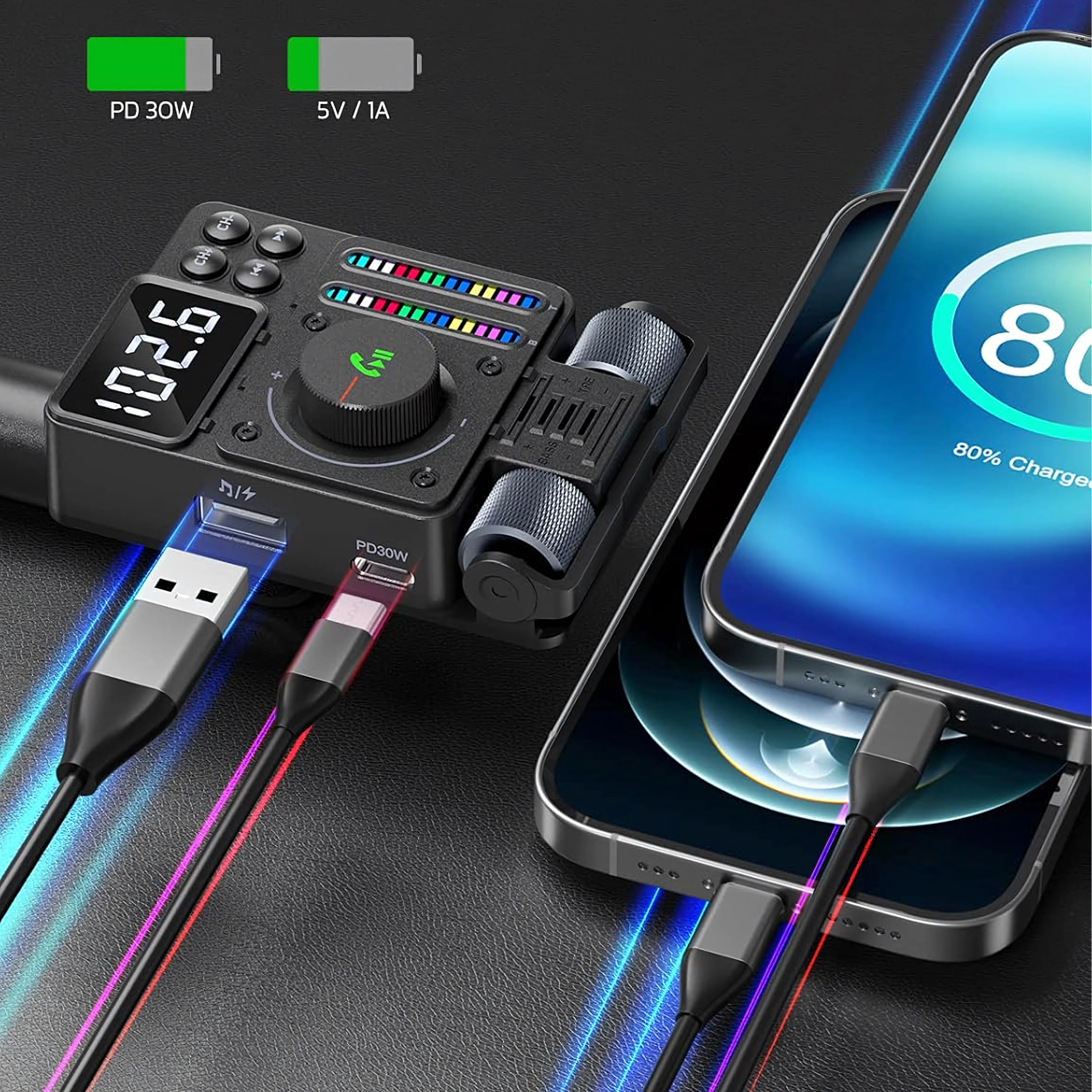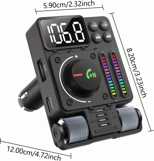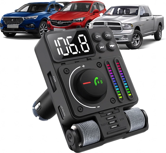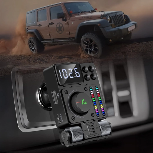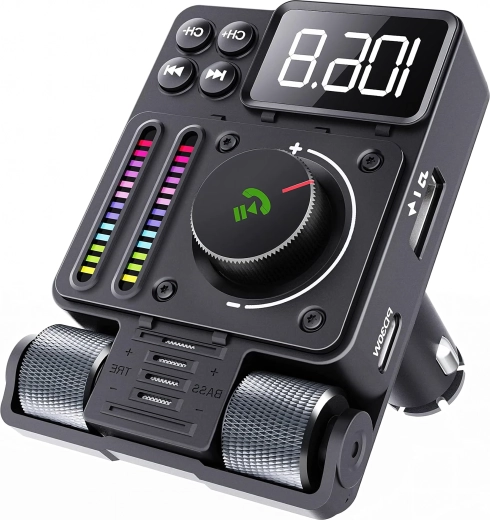Multifunkční Bluetooth 5.3 FM transmitter do auta s rychlým nabíjením PD 30 W nabízí streamování hudby, čisté handsfree hovory a barevné LED podsvícení. Ideální pro pohodlné a moderní používání výbavy ve vašem voze.
