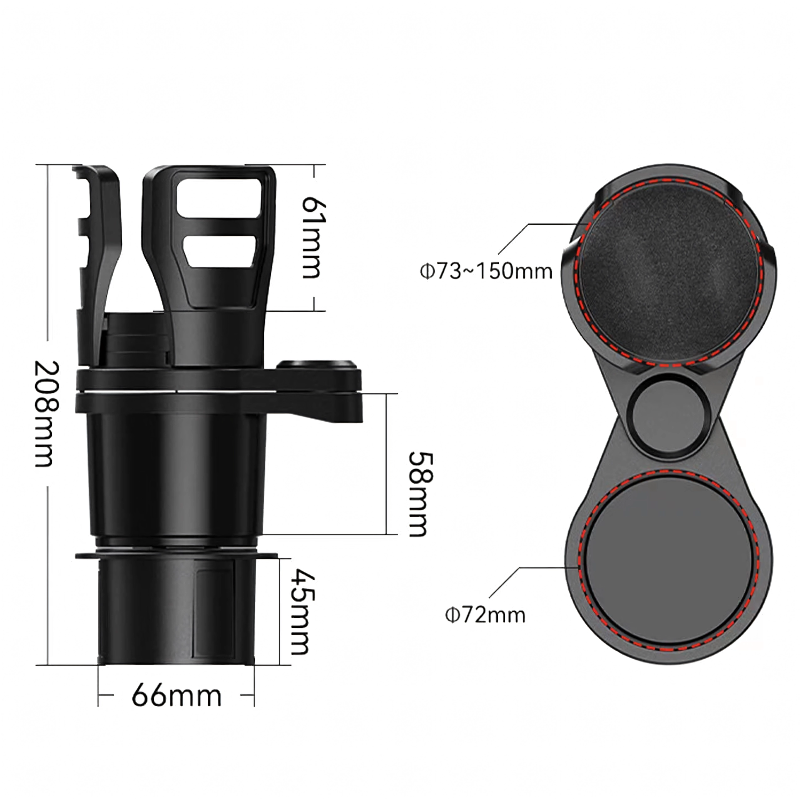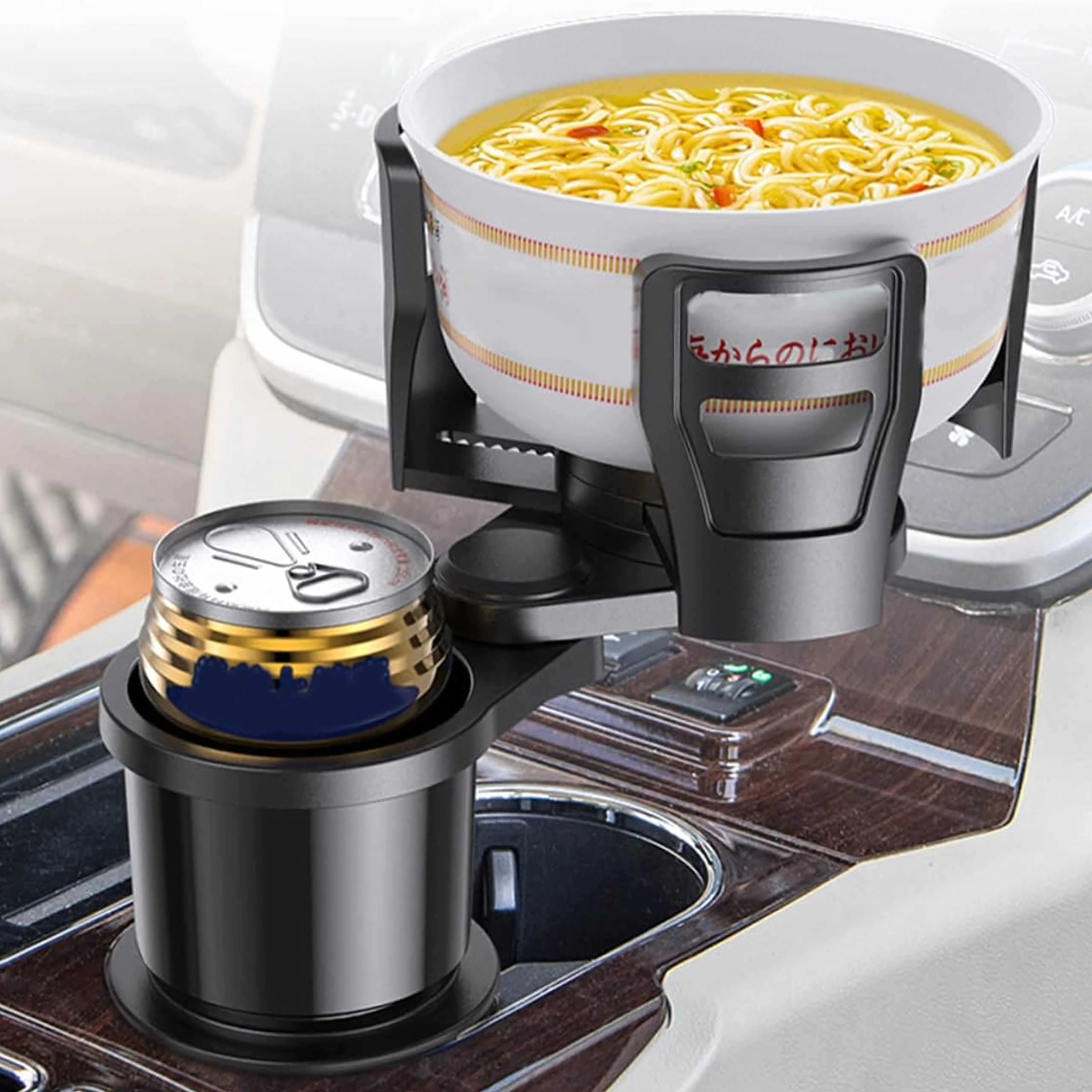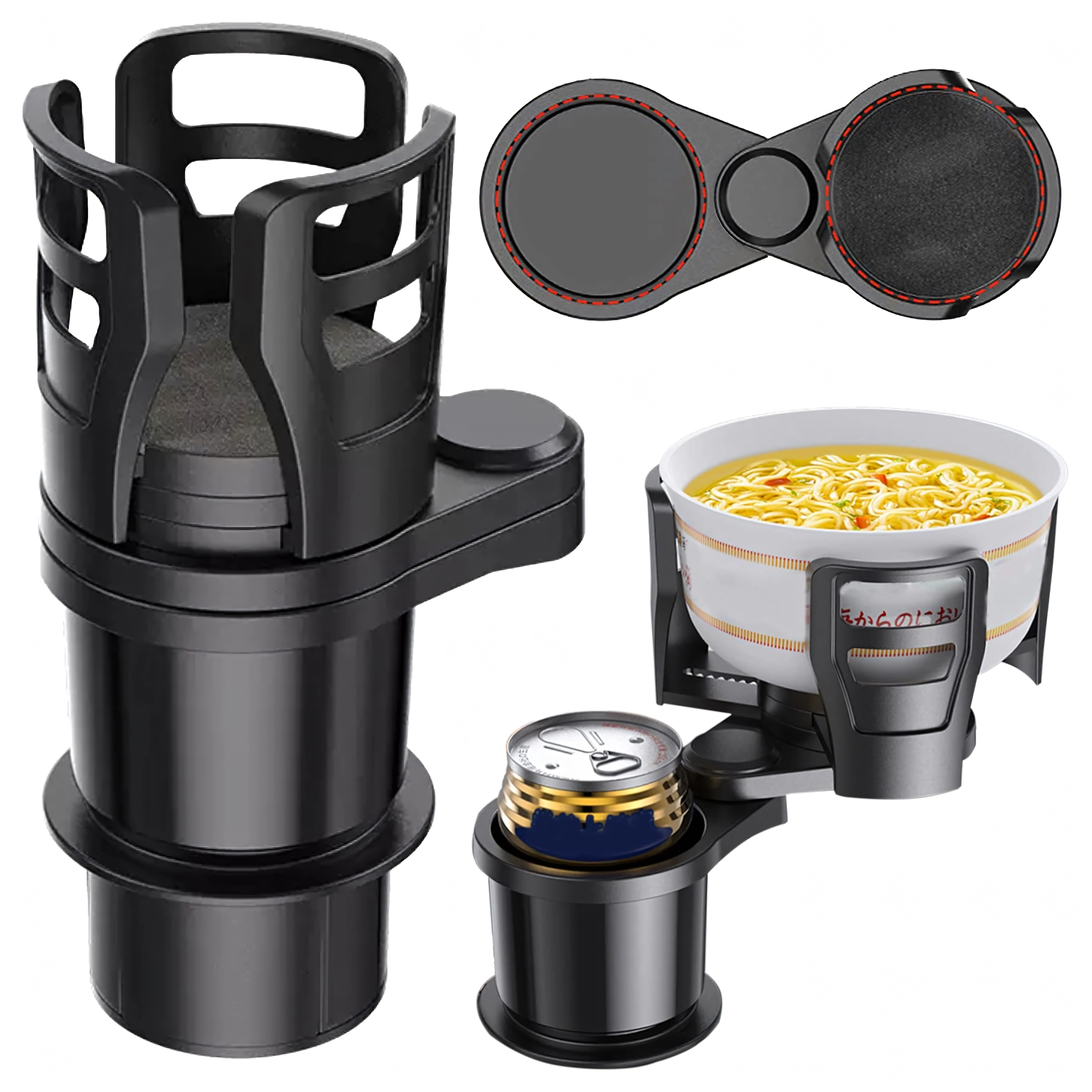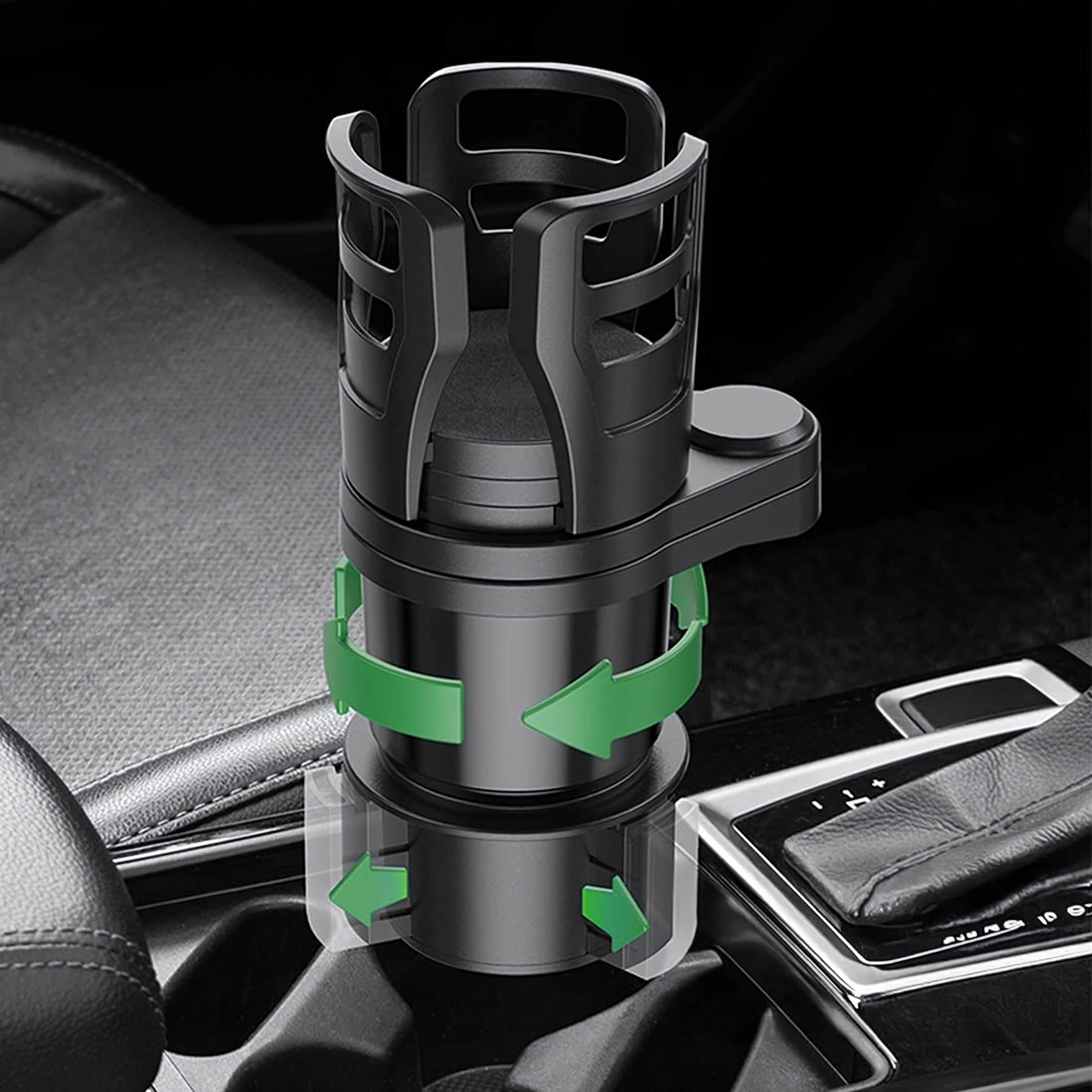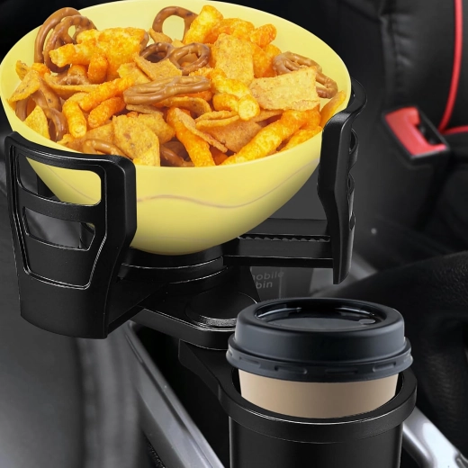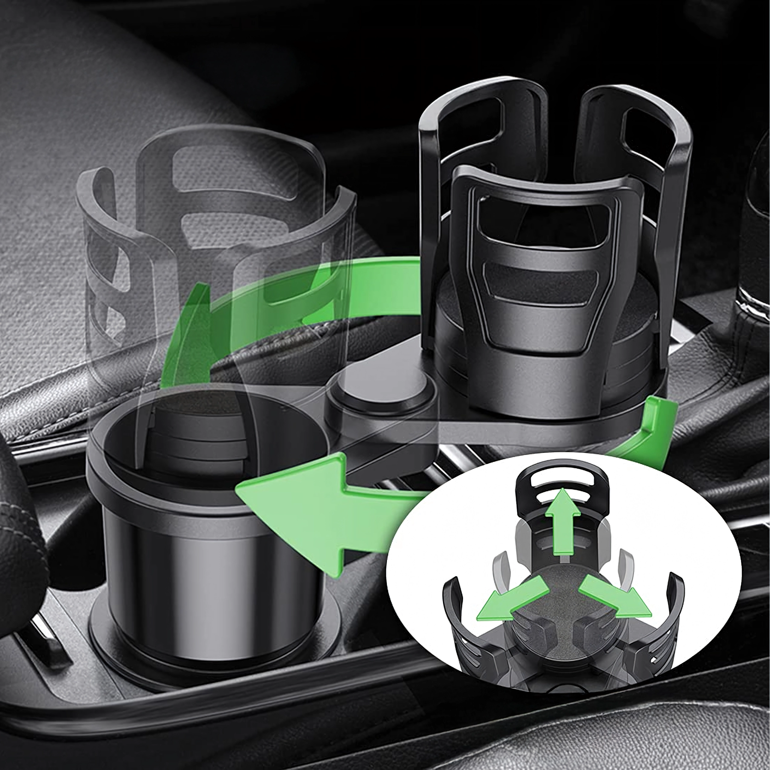 Udržte pořádek a pohodlí ve svém voze díky chytrému držáku 2v1. Hlavní přihrádka s regulací průměru pojme různé typy kelímků a lahví, zatímco menší přídavný držák je ideální pro plechovky, kávu nebo menší lahvičky. Otočný mechanismus 360° umožní snadné natočení pro řidiče i spolujezdce.