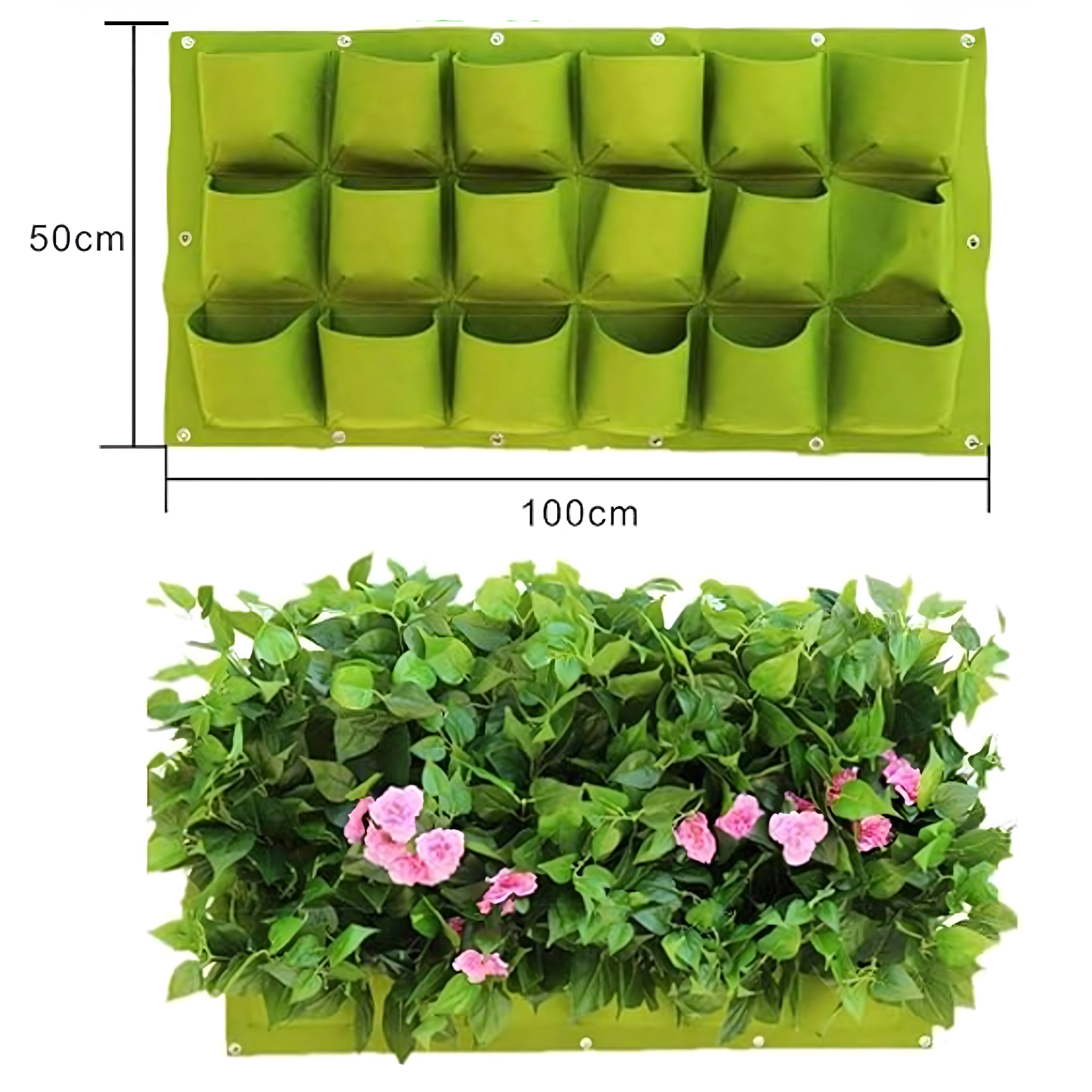 Vytvořte si svůj vlastní vertikální zahradní kout kdekoli – doma, na balkoně i na zahradě. Tento závěsný květináč s rozměry 100 × 50 cm má 18 prostorných kapes, do kterých snadno vysadíte bylinky, saláty i oblíbené květiny. Schodovitě/kaskádově řešená konstrukce šetří místo a zároveň zajišťuje lepší přístup světla i vody pro každou rostlinu.