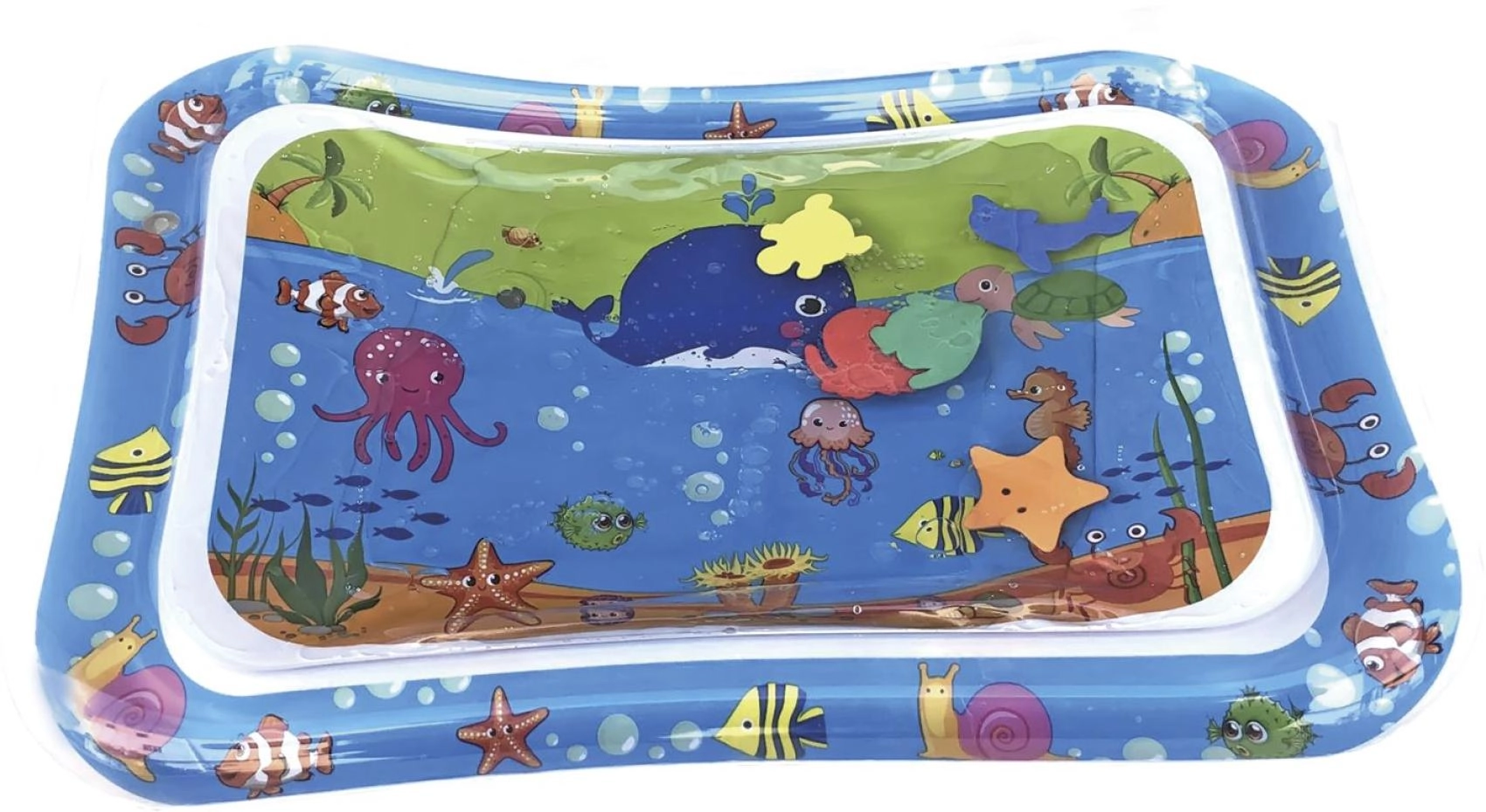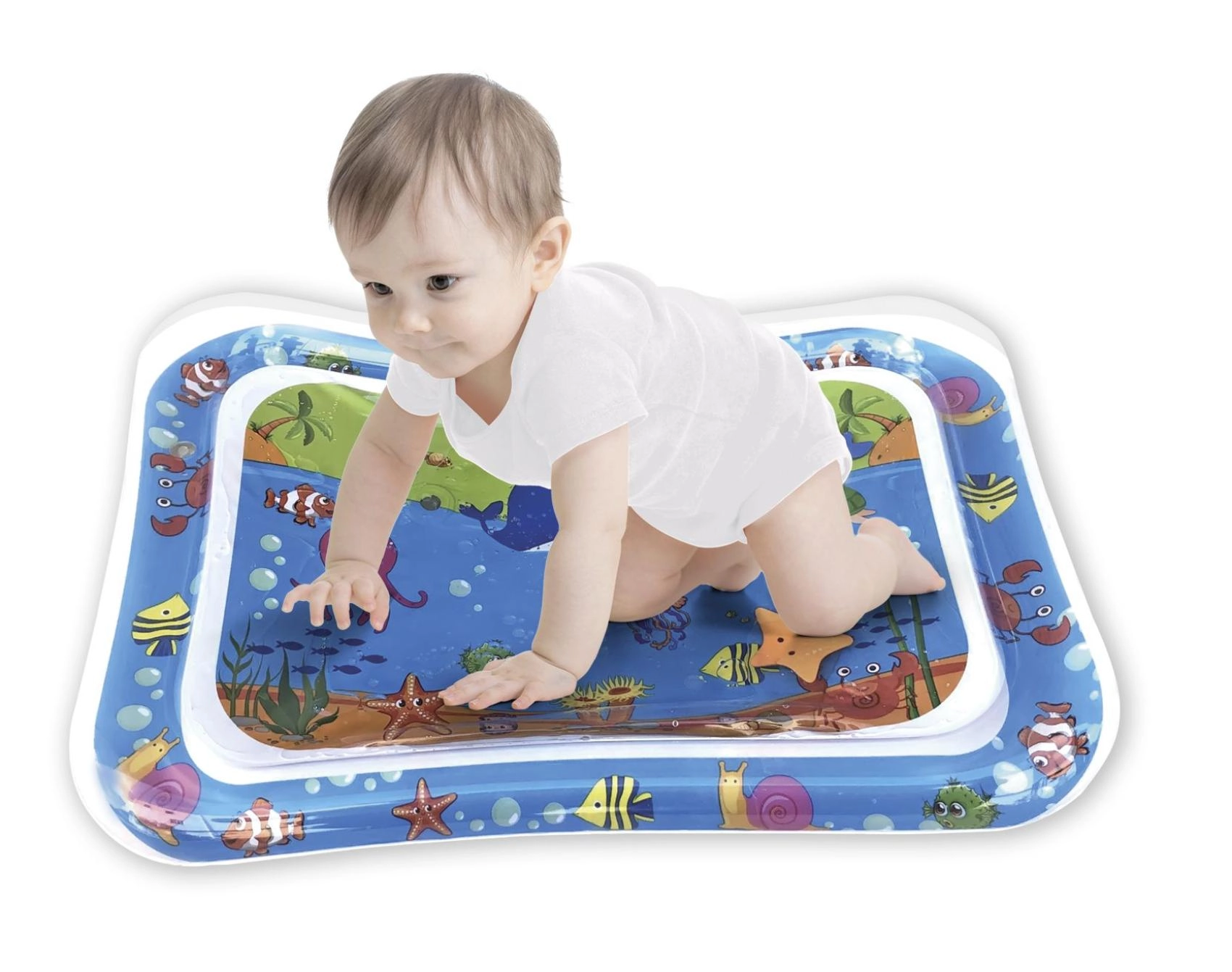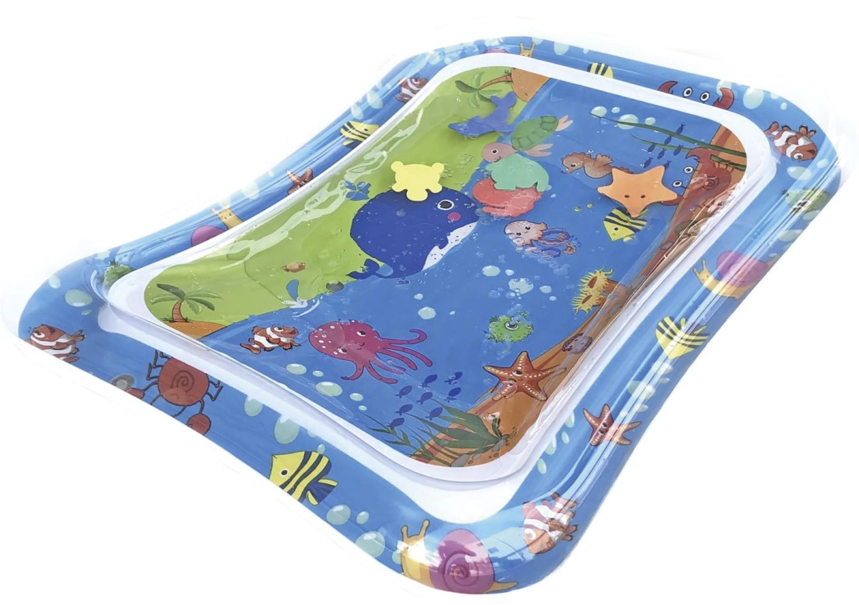 Tato nafukovací vodní podložka s oceánskými motivy nabízí dětem bezpečné a zábavné prostředí pro hru na bříšku i první zvedání hlavičky. Vodní komora s plovoucími tvary vytváří efekt pohybu, který přirozeně podněcuje zrak, hmat a koordinaci oko–ruka.