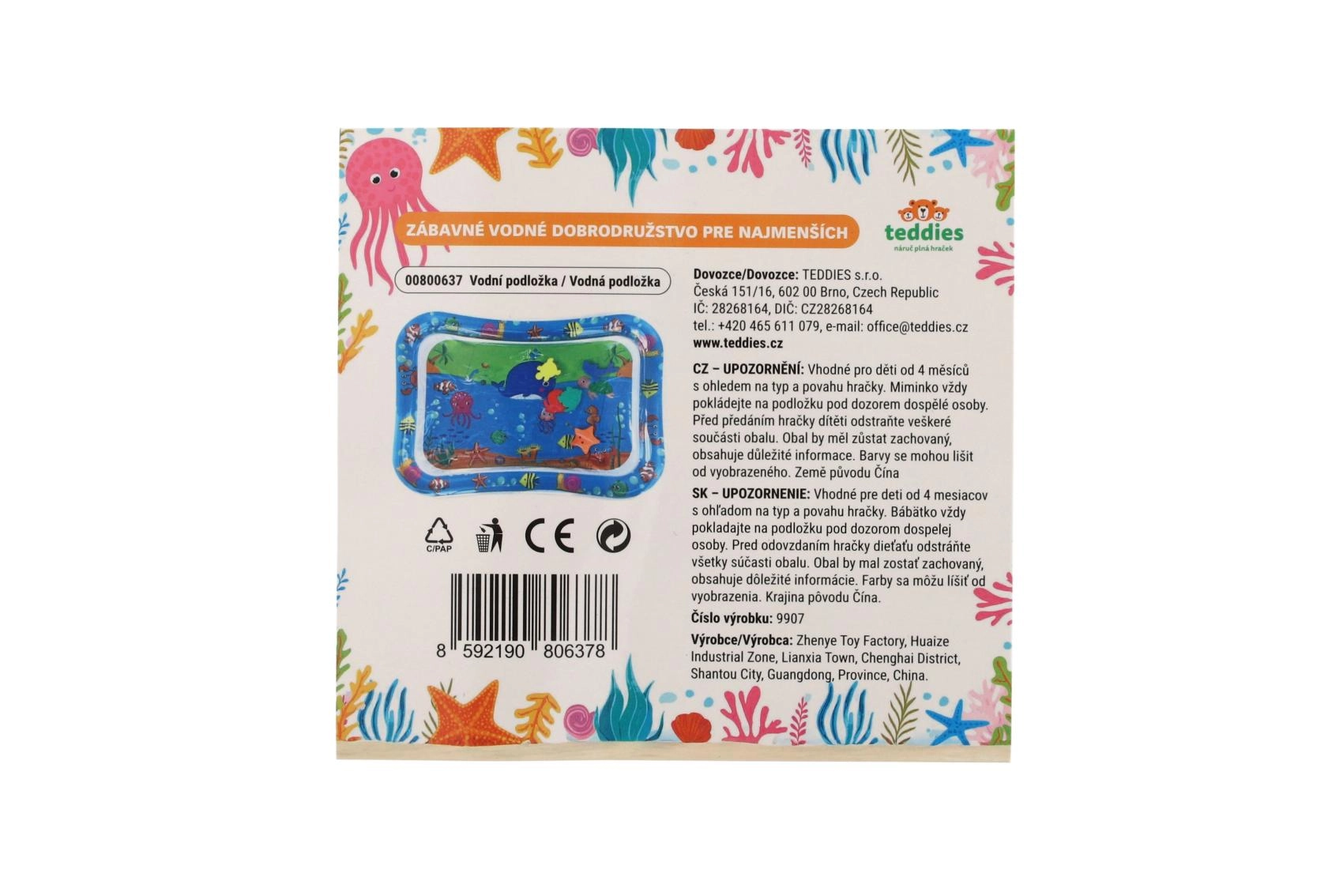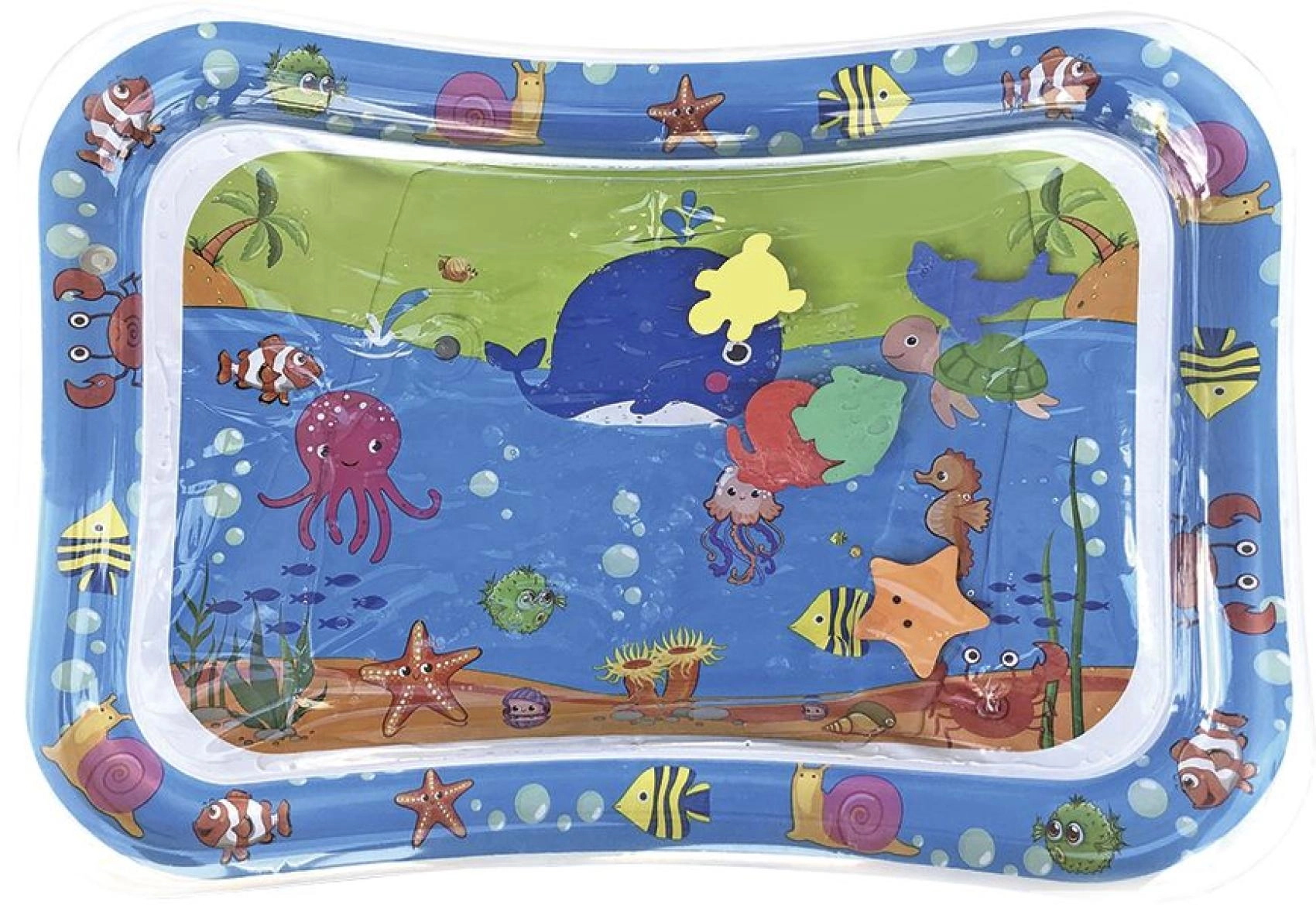 Zábavná interaktivní vodní podložka s motivem moře pro nejmenší podporuje smyslové vnímání, rozvoj motoriky i tummy time. Snadno se nafukuje a plní vodou, uvnitř se pohybují barevná zvířátka, která lákají děti k objevování a hře. Součástí je pumpička a podložku přenesete v praktické tašce se zipem.