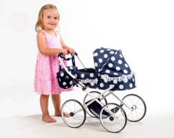 Tento roztomilý retro kočárek pro panenky je skvělou volbou pro děti, které milují hru na rodinu. Kombinace černé barvy s bílými puntíky a ozdobnou krajkou působí stylově a nadčasově, ratanová postýlka dodává kočárku kouzelný vzhled. Díky nastavitelné rukojeti (55 cm) se kočárek dobře přizpůsobí výšce dítěte.