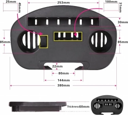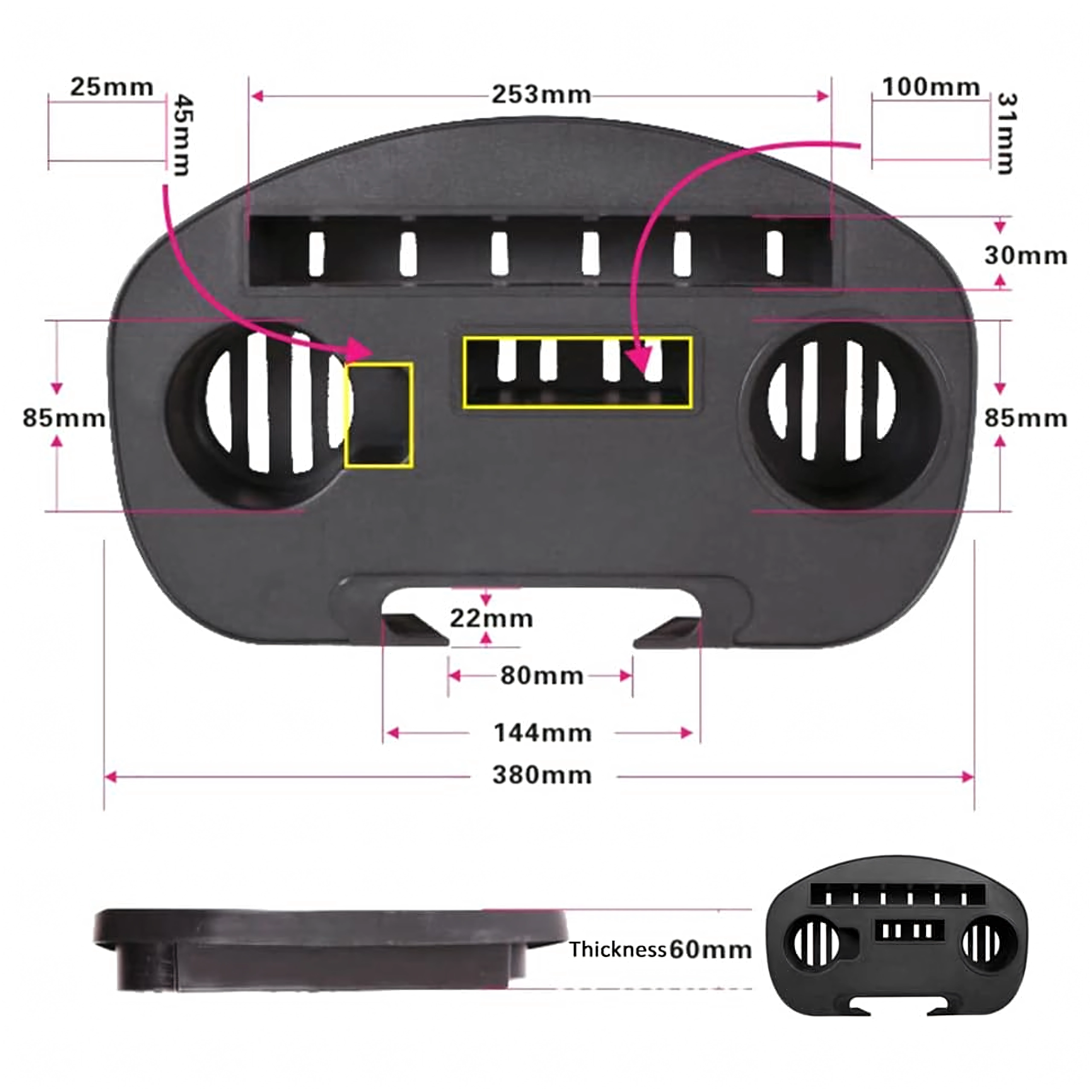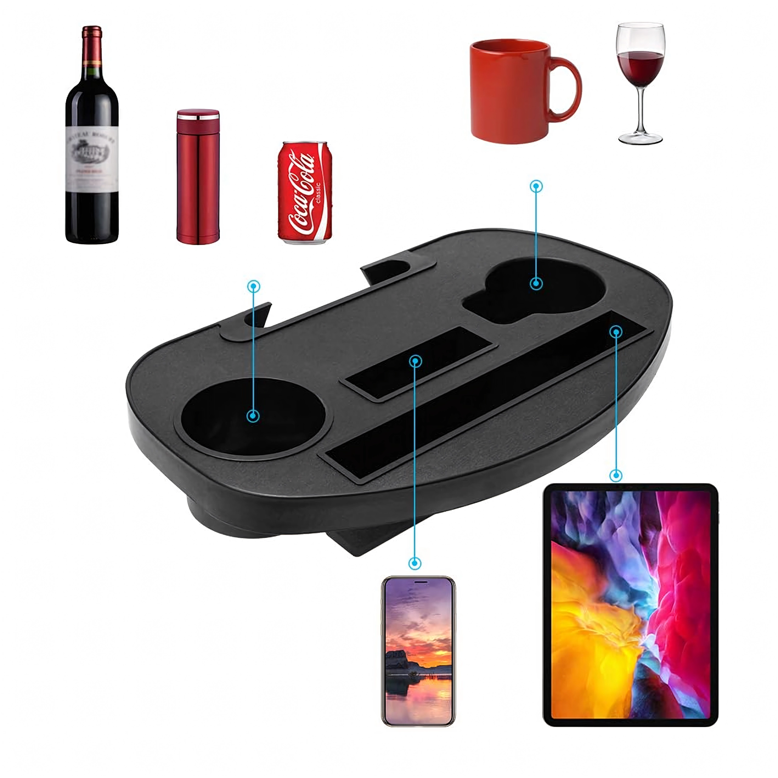- Praktické členění: 2 držáky nápojů, slot na telefon/tablet, přihrádky na drobnosti.