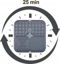 Zadní strana s protiskluzovými přísavkami drží podložku pevně na podlaze nebo na svislém povrchu (např. v koupelně při koupání). Podložka je z měkkého, snadno omyvatelného silikonu a je ideální pro zpomalení krmení i jako rozptýlení při péči o srst či návštěvě veterináře.