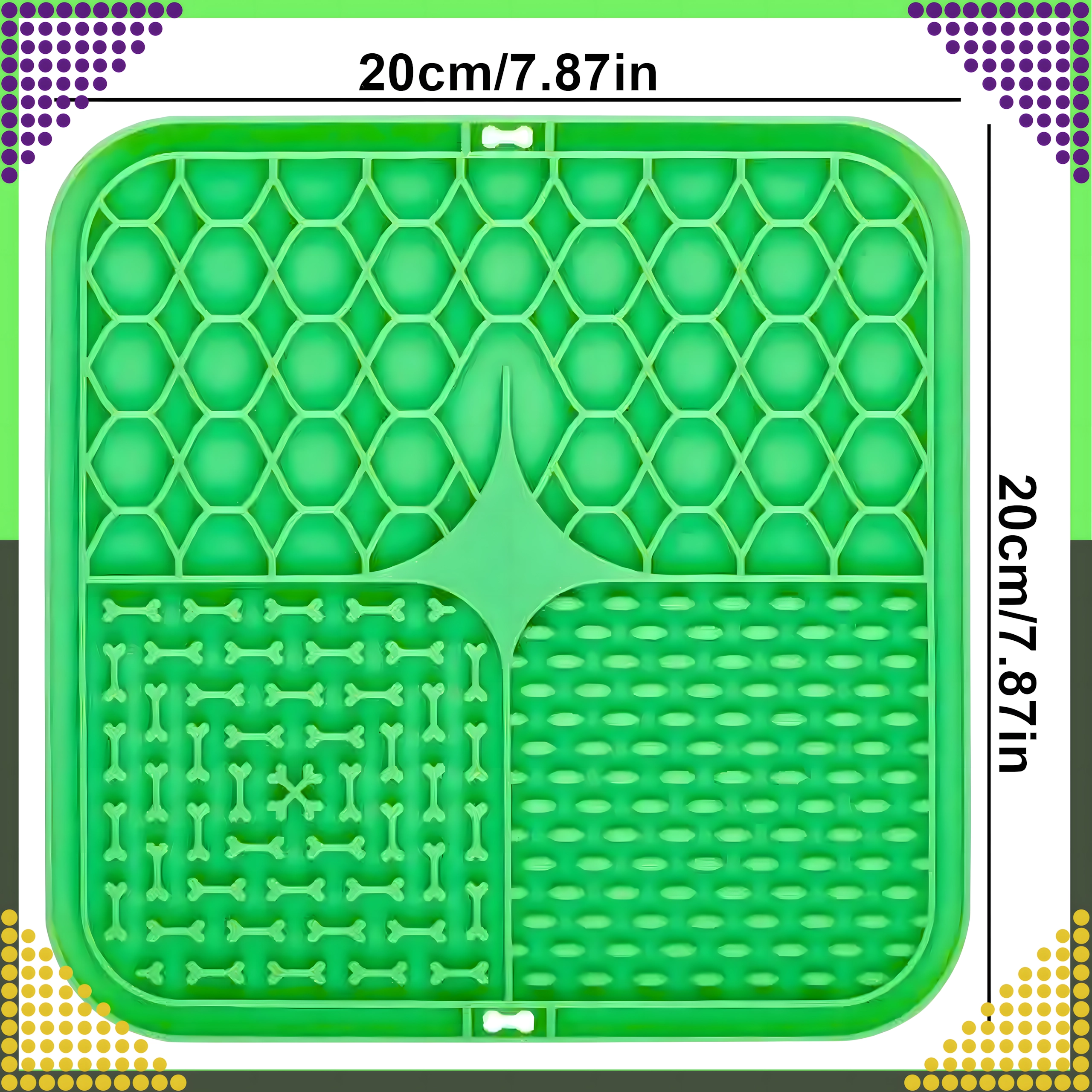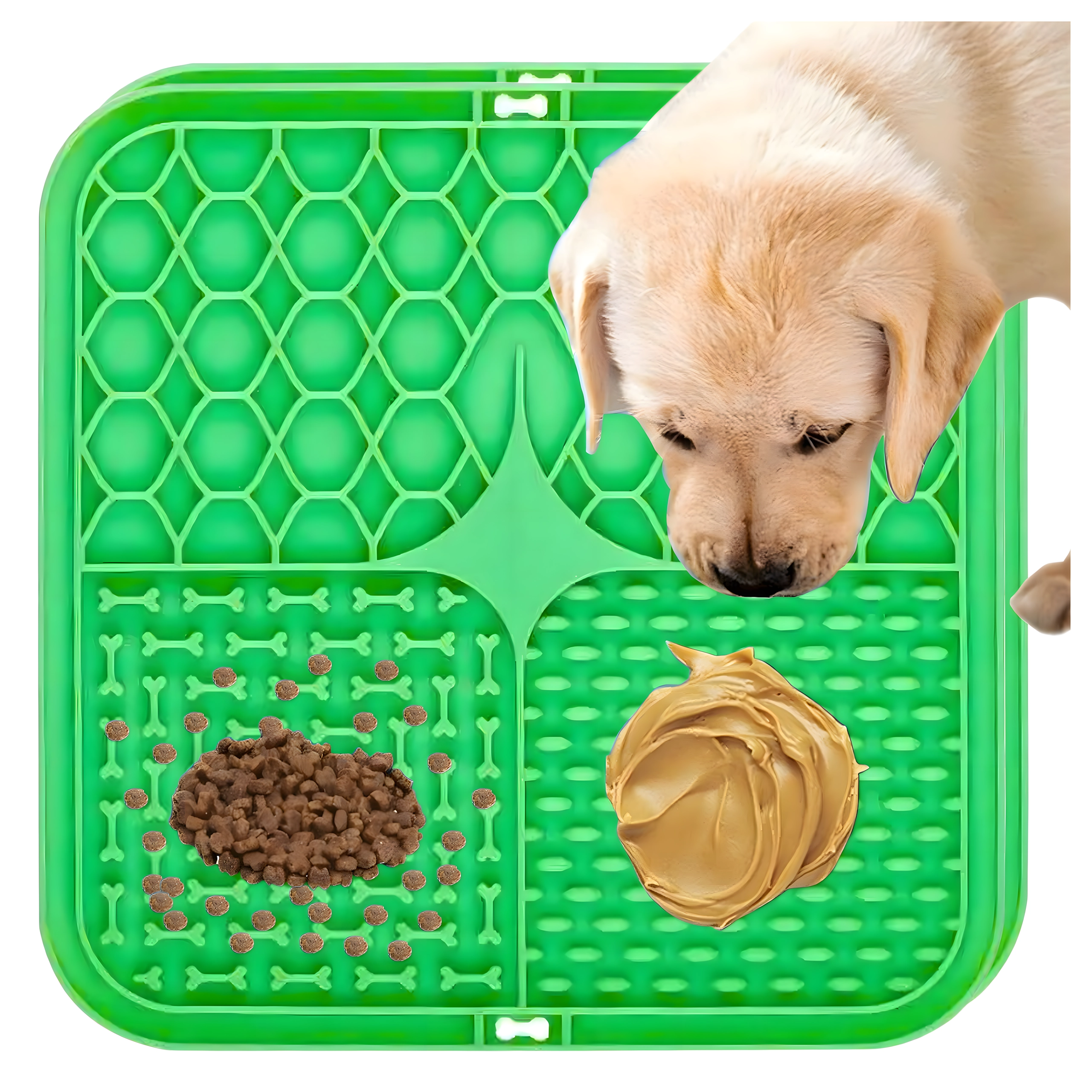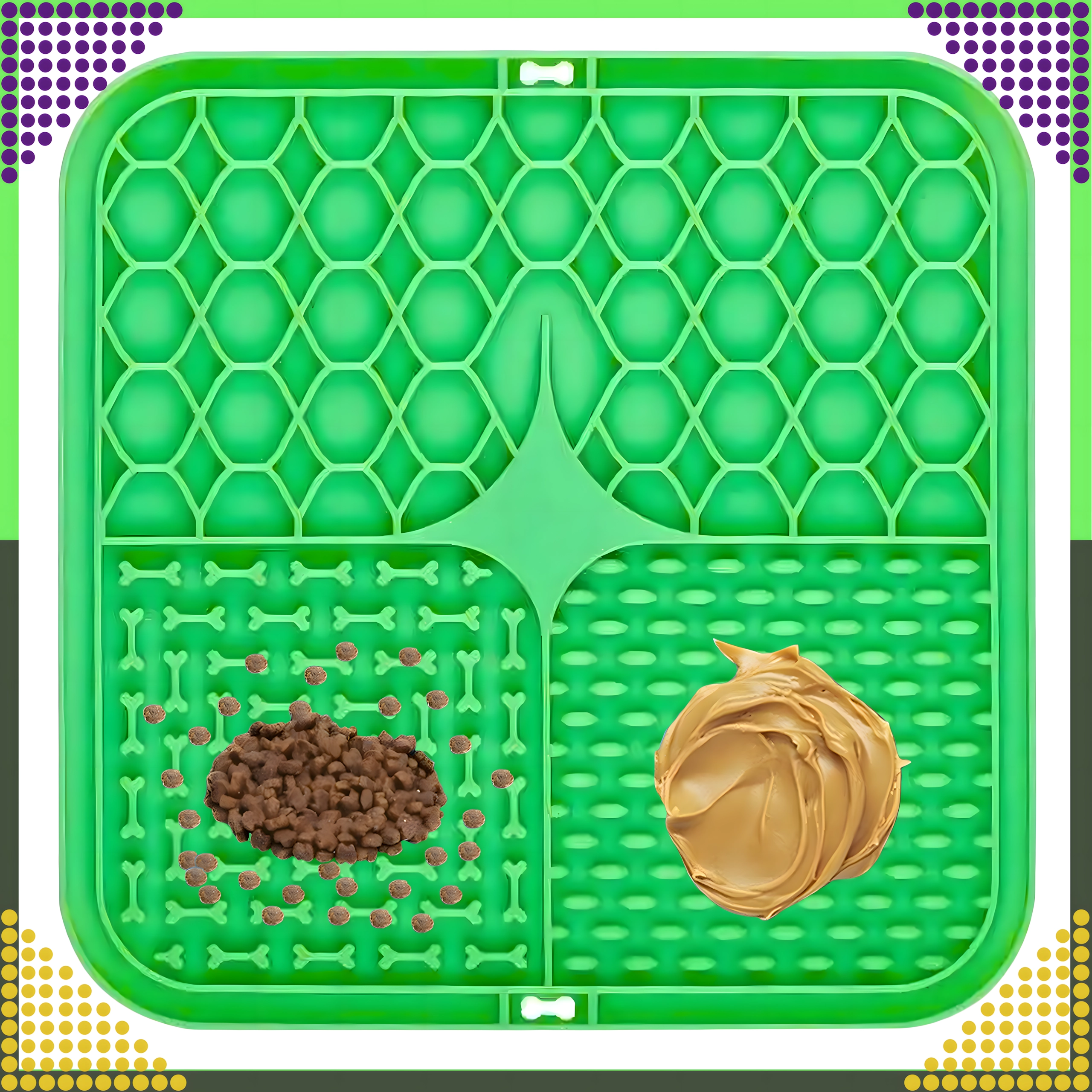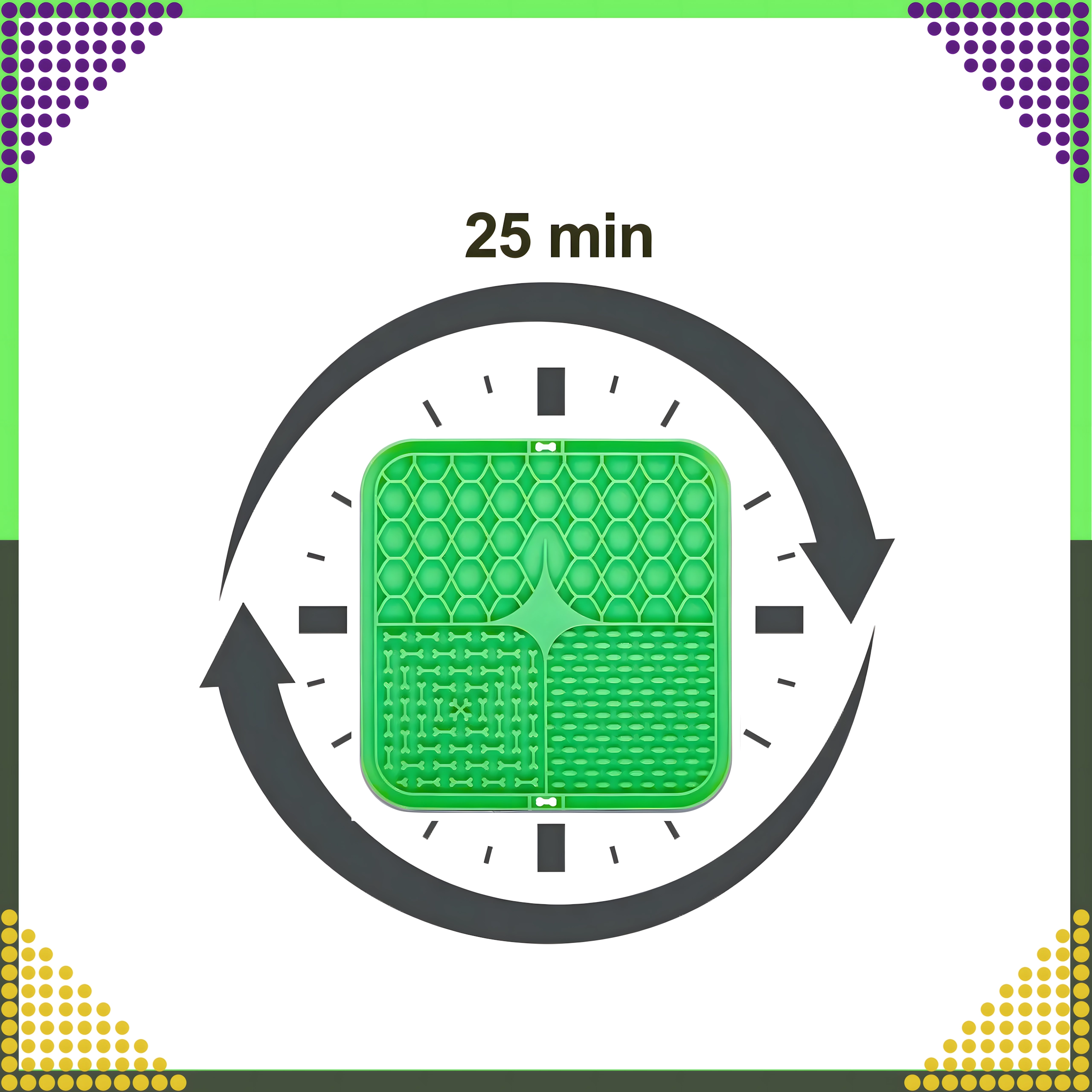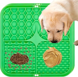 Lízací podložka je vyrobena z měkkého, bezpečného silikonu a má několik texturovaných zón, do kterých rozetřete oblíbené pamlsky (paštika, jogurt, arašídové máslo bez xylitolu, vlhké krmivo). Struktura podněcuje pomalé vylizování, čímž předchází hltání, podporuje lepší trávení a pomáhá snižovat stres a úzkost.