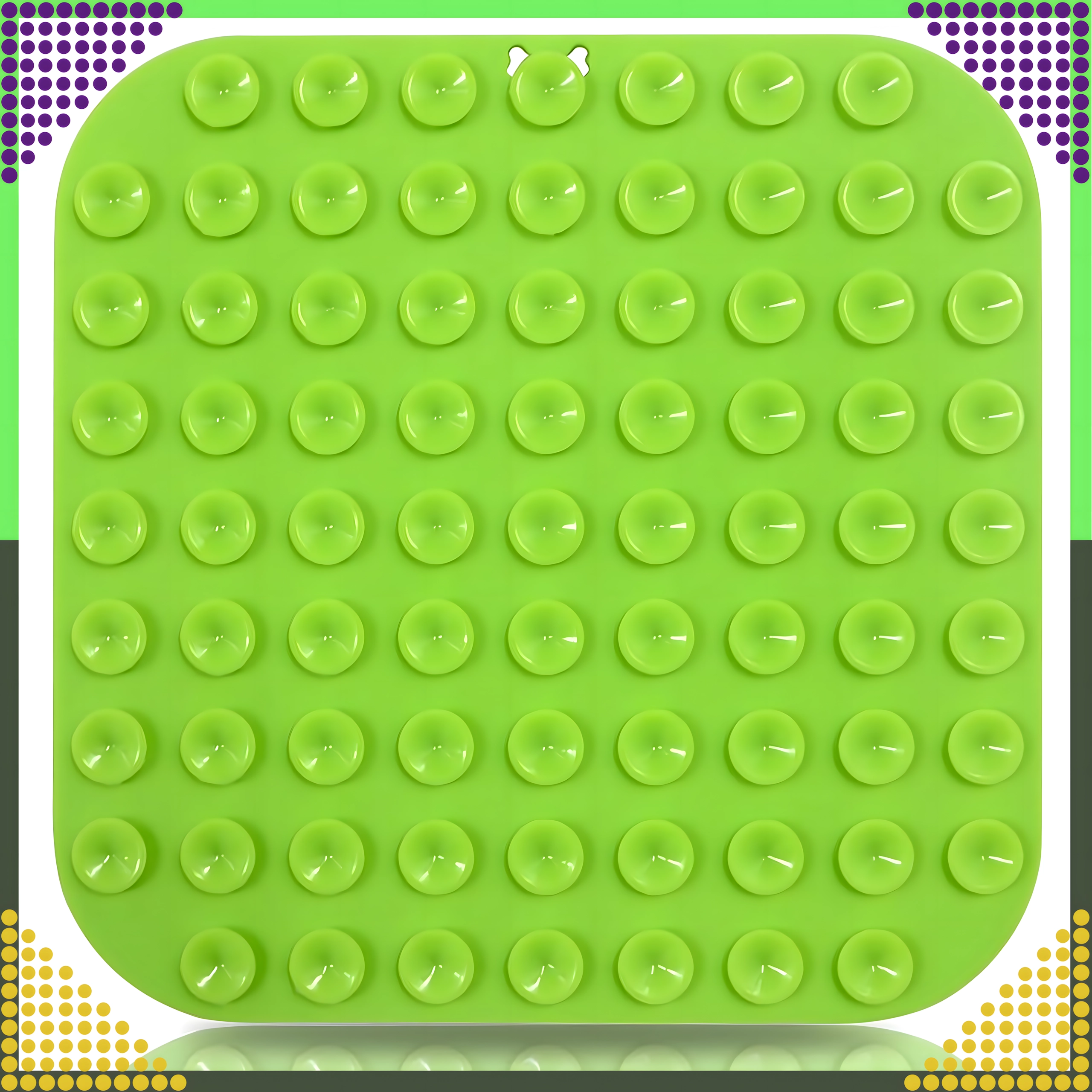 Zadní strana s výstupky/sacími body zajišťuje pevné přichycení na hladké plochy a stabilitu na podlaze. Podložka se snadno oplachuje a udržuje v čistotě, je odolná a opakovaně použitelná – ideální pro každodenní obohacení i zklidnění při péči.