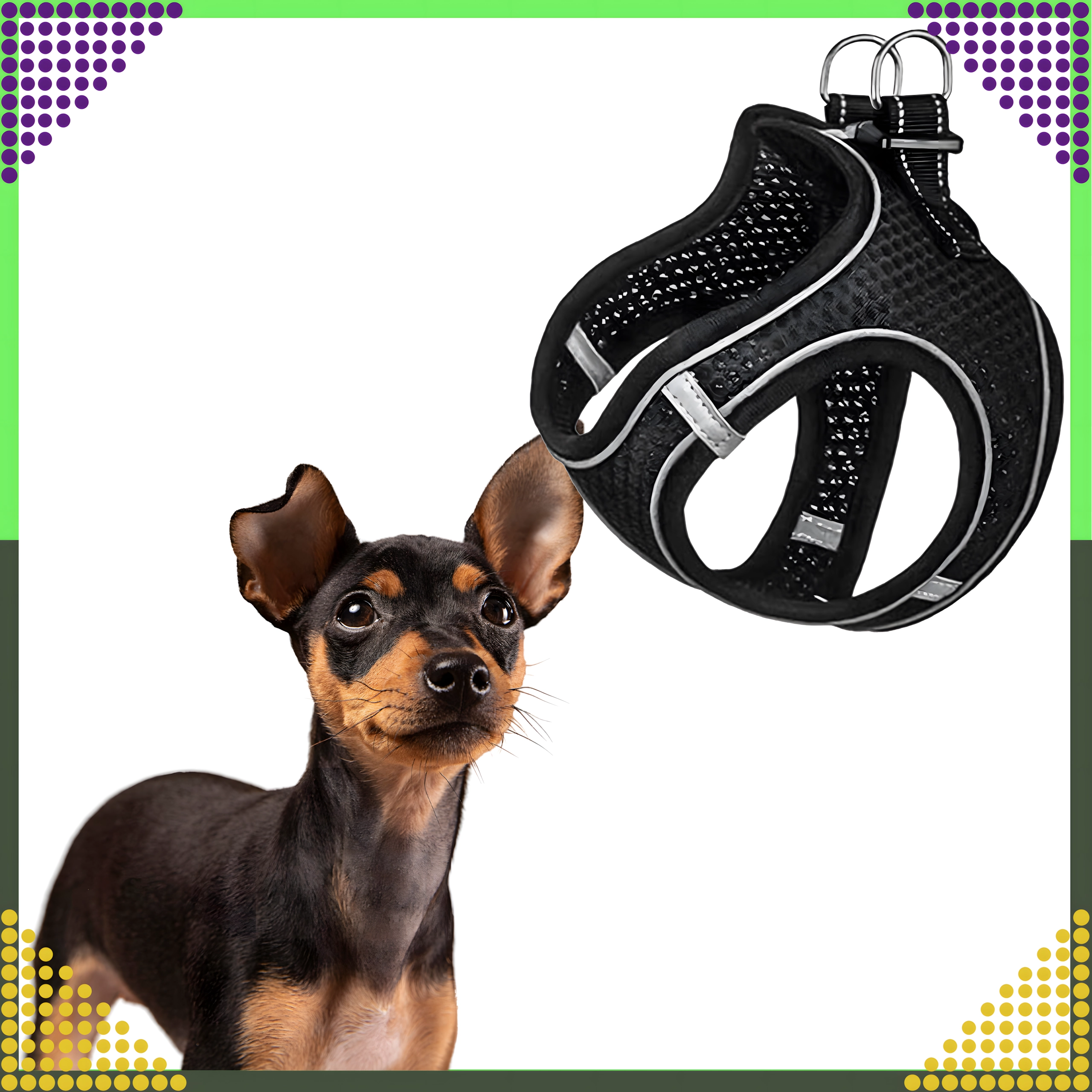 Díky ergonomickému střihu, nastavitelným popruhům a zapínání na zádech sedí postroj jistě a pohodlně. Dvojité kovové D-kroužky poskytují bezpečné upevnění vodítka a kontrolu nad mazlíčkem.