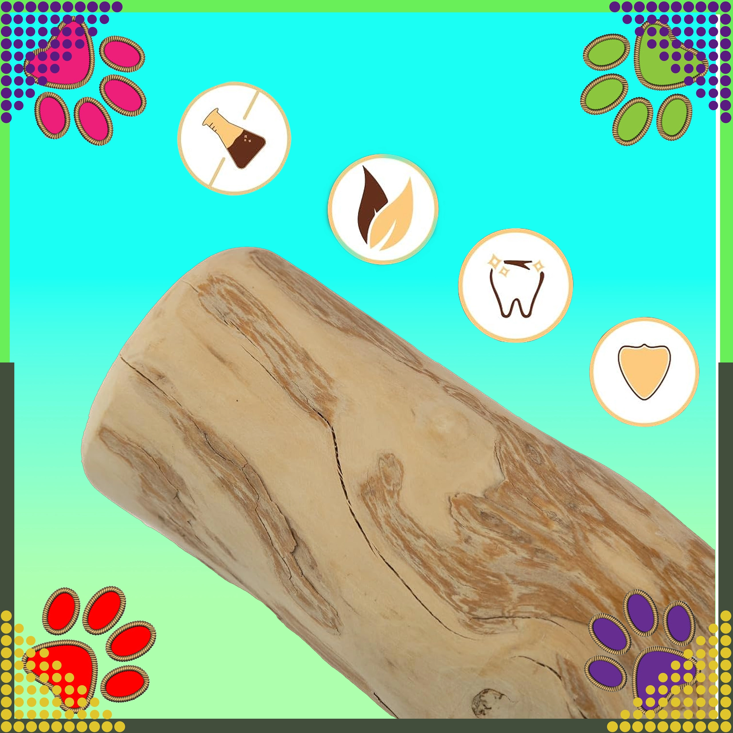 Hladký, zaoblený povrch a přirozená kresba dřeva pro pohodlné a bezpečné žvýkání bez ostrých hran.