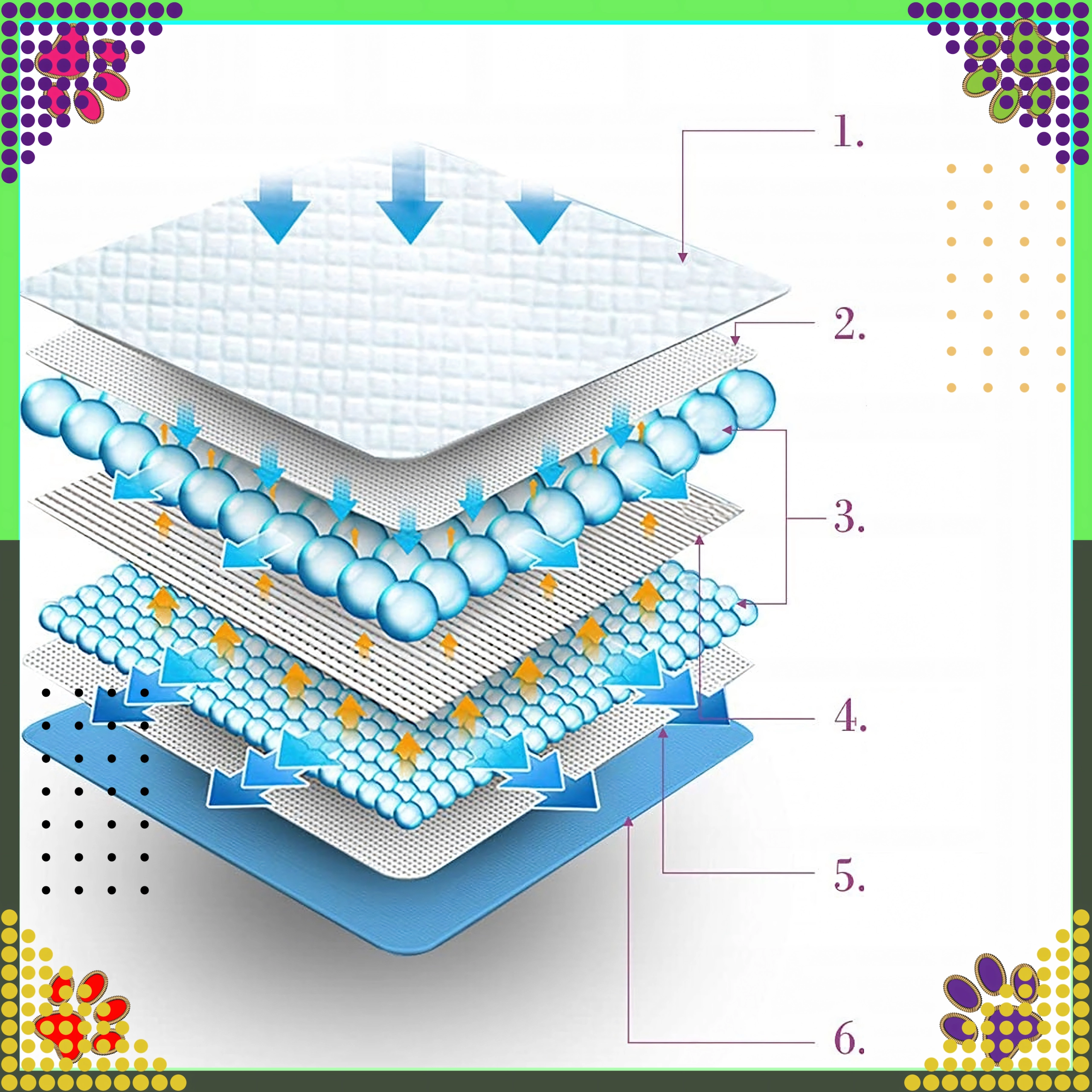 Nepropustná spodní fólie a zesílené okraje brání únikům a chrání podlahy, koberce i nábytek před vlhkostí a zápachem.
