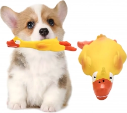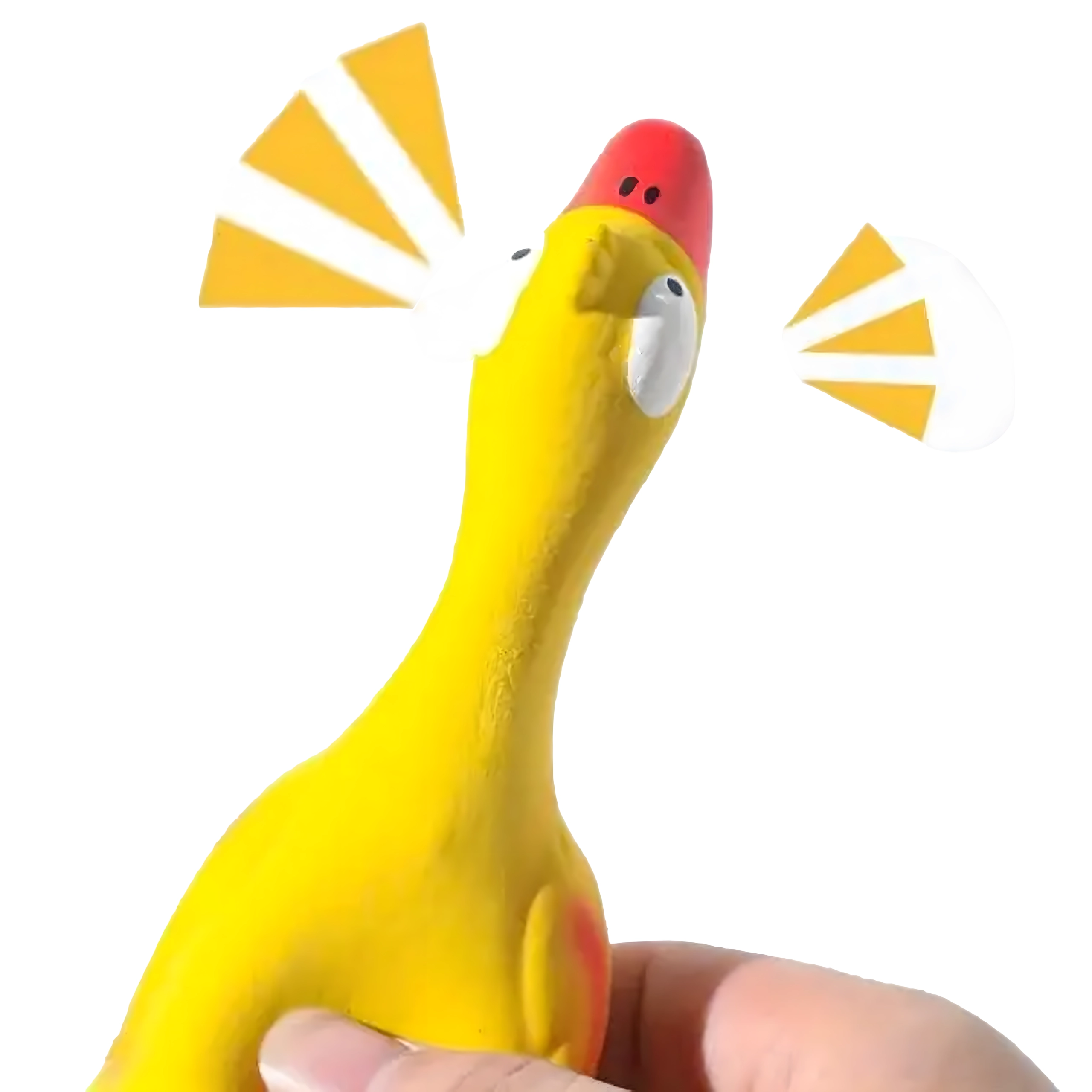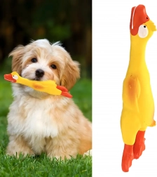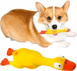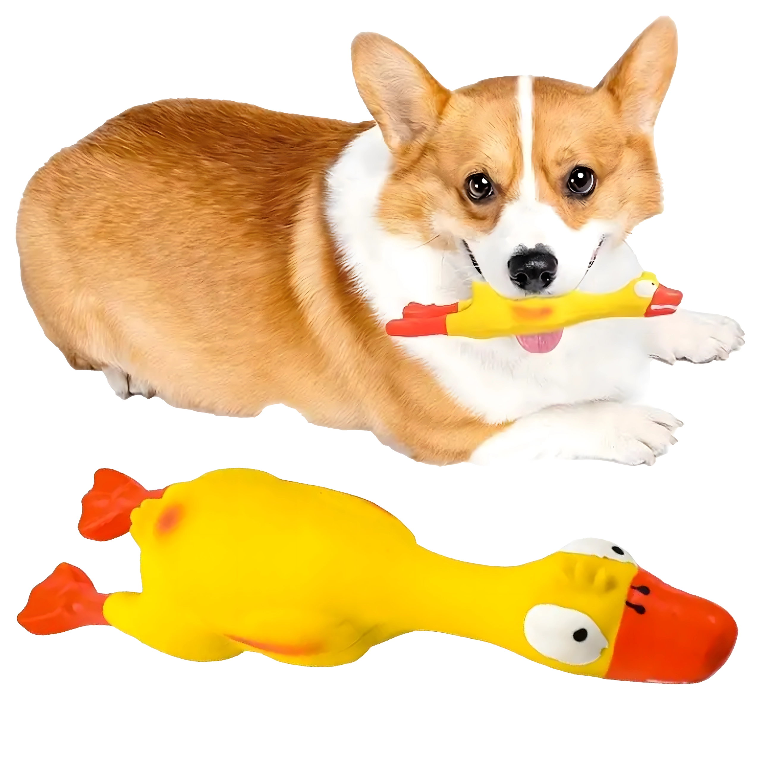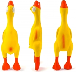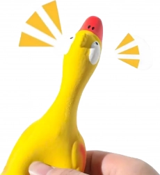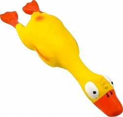 Zábavná pískací hračka ve tvaru kuřete o délce 22 cm pro psy všech velikostí. Odolná a pružná guma láká ke kousání, přetahování i aportování, při stisku píská a motivuje k aktivitě. Skvělá na vybití energie a proti nudě, vhodná i pro kočky.