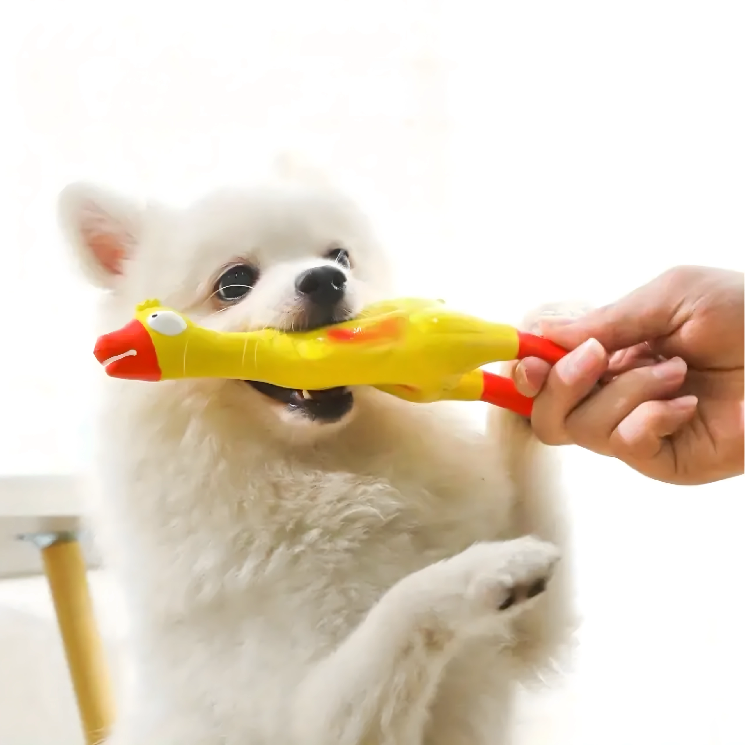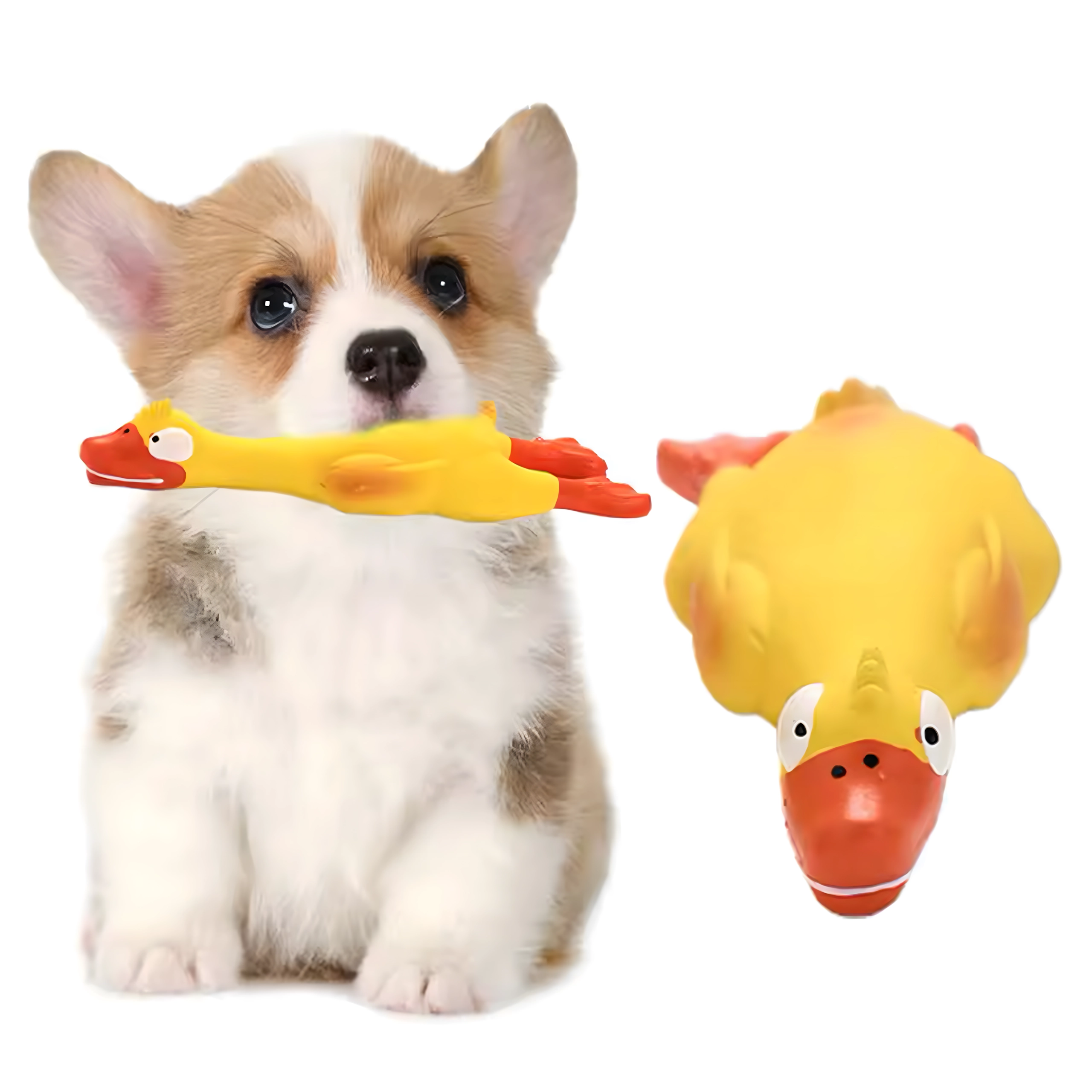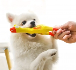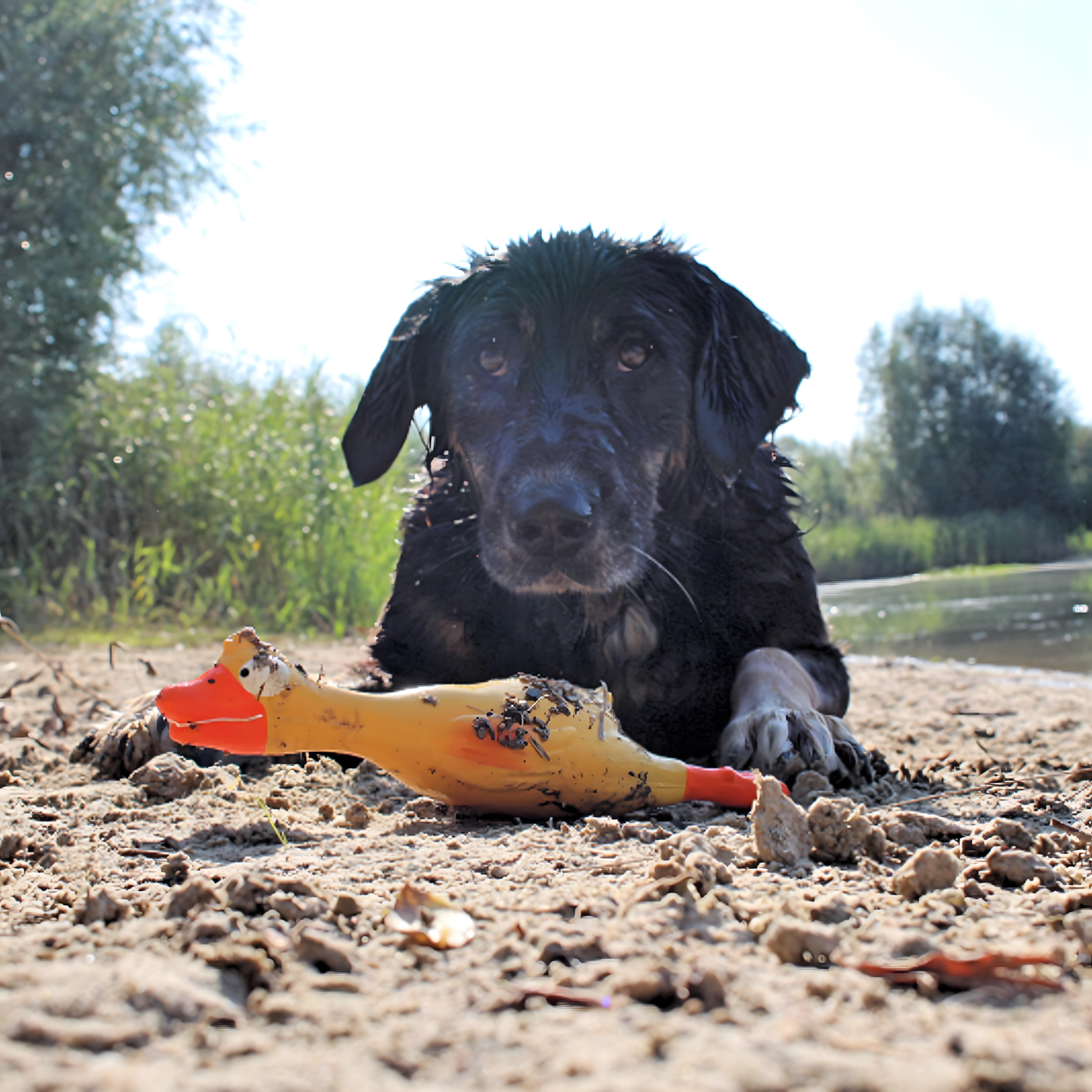 Zábavná pískací hračka ve tvaru kuřete o délce 22 cm pro psy všech velikostí. Odolná a pružná guma láká ke kousání, přetahování i aportování, při stisku píská a motivuje k aktivitě. Skvělá na vybití energie a proti nudě, vhodná i pro kočky.