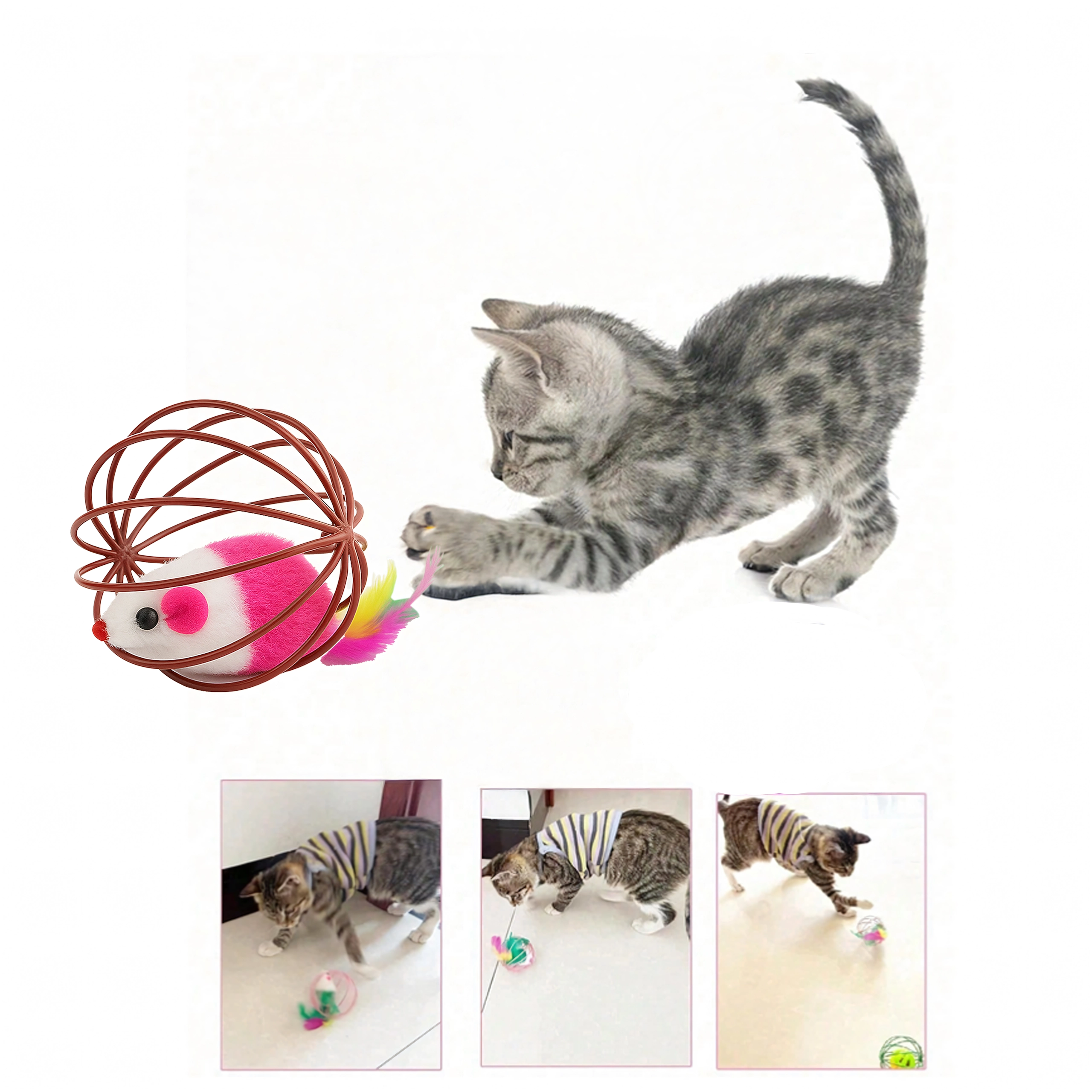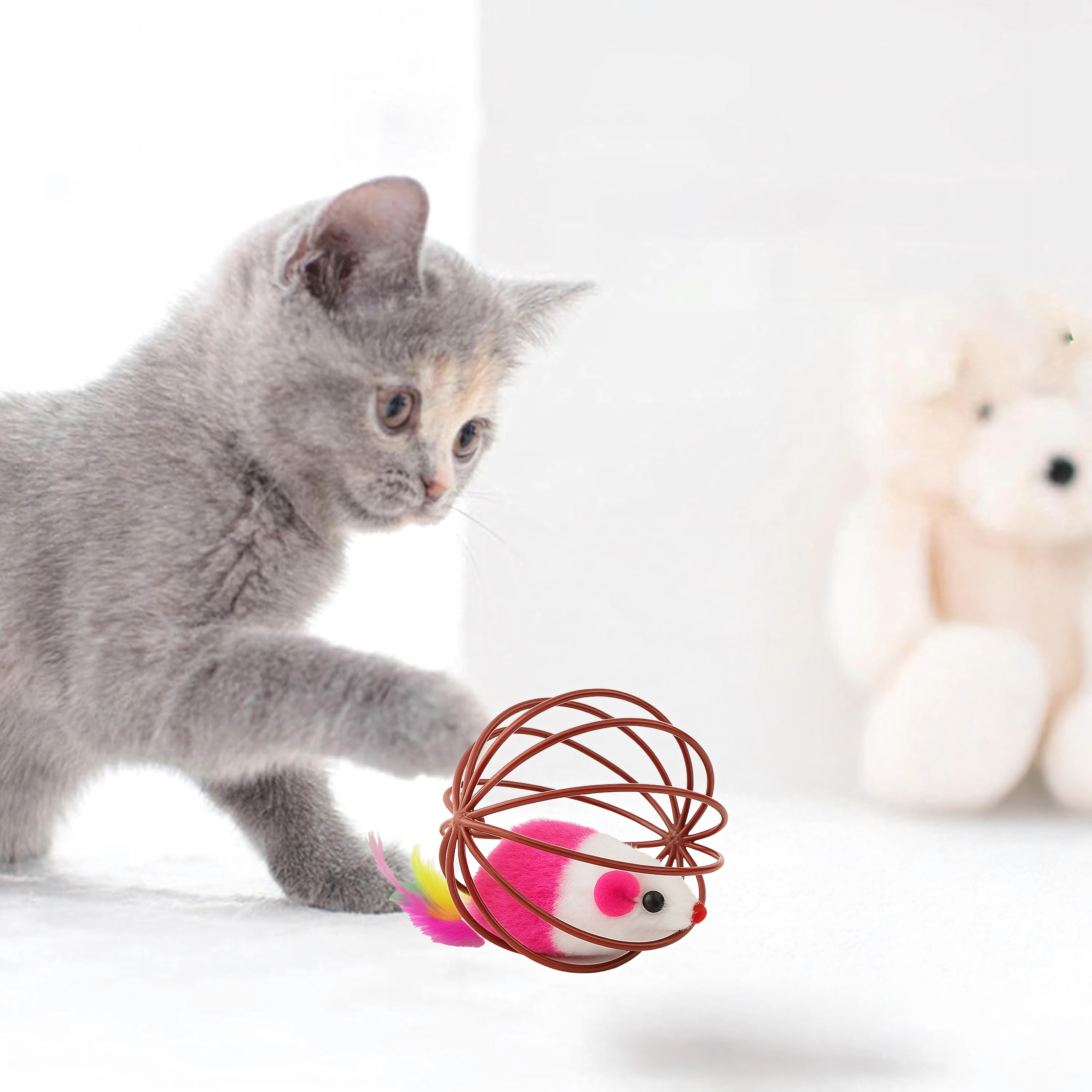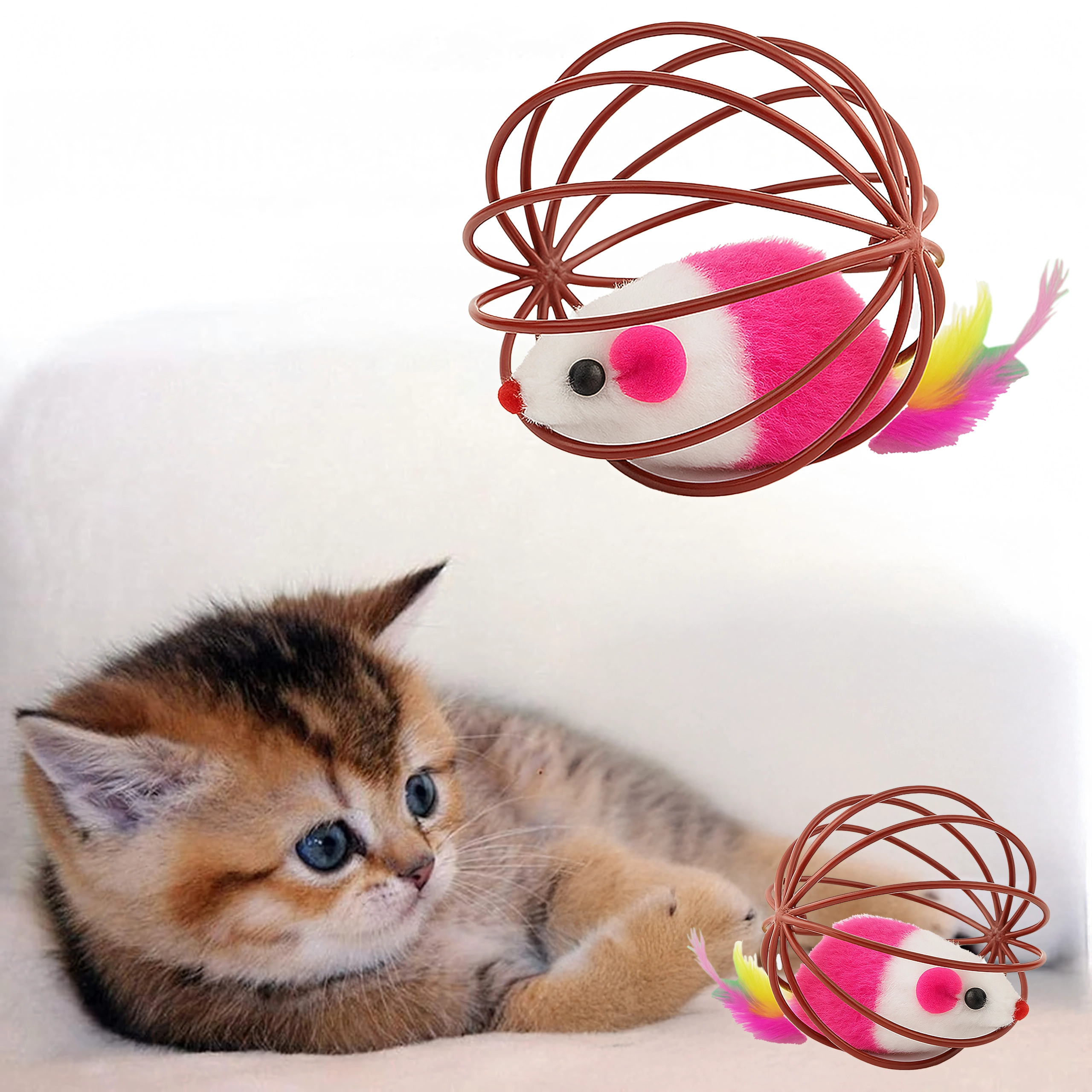 Tato chytrá hračka kombinuje lehkou drátěnou kouli, která se hladce kutálí po podlaze, s plyšovou myškou uvnitř. Při pohybu myška jemně chrastí a barevná pírka dále lákají kočku k pronásledování, tlapkování a lovu. Ideální pro koťata i dospělé kočky, které potřebují vybít energii a podpořit přirozené chování.