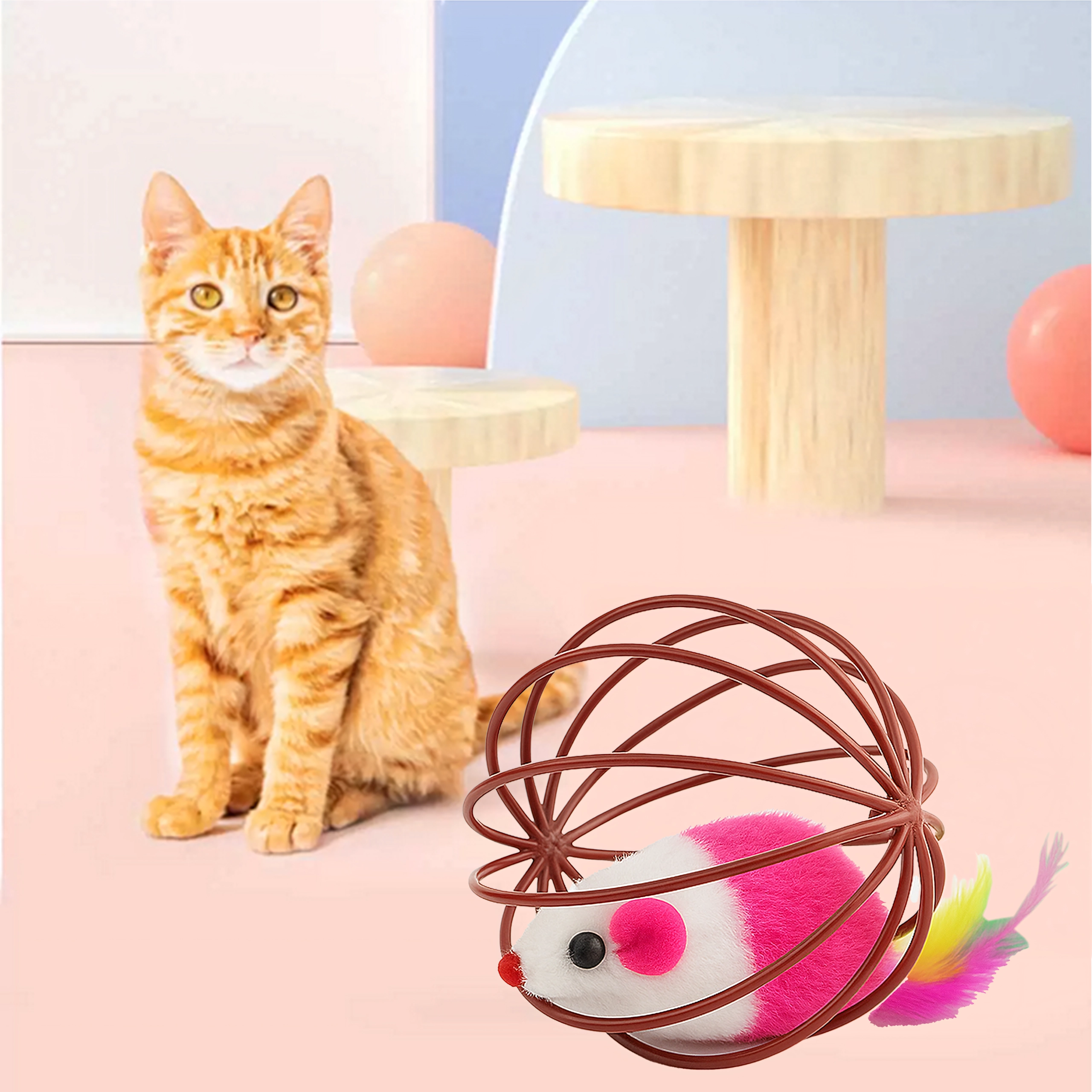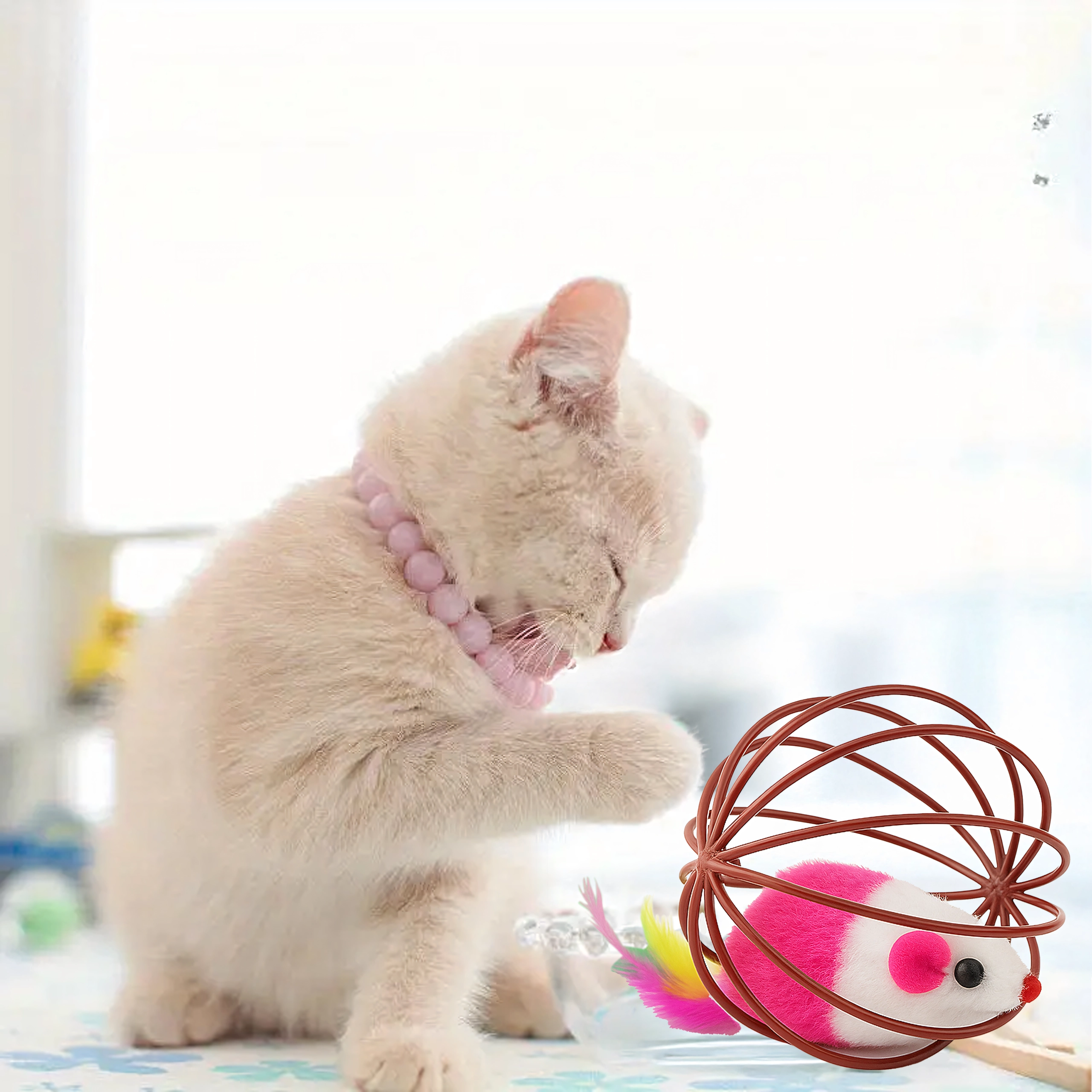 Pevný kovový/plastový drát drží tvar a chrání myšku uvnitř, zatímco lehká konstrukce je šetrná k podlaze i tlapkám vaší kočky.