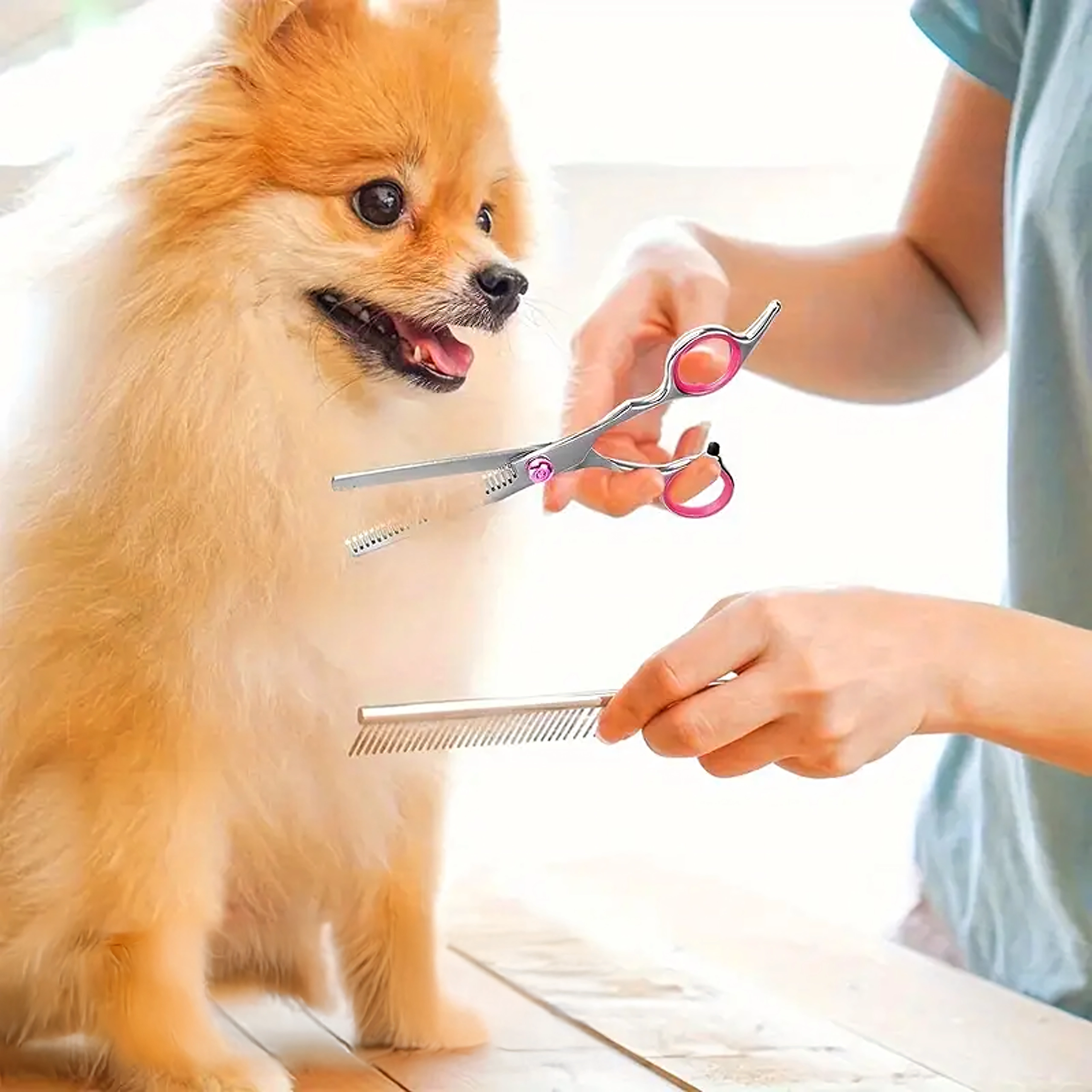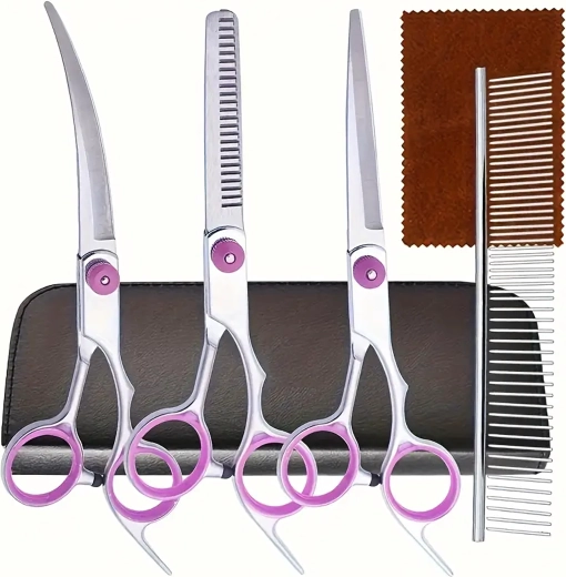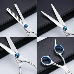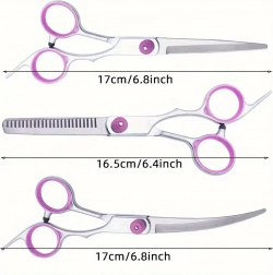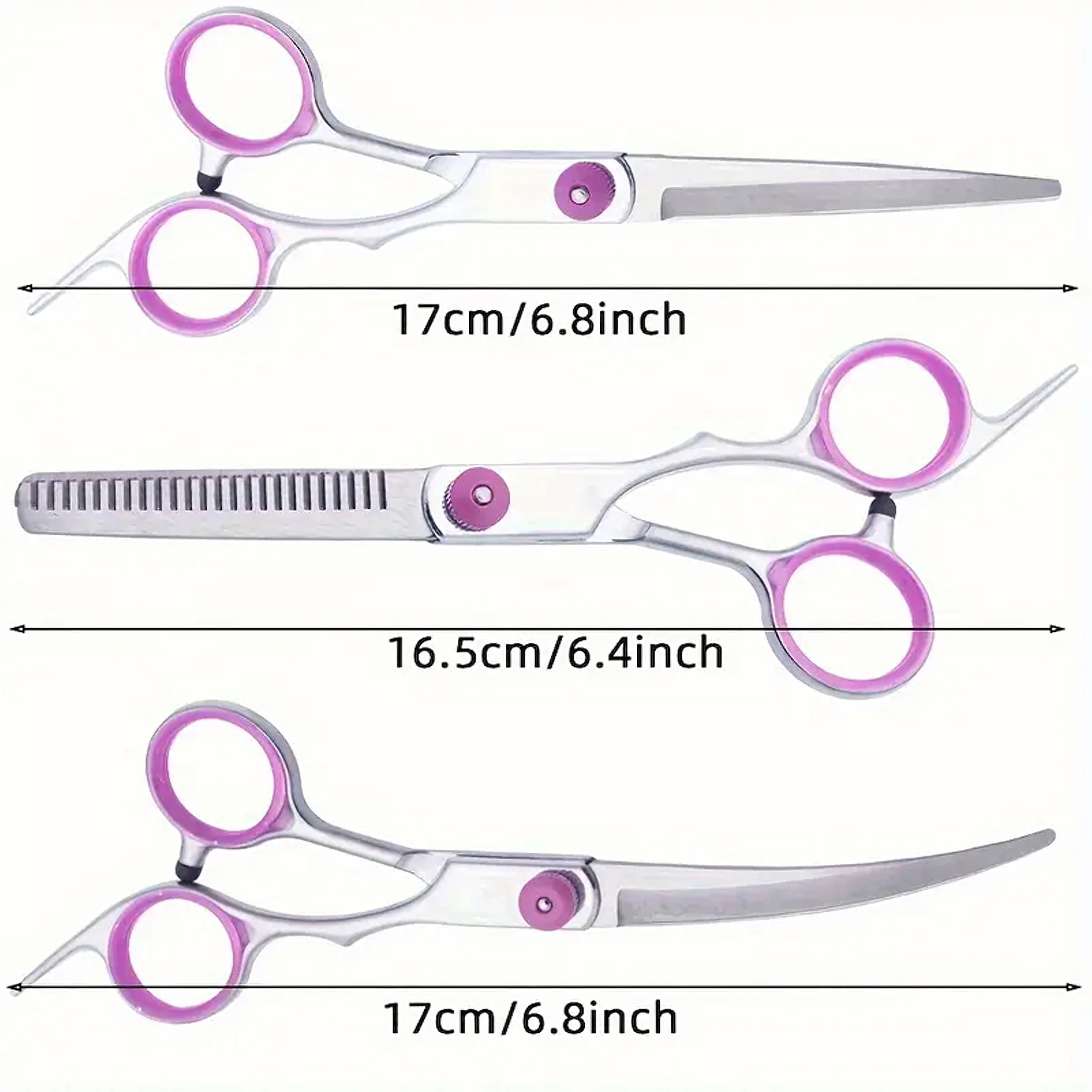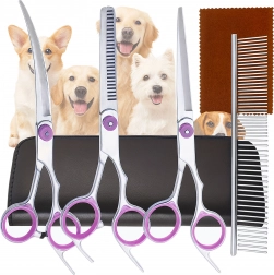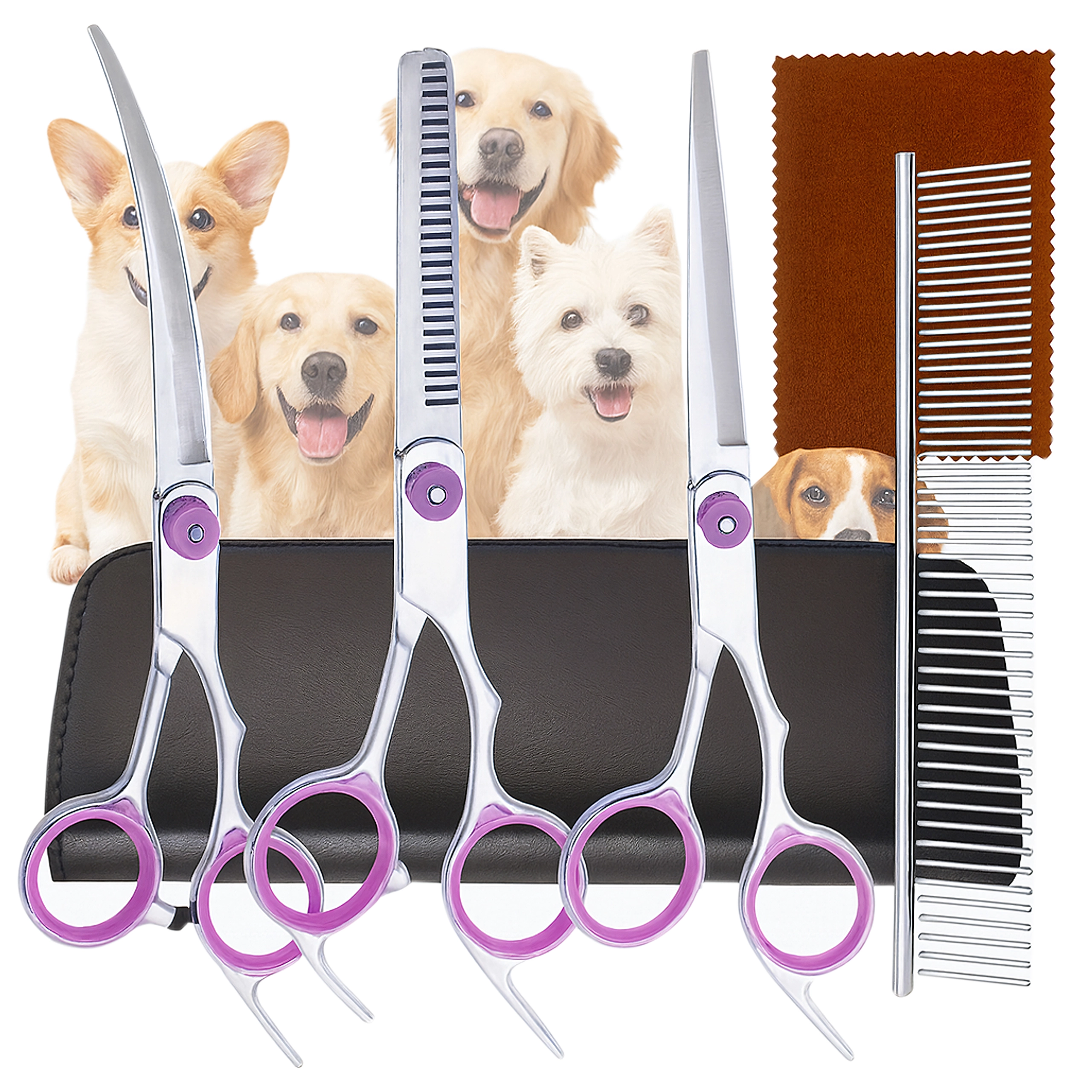 Tato univerzální groomingová sada je navržená pro přesné tvarování, ztenčování i dokončovací úpravy srsti psů a koček. Nerezová ocel zaručuje dlouhou životnost, čistý střih a snadnou údržbu. Díky ergonomickým kroužkům prstů a opěrkám je práce pohodlná i při delším používání.
