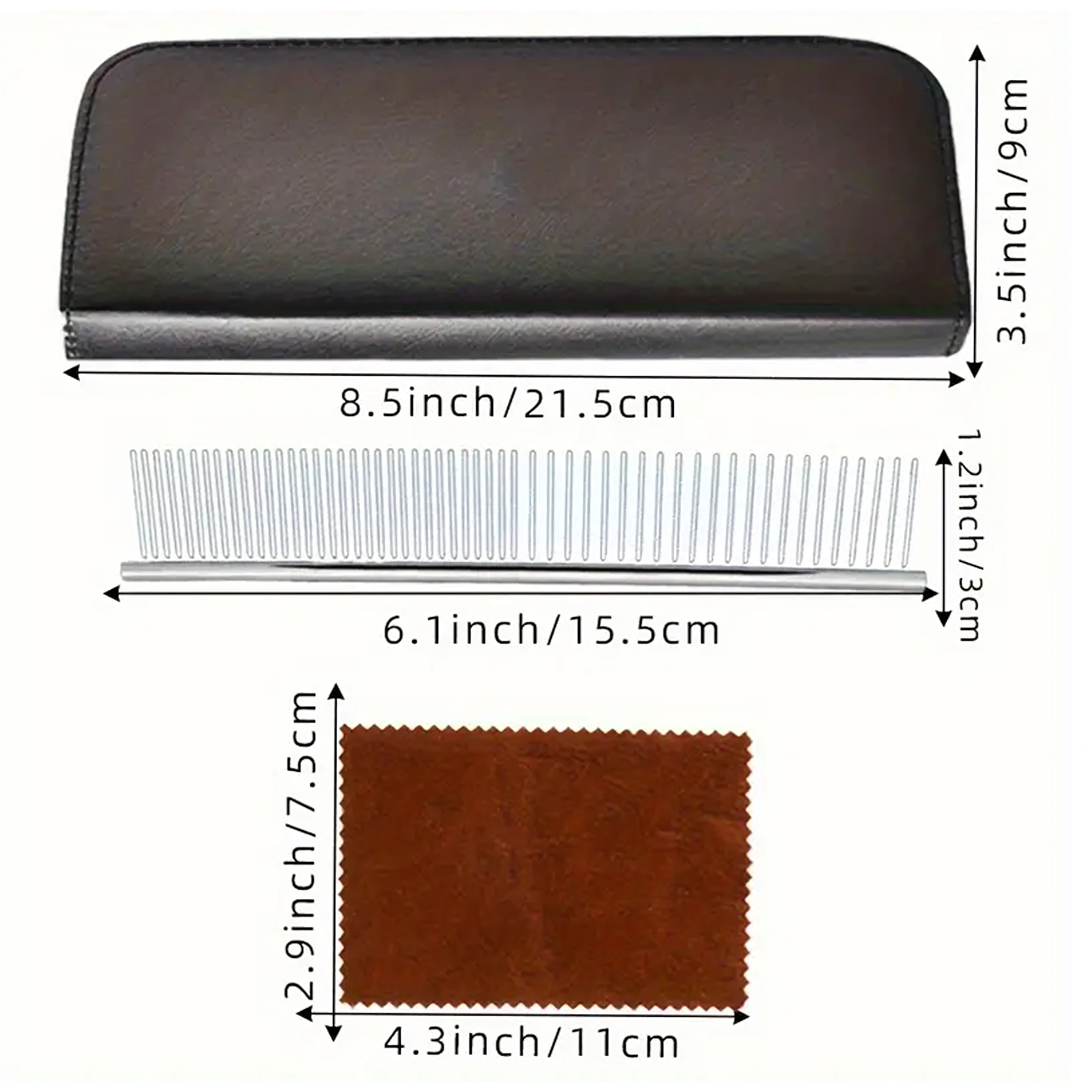 V sadě najdete vše, co potřebujete pro kompletní péči o srst: rovné nůžky pro přesné linie, zahnuté nůžky pro bezpečné tvarování kolem tlapek, uší a obličeje, efilační nůžky pro zjemnění přechodů a jemný kovový hřeben na rozčesání a finiš.