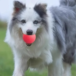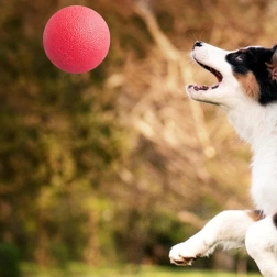 Míček je vyroben z plné, tvrdé gumy, která lépe odolává kousání a drsným podmínkám při hře, doma i venku.