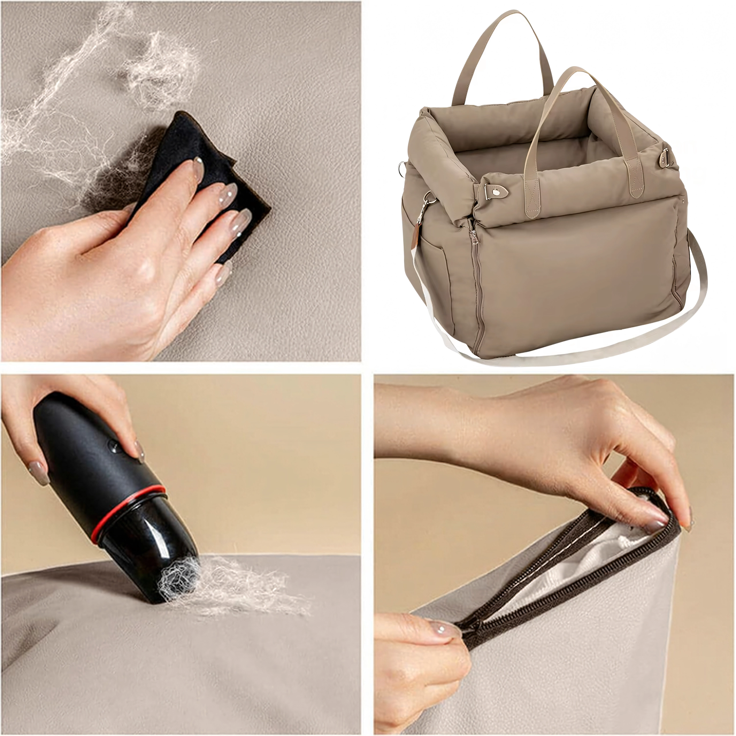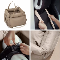 Díky odnímatelnému, pratelnému potahu a odolné tkanině je údržba snadná. Protiskluzové dno brání posouvání, bezpečnostní vnitřní karabina drží postroj, a praktické kapsy pojmou drobnosti na cesty. Pelíšek lze použít i mimo auto jako útulné lůžko.