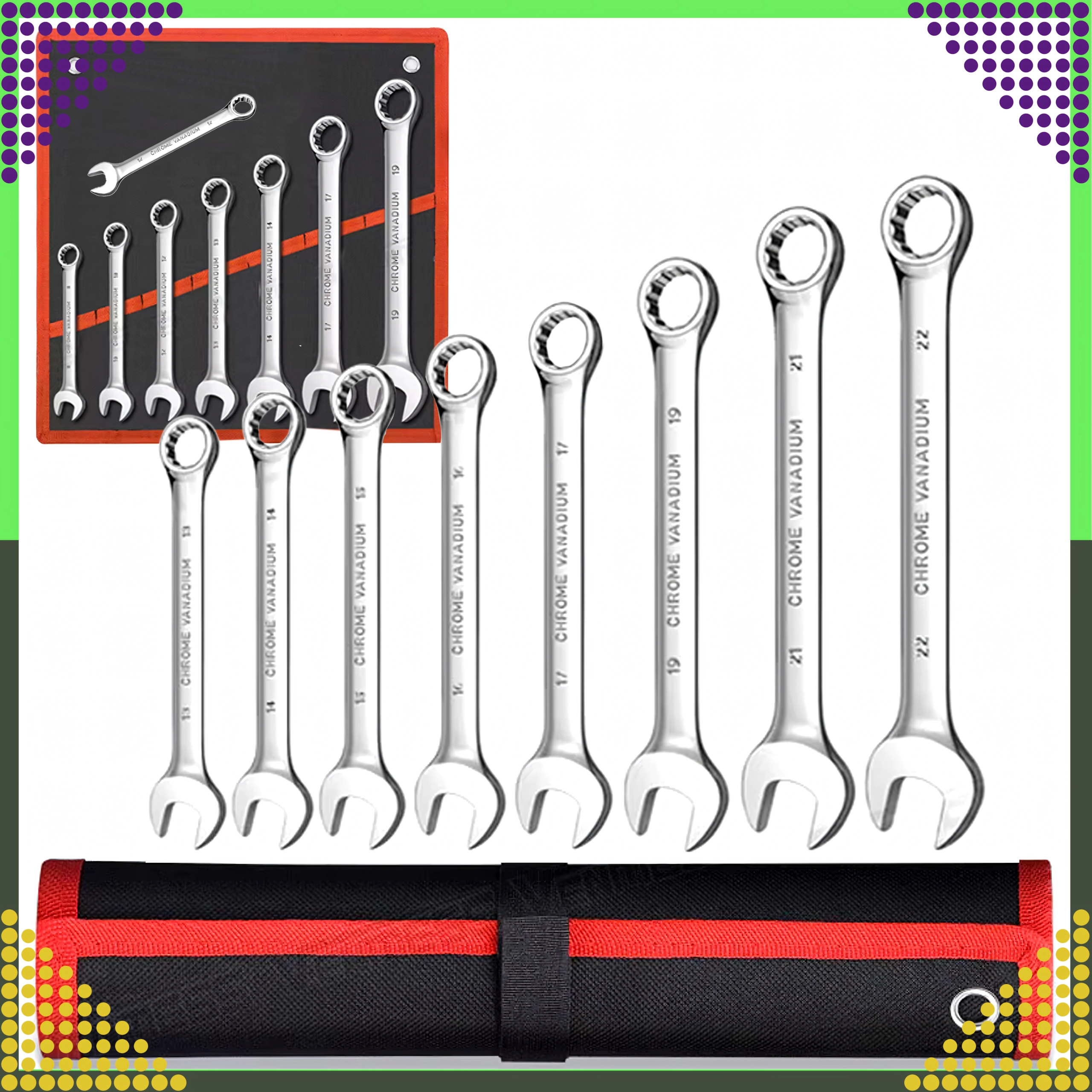 Tato profesionální sada kombinuje plochý klíč a ráčnové očko v jednom nástroji, takže zvládnete utahování i povolování šroubů efektivně a pohodlně. Kvalitní chrom-vanadová ocel (CrV) zajišťuje vysokou pevnost, dlouhou životnost a odolnost proti korozi.