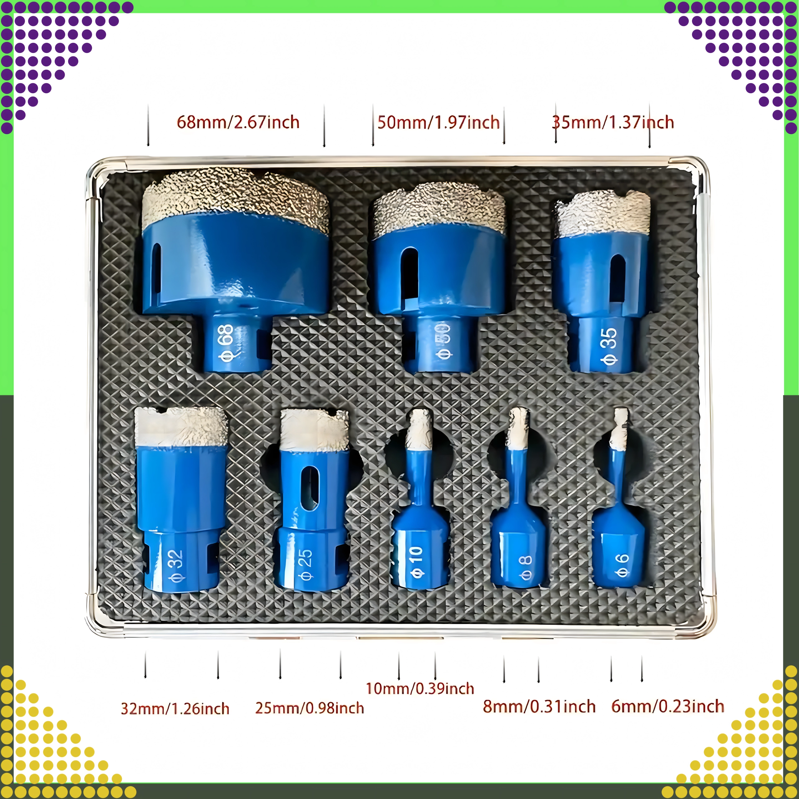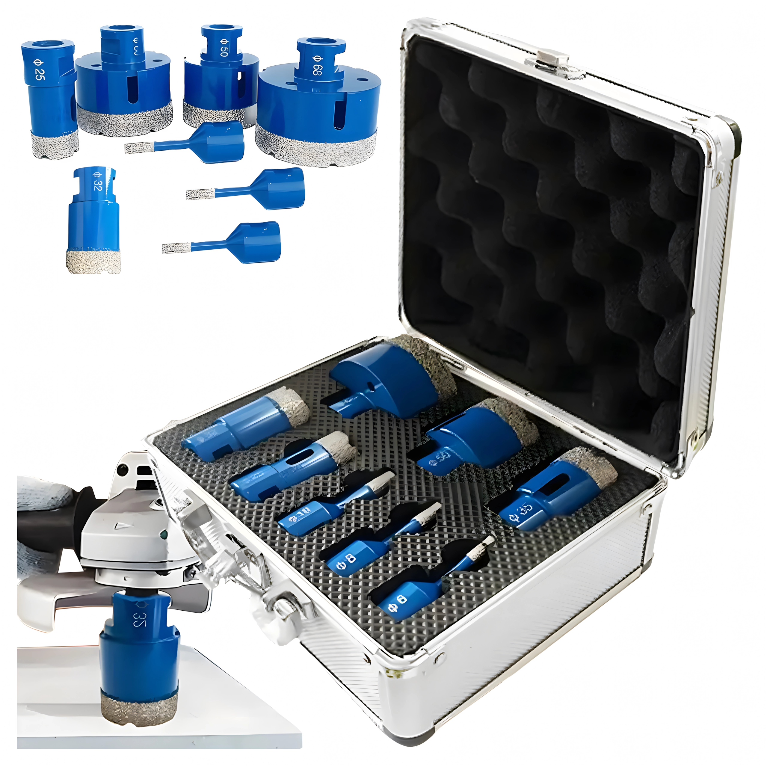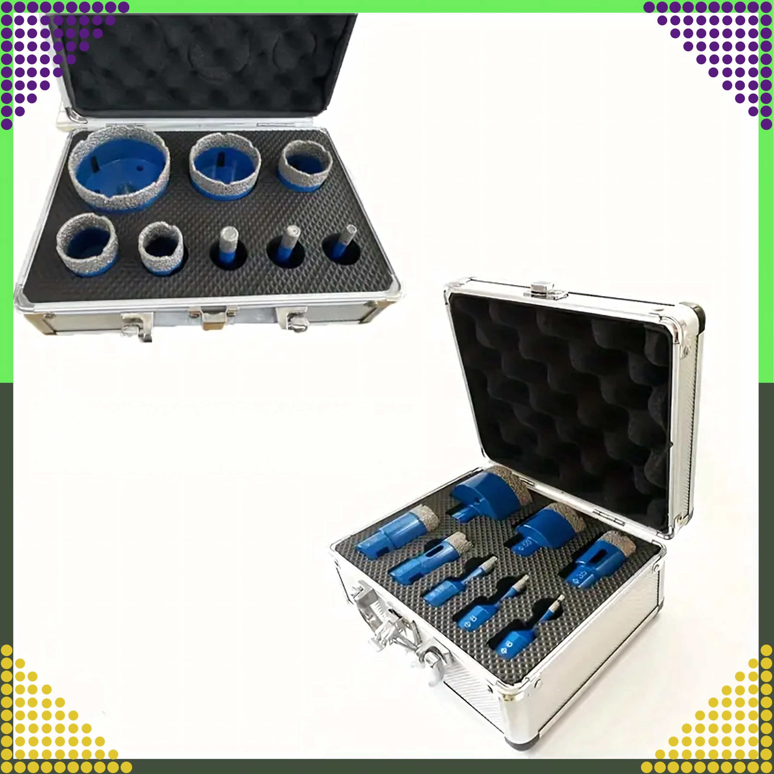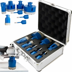 Univerzální sada diamantových korunek pro přesné vrtání do gresu, dlaždic, betonu, cihel i žuly. Obsahuje 8 velikostí (6, 8, 10, 25, 32, 35, 50, 68 mm) pro široké použití. Odolná diamantová vrstva zajišťuje dlouhou životnost a hladké hrany otvorů. Vše je uloženo v praktickém hliníkovém kufru pro bezpečné přenášení a skladování.