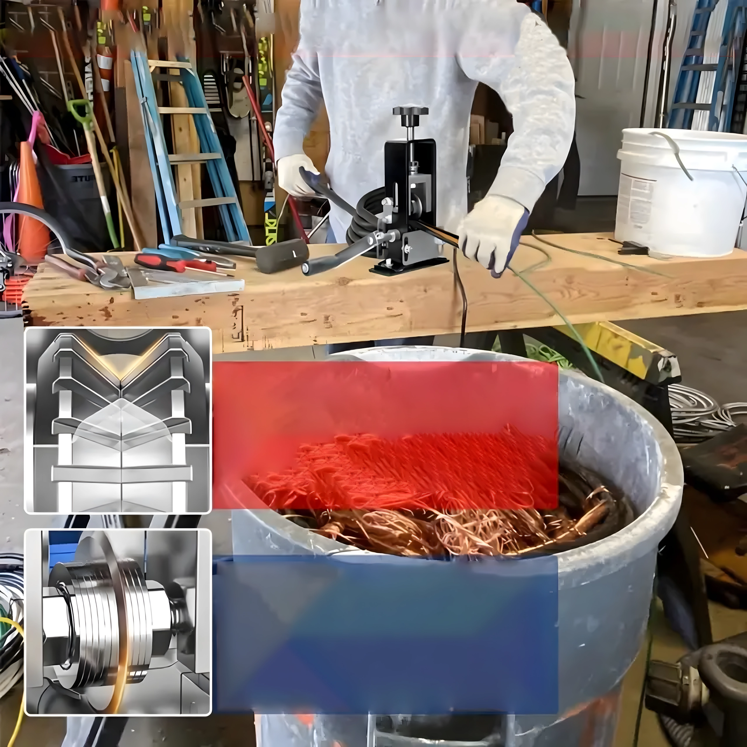 Díky ruční klice máte plnou kontrolu nad rychlostí a tlakem, což zvyšuje bezpečnost práce a kvalitu výsledku. Zařízení je vhodné pro recyklaci kabelů, elektroinstalační práce i servisní dílny, kde je důležitá rychlost a opakovatelnost.
