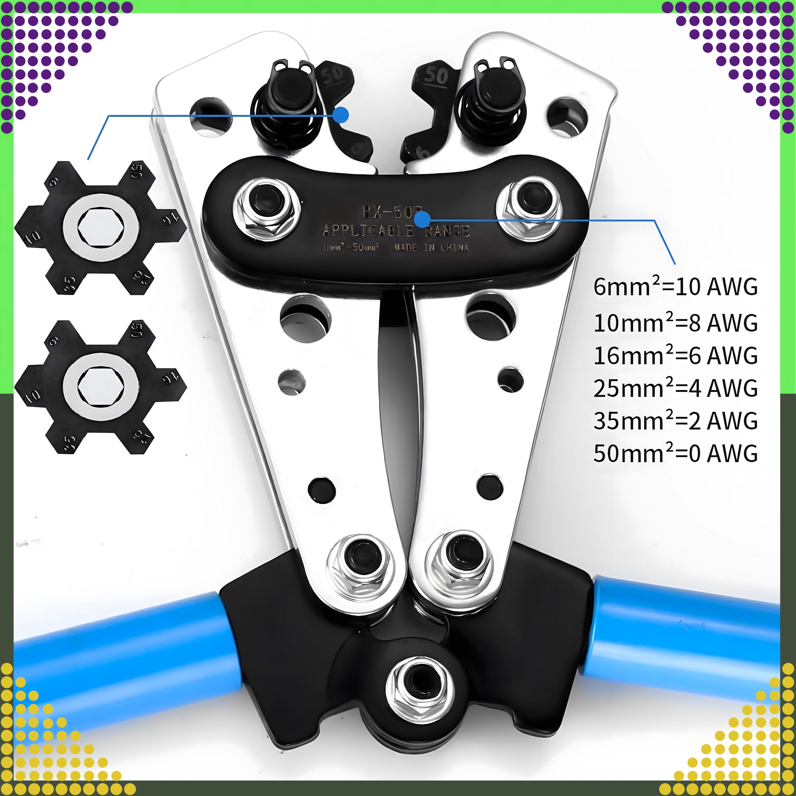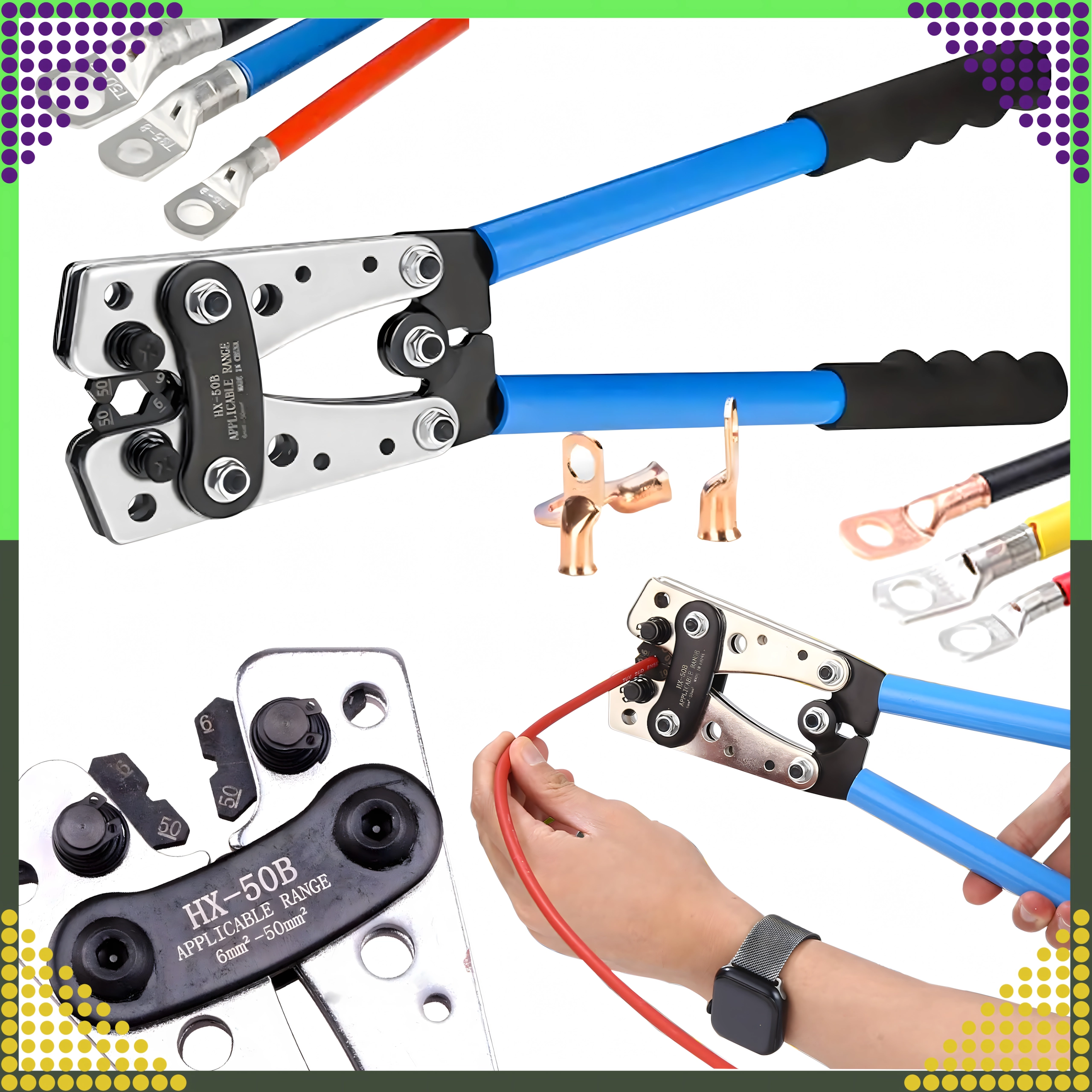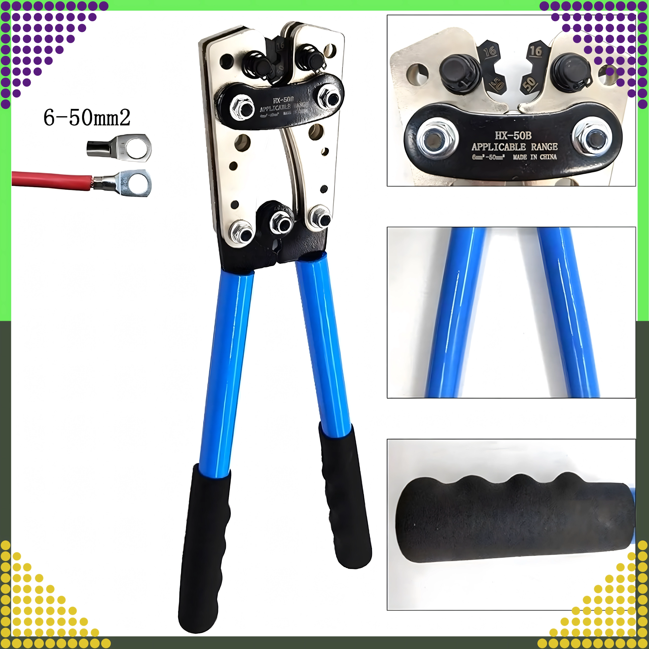 Tento robustní lis na koncovky a dutinky je navržen pro precizní práci s elektrickými vodiči v rozsahu 6–50 mm². Šestihranná krimpovací matrice zajišťuje stabilní, mechanicky odolný a vodivý spoj. Díky pákovému převodu a délce 390 mm dosáhnete vysoké lisovací síly s menší námahou.