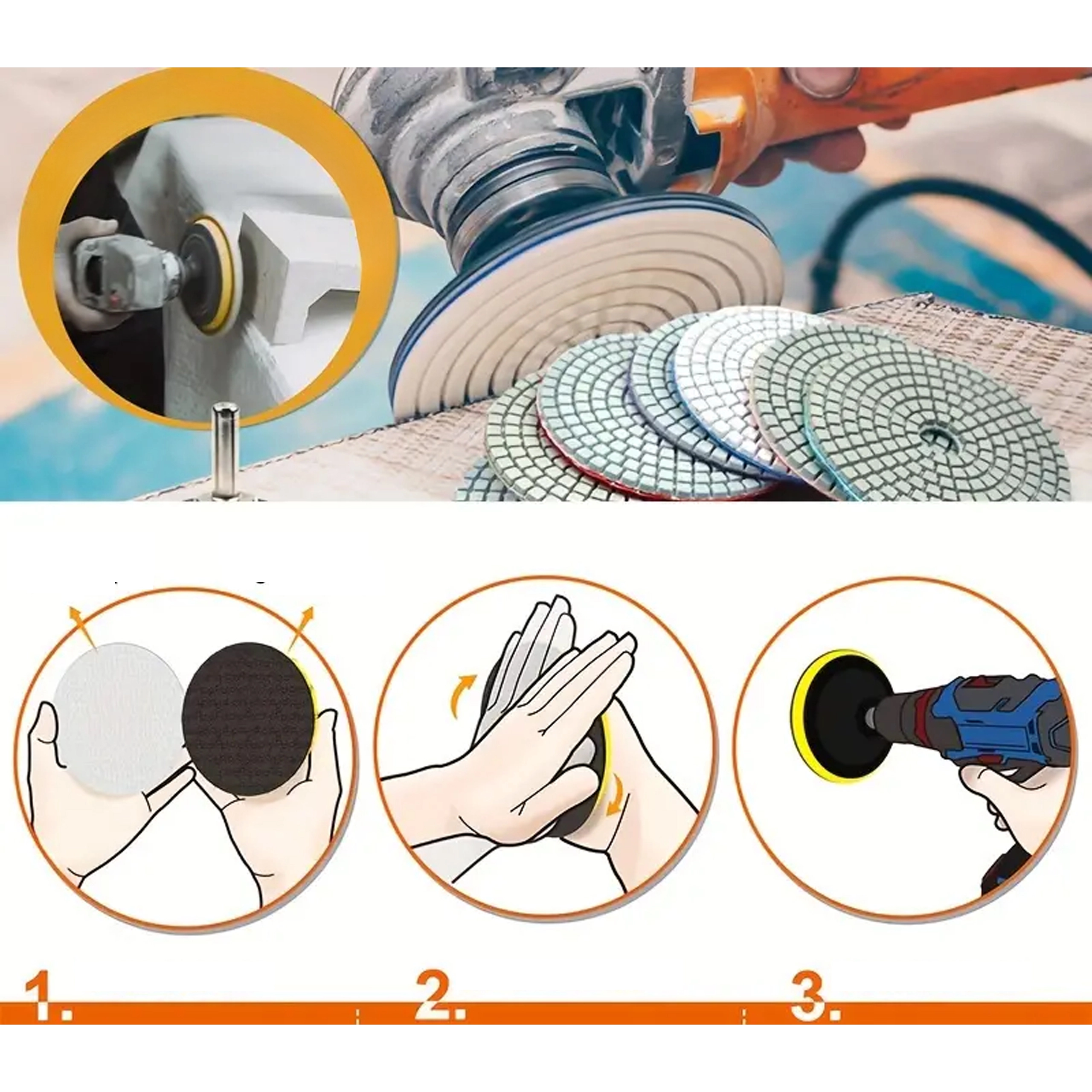 Díky rychloupínání na suchý zip kotouče snadno vyměníte přímo na pracovišti. Jsou vhodné pro použití s úhlovou bruskou nebo leštičkou s opěrnou podložkou, a to při opracování hran, ploch i detailů na gresu, keramice, mramoru, žule i betonu.