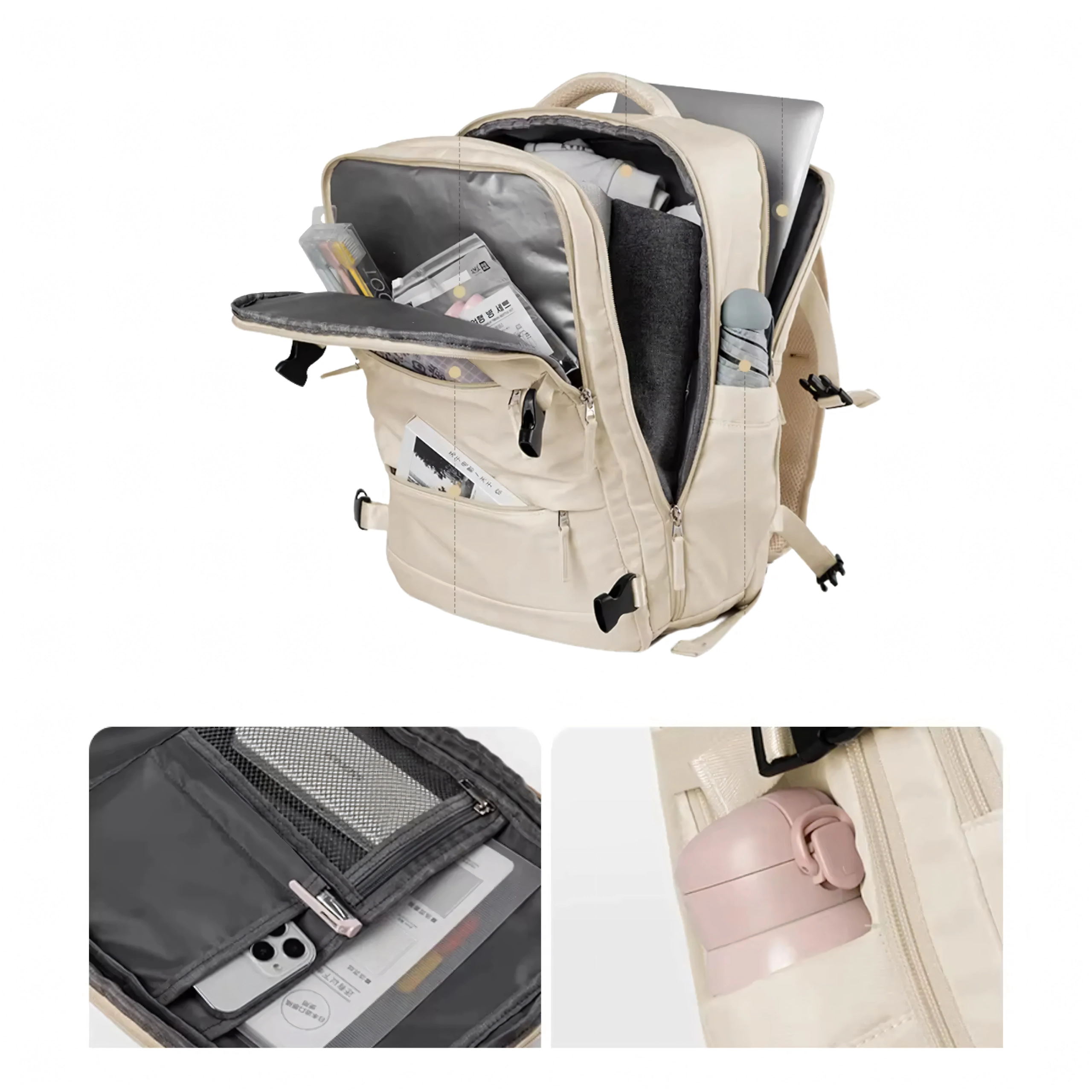 - Organizace na cestách: více kapes, 180° otevírání, kapsa na obuv, kapsa na notebook