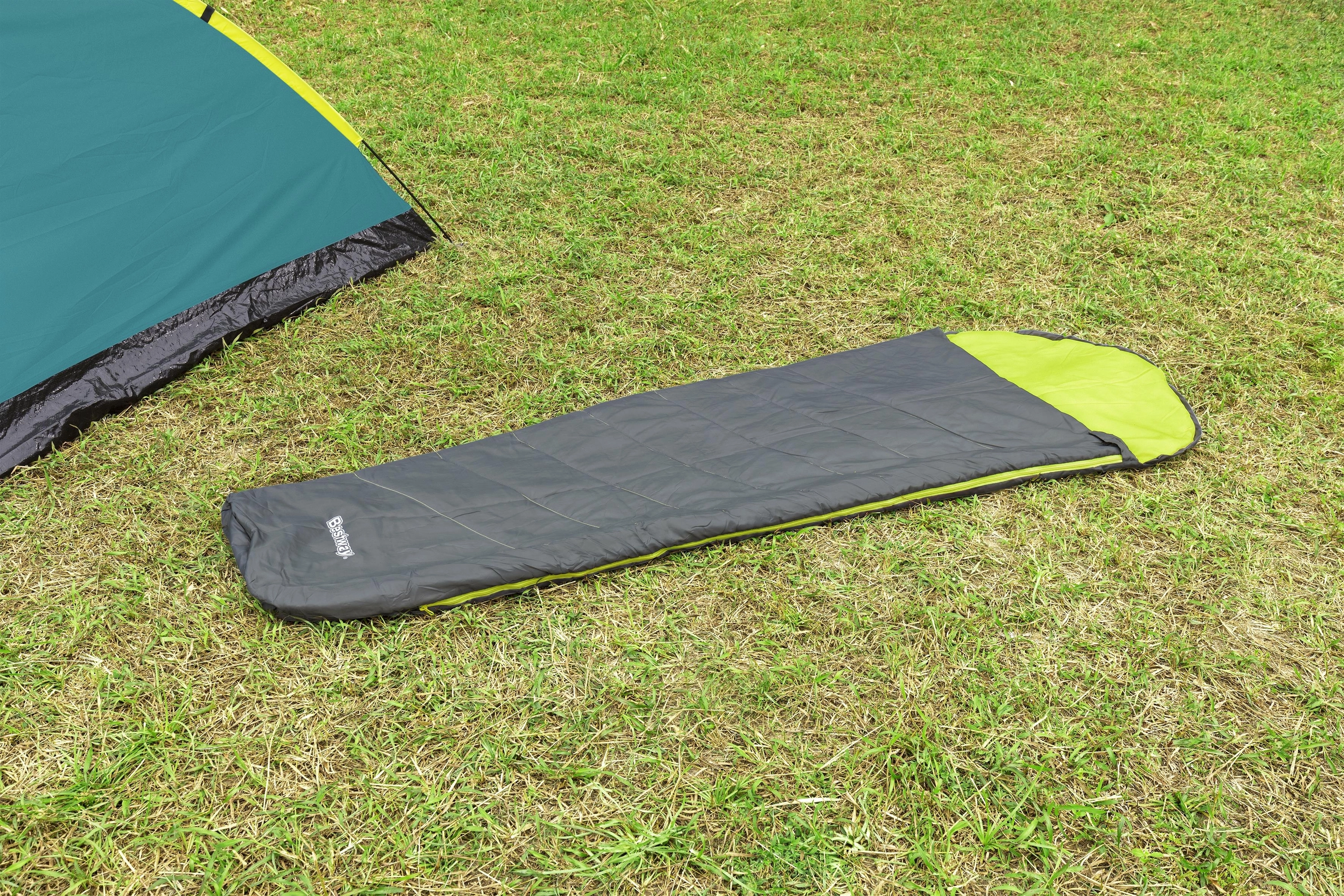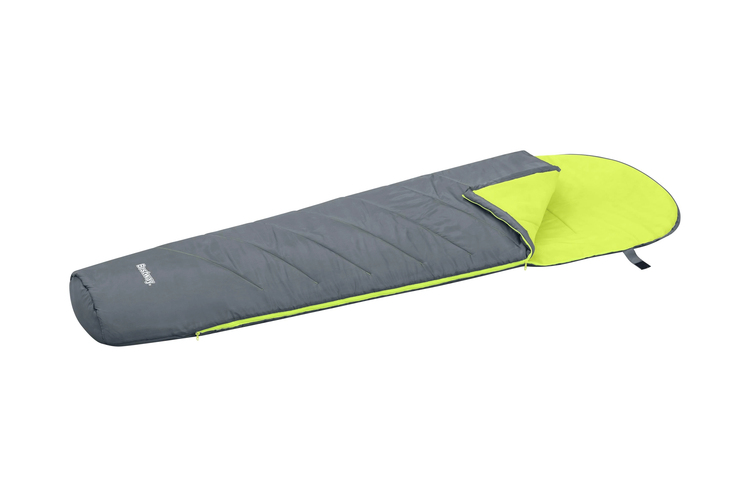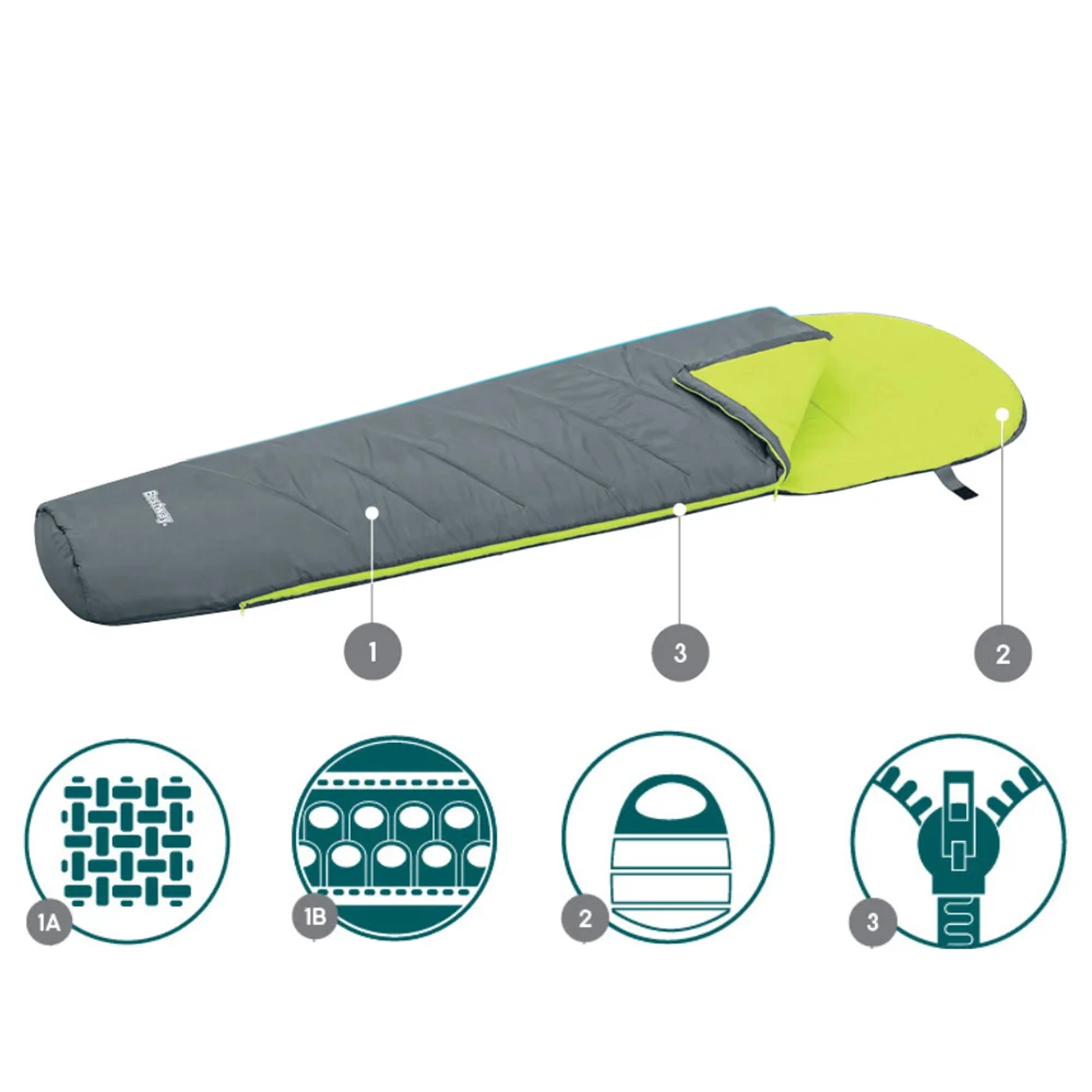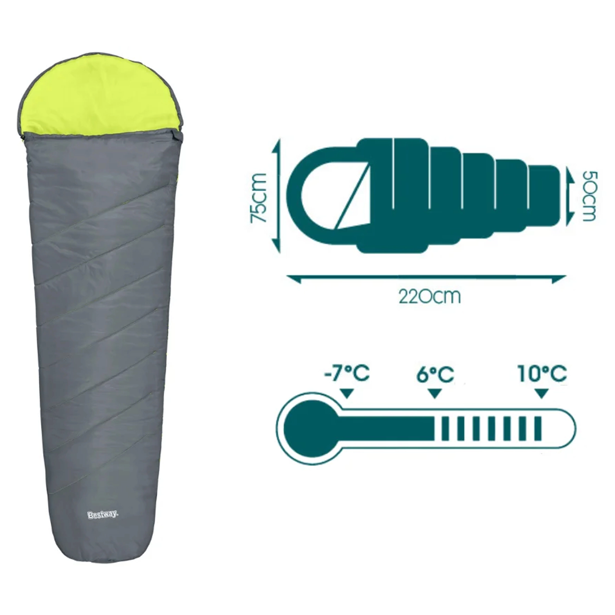 Užijte si klidný spánek v přírodě se spacím pytlem Bestway typu mumie, který kombinuje nízkou hmotnost, odolné materiály a spolehlivou tepelnou izolaci. Polokruhová kapuce chrání hlavu a krk před chladem, zatímco pevný vnější materiál z polyesteru 170T odolá vlhkosti i opotřebení.