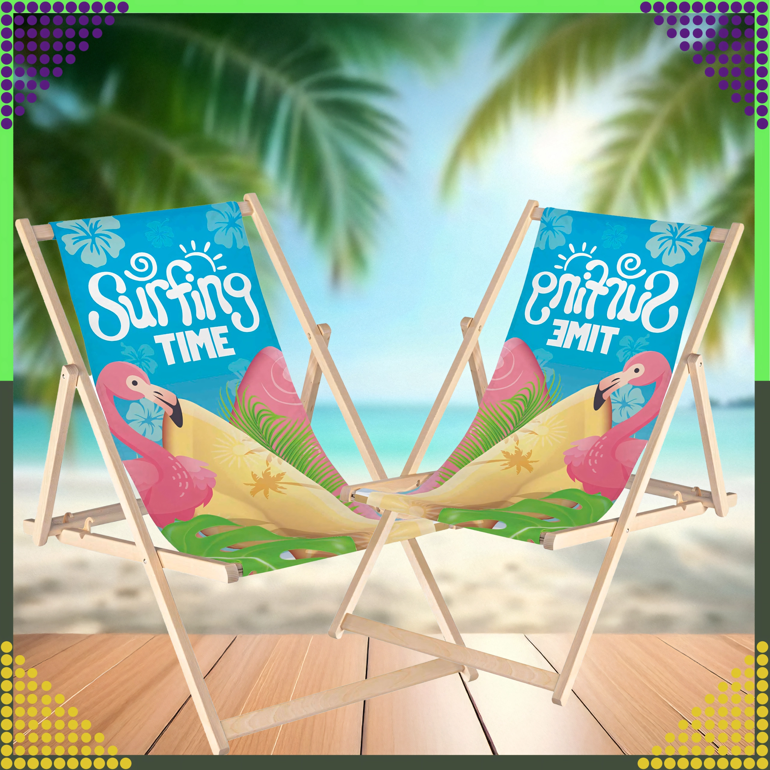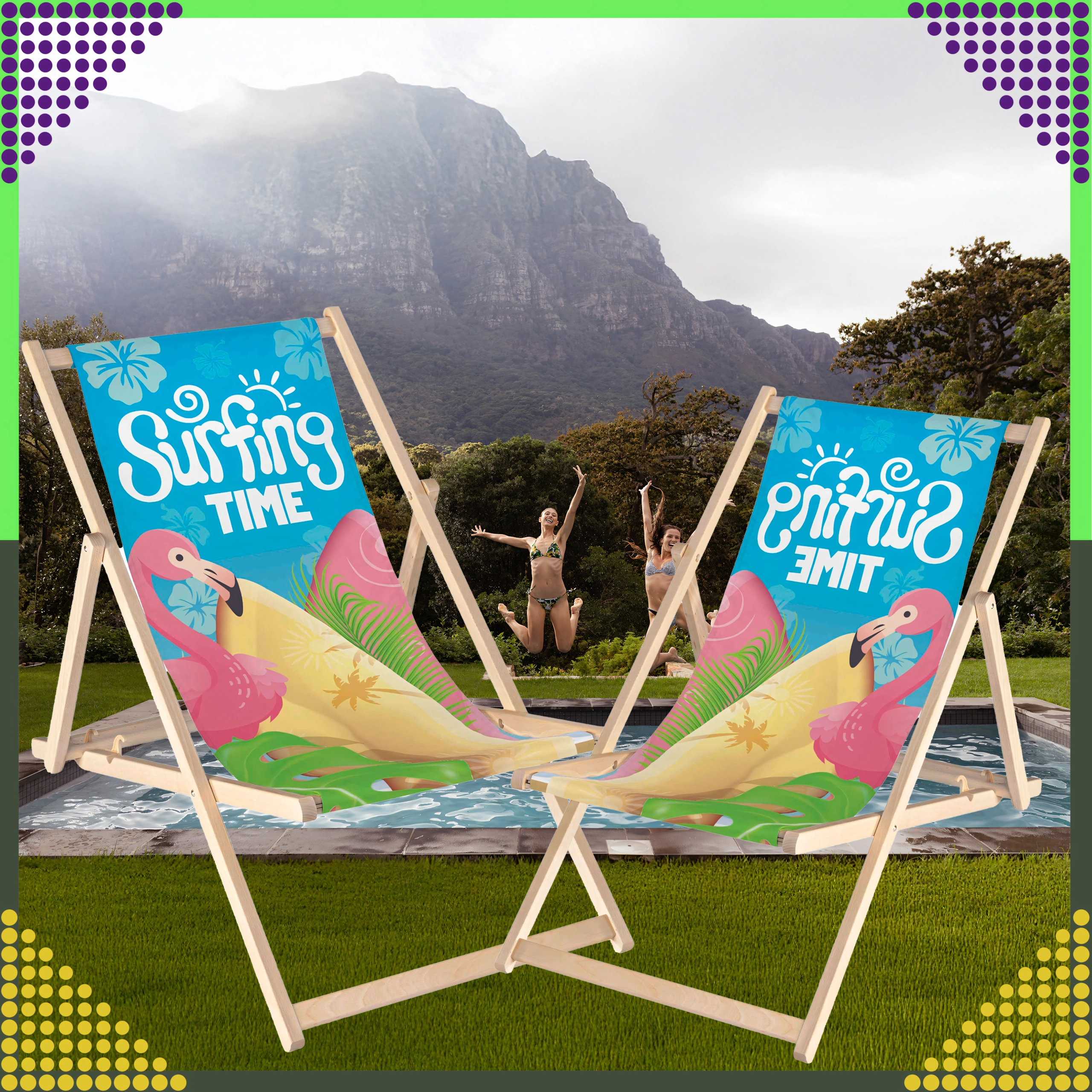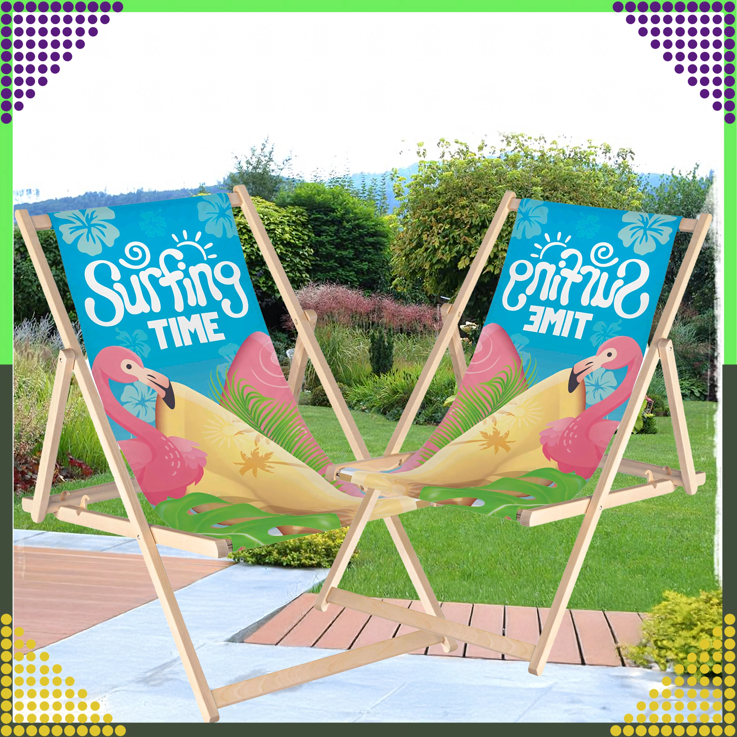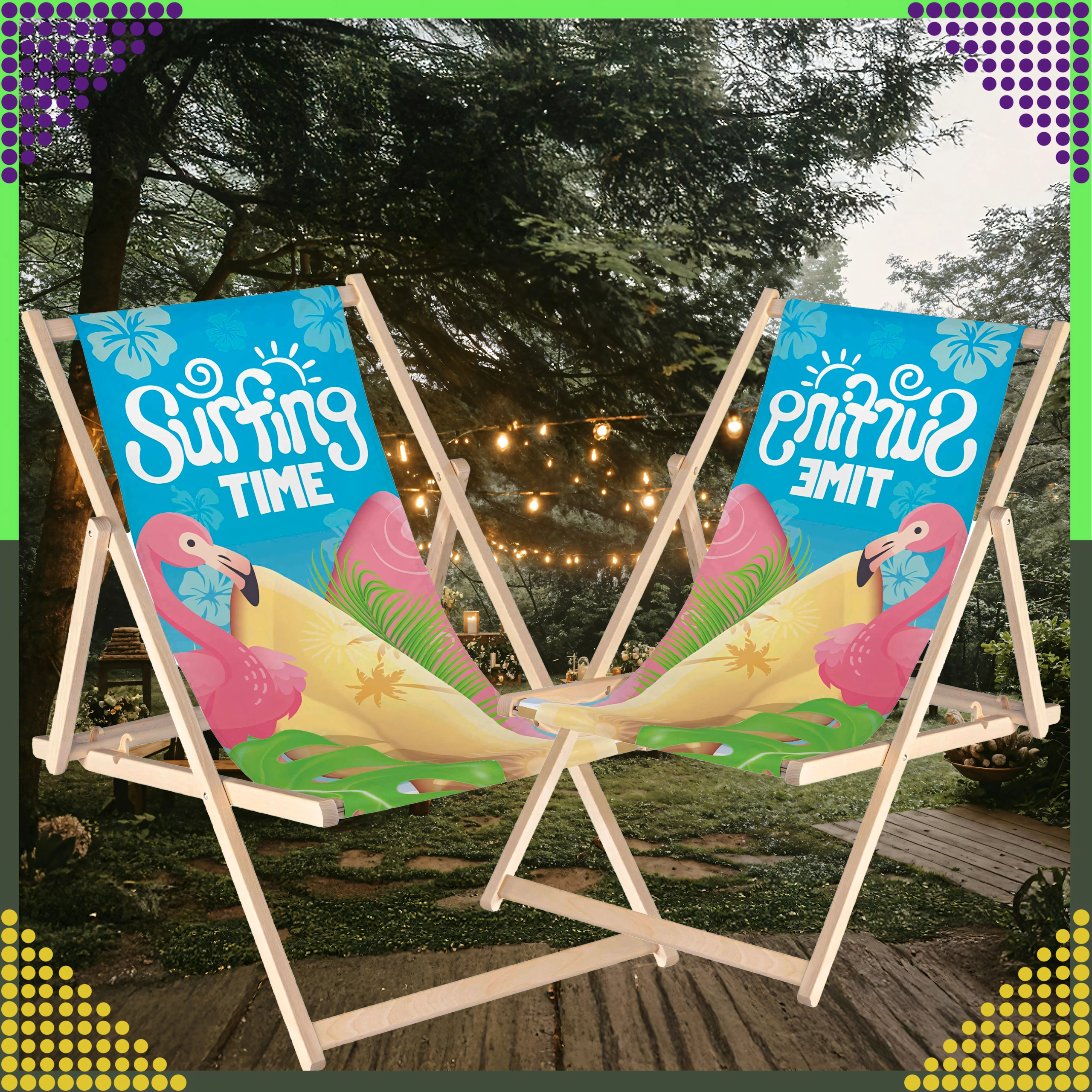 Sada dvou skládacích lehátek kombinuje přírodní dřevo s odolnou plátěnou tkaninou a barevným potiskem flaminga „Surfing Time“. Díky vícepolohovému mechanismu si snadno nastavíte komfortní úhel sezení či ležení. Lehká konstrukce umožňuje snadné přenášení a skladování doma i na cestách.