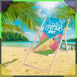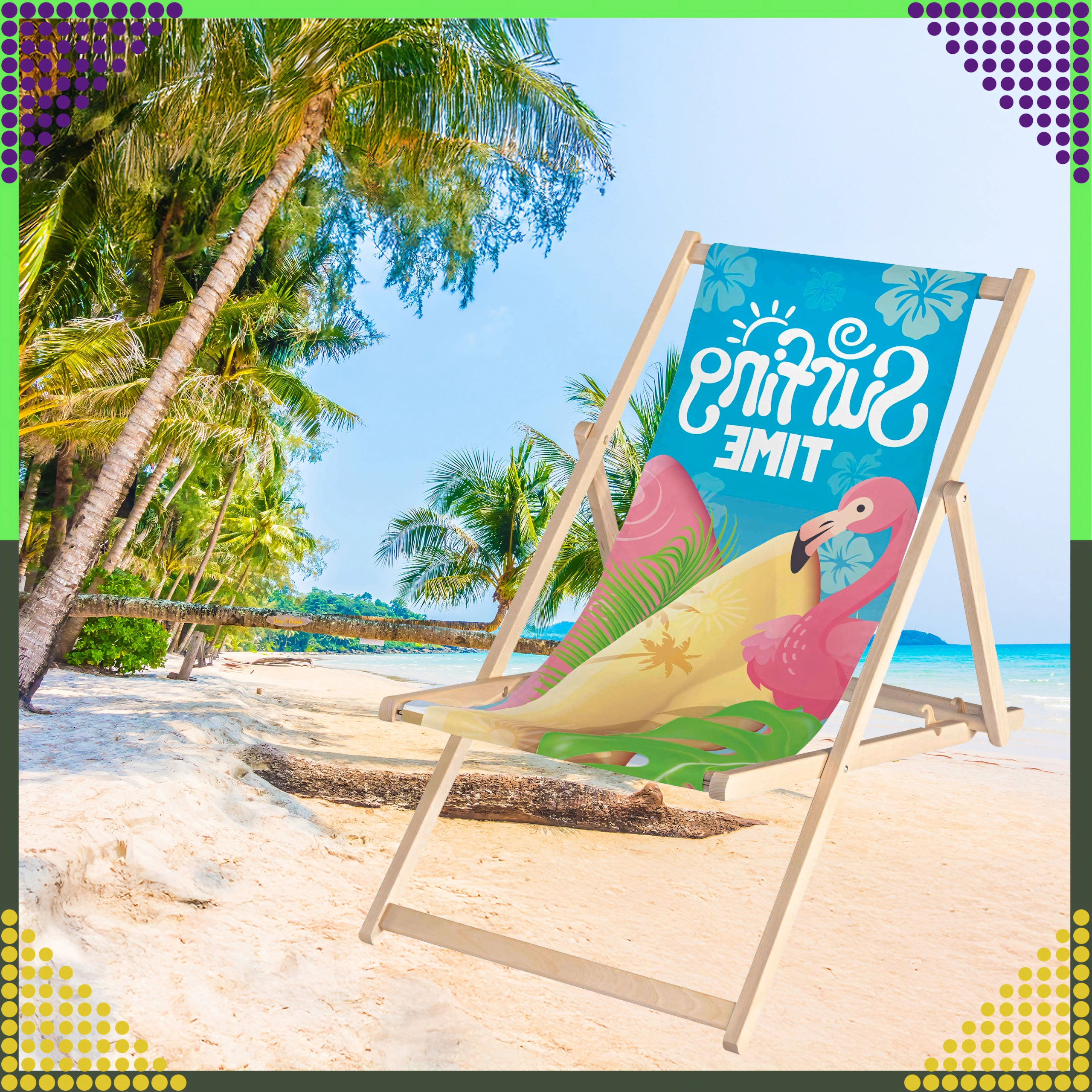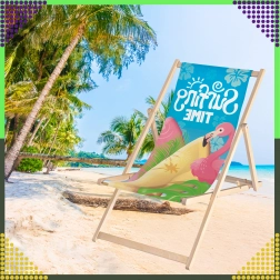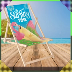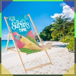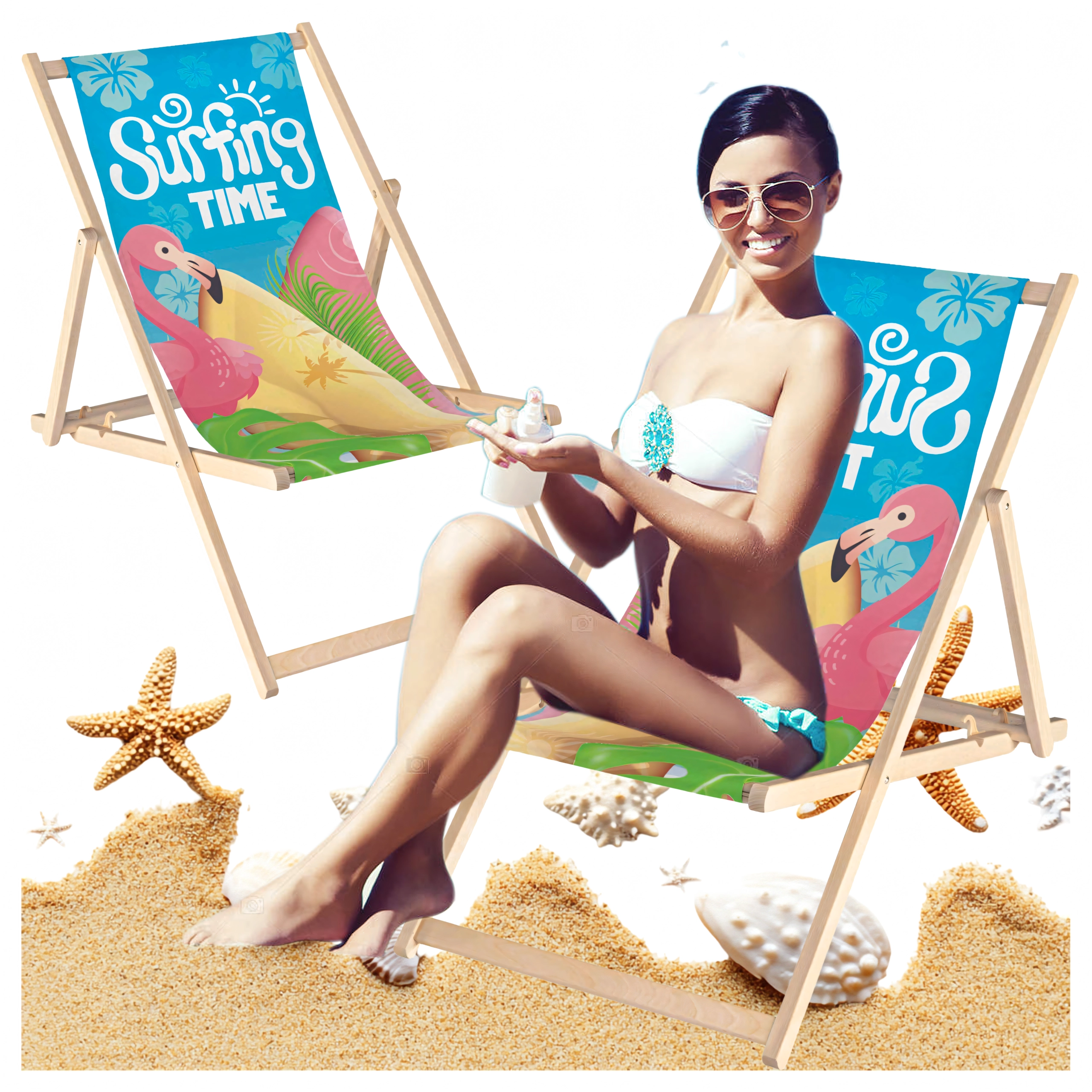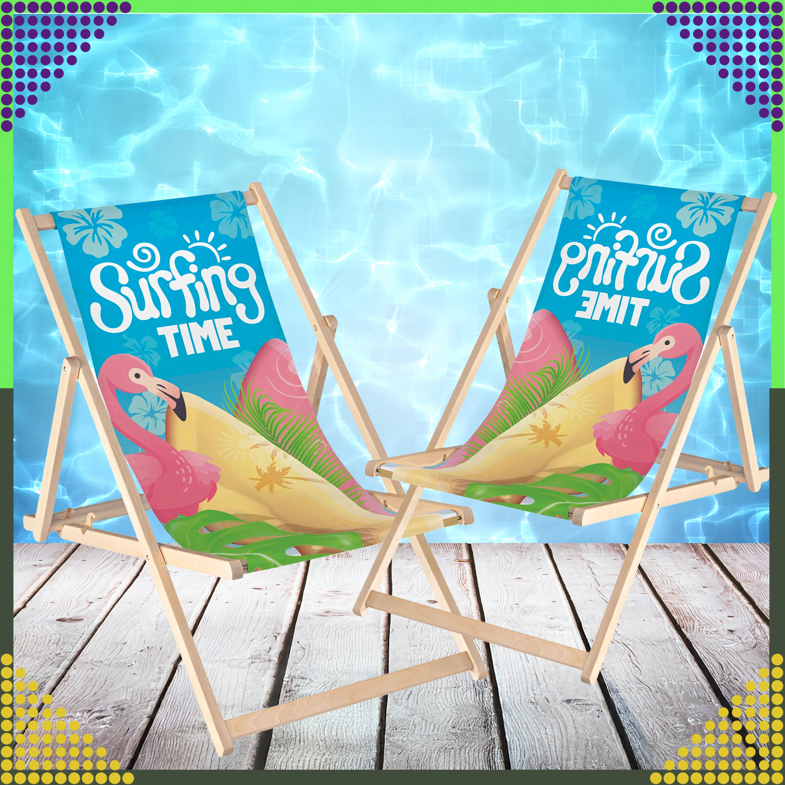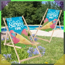 Sada dvou skládacích lehátek kombinuje přírodní dřevo s odolnou plátěnou tkaninou a barevným potiskem flaminga „Surfing Time“. Díky vícepolohovému mechanismu si snadno nastavíte komfortní úhel sezení či ležení. Lehká konstrukce umožňuje snadné přenášení a skladování doma i na cestách.