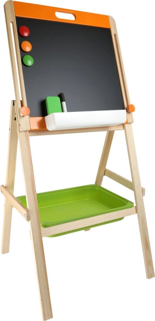 Stabilní dřevěná konstrukce s distančními podložkami zajišťuje bezpečné psaní bez viklání a praktický zelený úložný box udrží křídy, fix a magnety vždy po ruce. Tabule podporuje aktivní hraní, rozvoj motoriky, fantazie i základů abecedy a počítání.