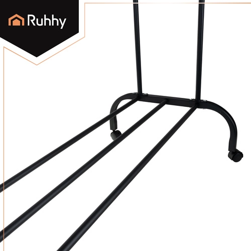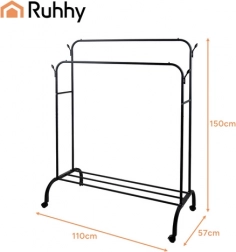 Hledáte praktické a prostorově úsporné řešení pro oblečení, boty i doplňky? Stojan RUHHY se dvěma tyčemi poskytne dost místa pro košile, kabáty i šaty bez pomačkání. Otočná kolečka s 360° chodem a brzdou zajistí snadné přemístění i jistotu stability, zatímco spodní police unese několik párů bot či úložné boxy.
