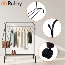 Už žádný chaos v předsíni či šatně. Pojízdný stojan na oblečení RUHHY nabízí dva pevné závěsné drážky, spodní polici na boty a boční háčky pro doplňky. Díky otočným kolečkům s brzdou ho snadno přesunete, zatímco stabilní železná konstrukce udrží vše na svém místě.