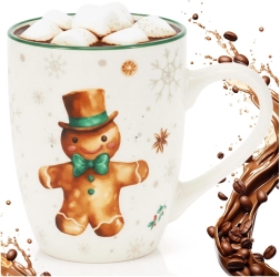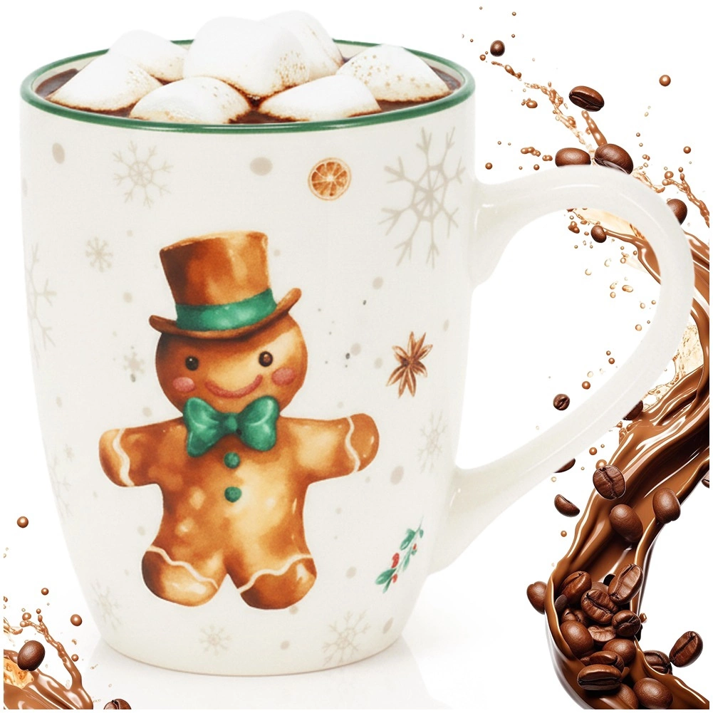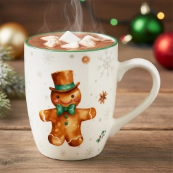 Užijte si zimní pohodu s tímto porcelánovým hrnkem s motivem perníčkového panáčka. Má objem 320 ml, pohodlné ucho pro snadné držení a elegantní zelený okraj. Je vhodný do myčky i mikrovlnky a skvěle se hodí na kávu, čaj i horkou čokoládu.