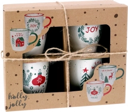 Stylová sada čtyř vánočních hrnků z odolné kameniny o objemu 180 ml přinese do vašeho domova sváteční atmosféru. Každý hrnek má jiný motiv s nápisy XMAS, LET IT SNOW, JOY a STAY WARM, pohodlné ucho a příjemnou krémovou glazuru s tečkovaným efektem. Hrnky skvěle drží teplo, jsou vhodné do myčky i mikrovlnky a dodávají se v dárkovém balení – ideální tip na vánoční dárek.