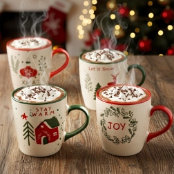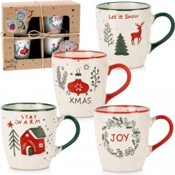 Užijte si zimní chvíle s hrnky, které zahřejí na první pohled. Kameninové provedení s červenými a zelenými akcenty působí útulně a svátečně, zatímco ergonomické ucho zajistí pohodlné držení při popíjení kávy, čaje či horké čokolády. Každý kus má unikátní motiv, takže se sada krásně vyjímá na prostřeném stole i jako dekorace.