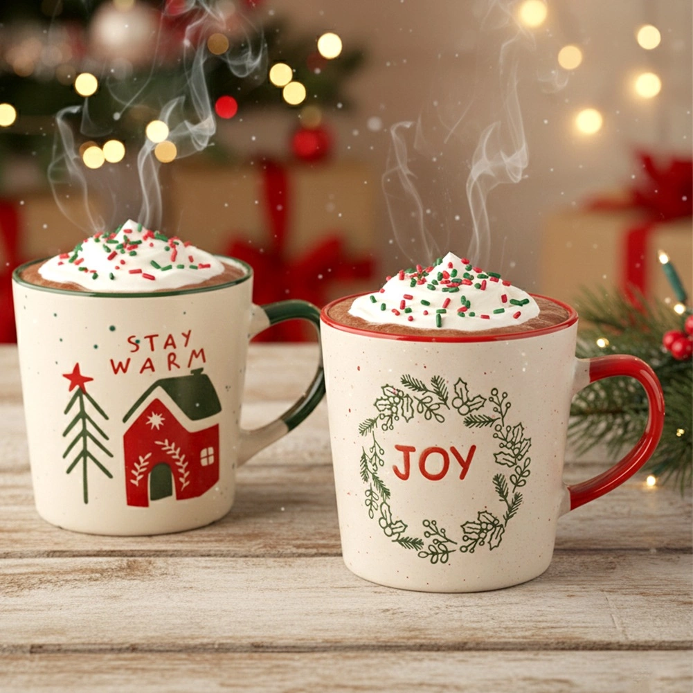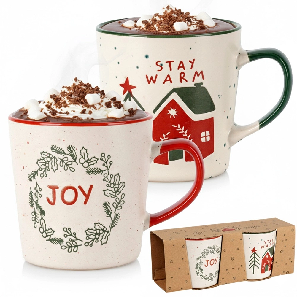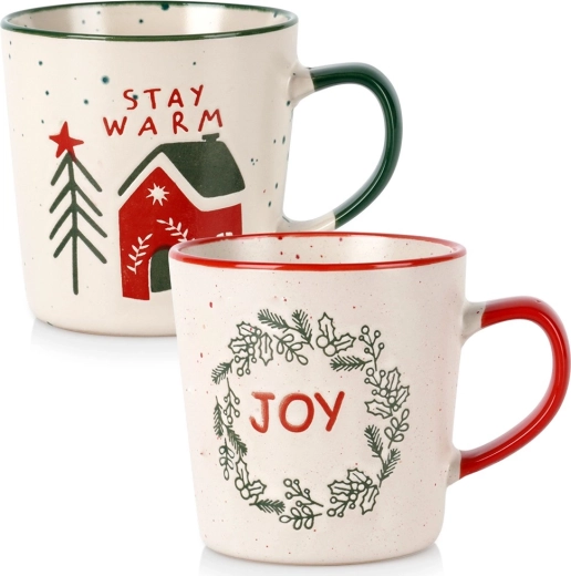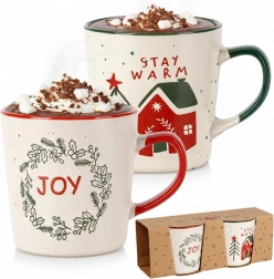 Hrnky zdobí jemné sváteční motivy s nápisy JOY a STAY WARM a kontrastní barevné detaily v červené a zelené barvě. Celá sada je uložena v estetickém dárkovém obalu, který z ní dělá skvělý tip na dárek pro rodinu či přátele. Praktické použití doplňuje možnost mytí v myčce a ohřevu v mikrovlnné troubě.