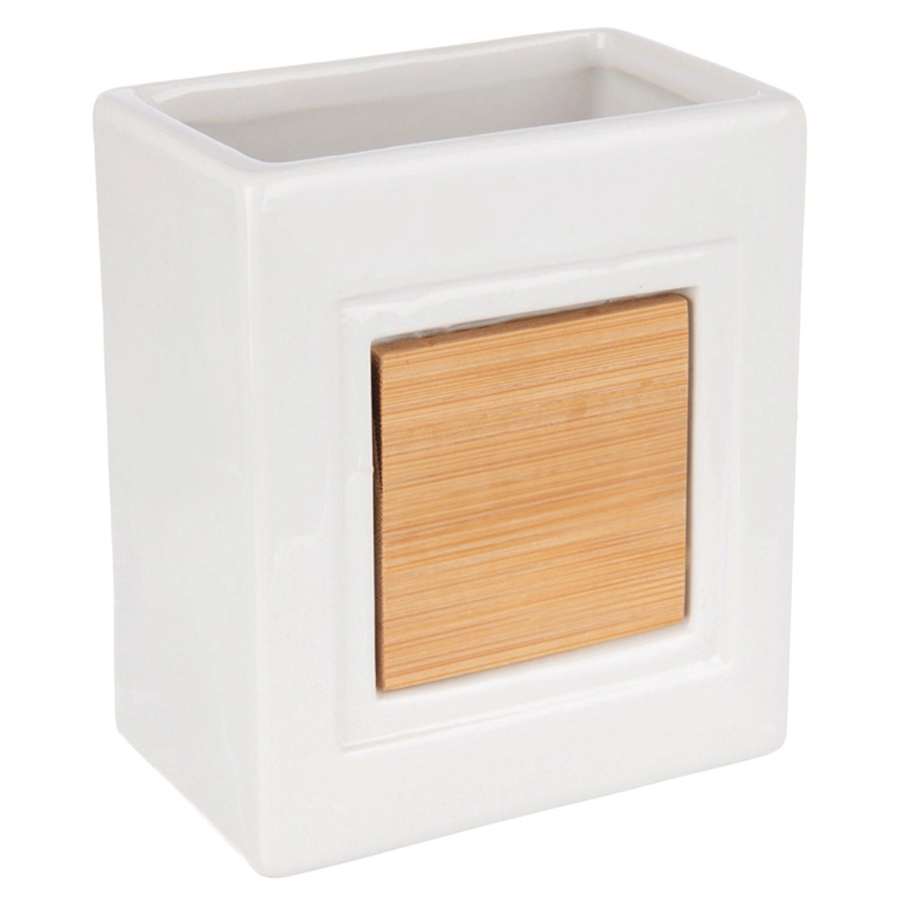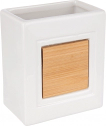 Lesklý bílý povrch s bambusovým panelem působí elegantně a udržuje kartáčky i drobnosti po ruce.
