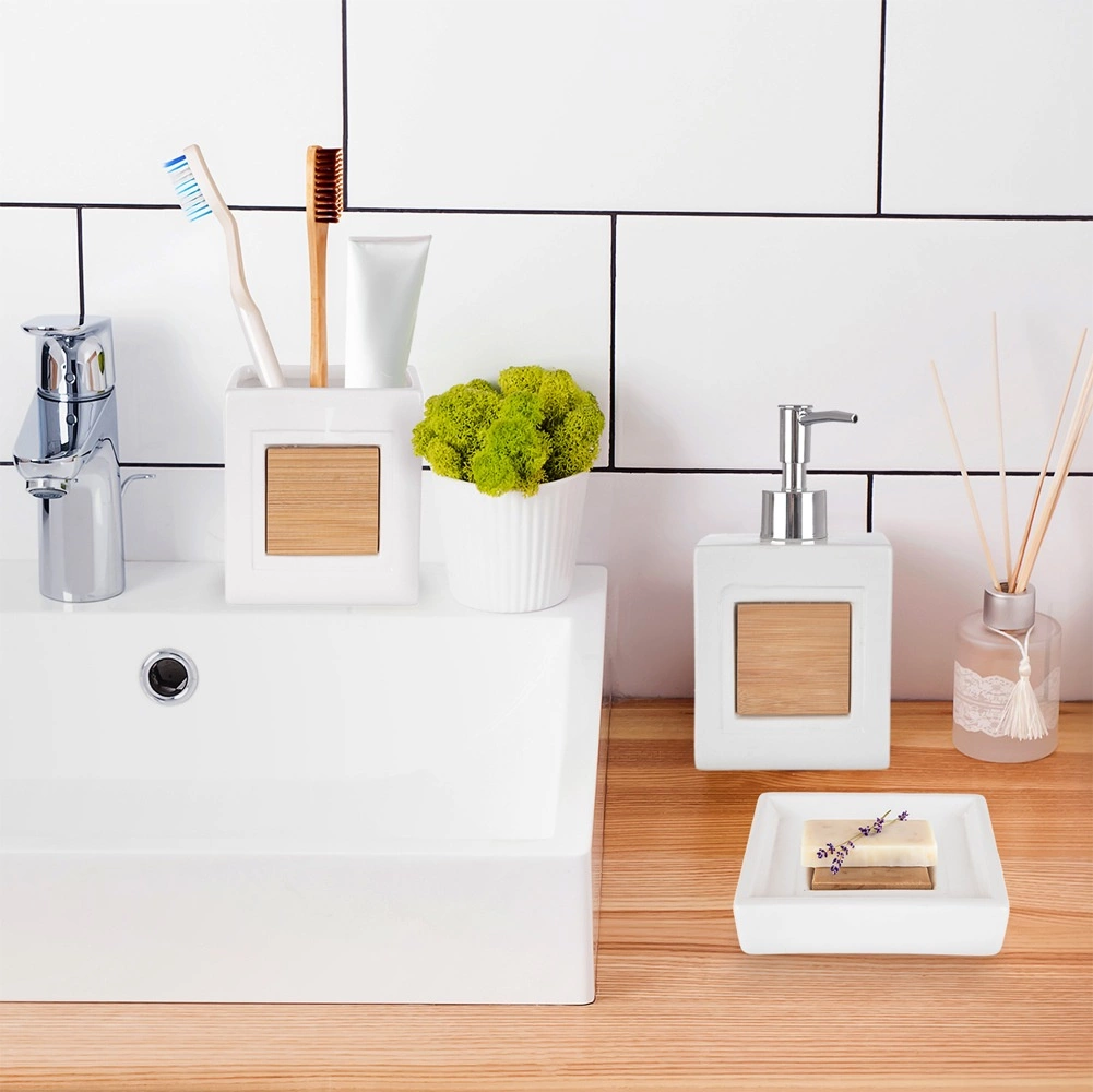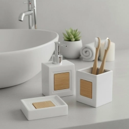Elegantní 3dílná koupelnová sada v bílém provedení kombinuje odolný dolomit a přírodní bambus. Obsahuje dávkovač mýdla 350 ml, koupelnový kelímek 330 ml a mýdlenku. Minimalistický design, snadná údržba a univerzální styl pro moderní i klasické koupelny.