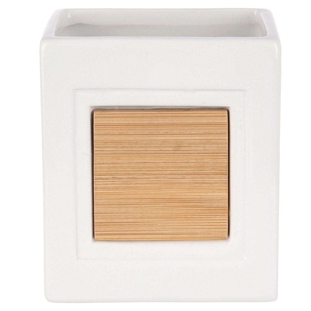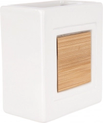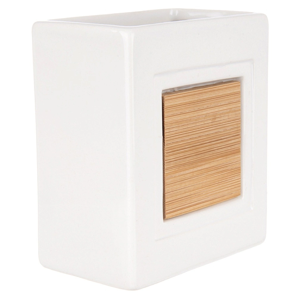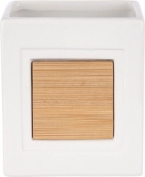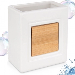 Tento stylový kelímek je ideální do každé koupelny. Kombinuje odolnou dolomitovou keramiku s přírodním bambusem, díky čemuž působí čistě a současně útulně. Otevřená horní část umožňuje přehledné uložení kartáčků, pasty i kosmetických štětců.