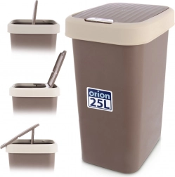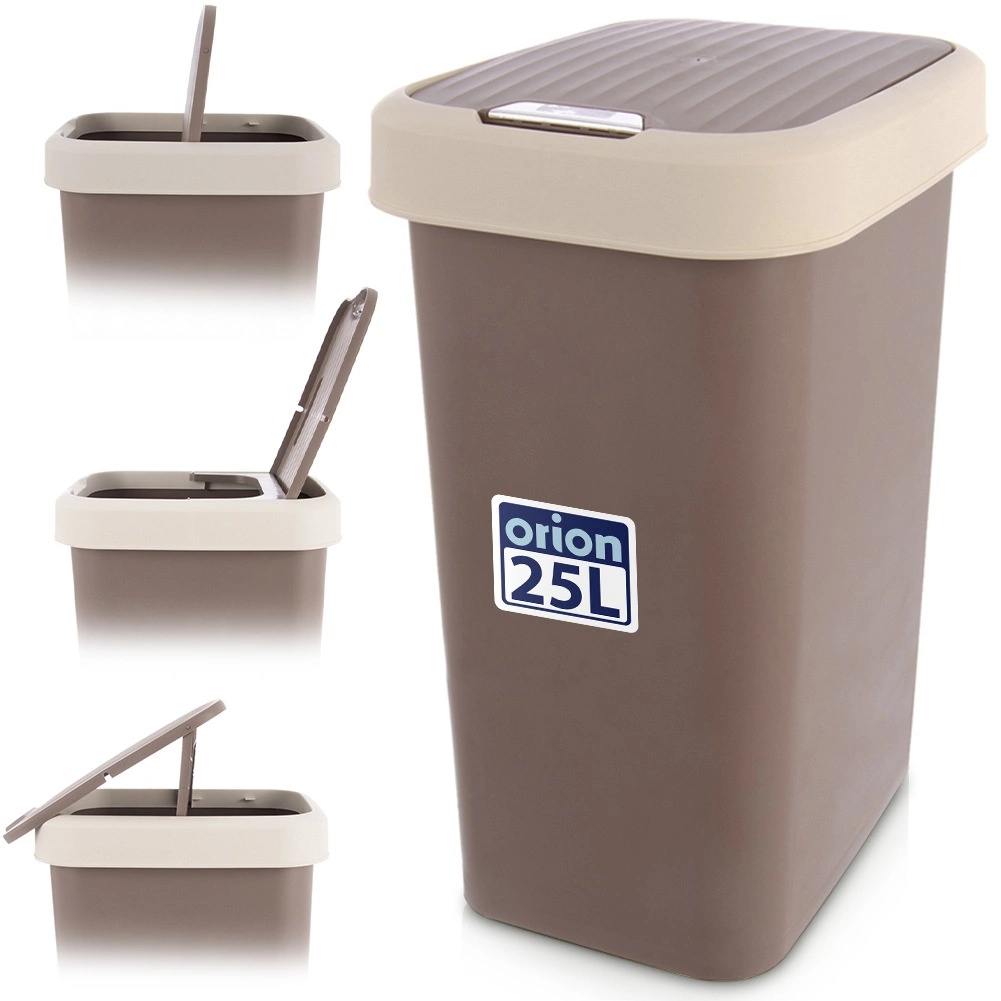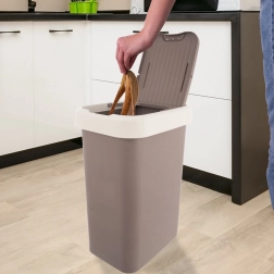 Praktický plastový odpadkový koš o objemu 25 l s výklopným víkem v hnědo-krémové kombinaci. Je lehký a odolný, snadno se čistí a díky zámku otevřeného víka se skvěle hodí do kuchyně, koupelny i kanceláře. Omezuje šíření zápachu a svým úzkým, obdélníkovým tvarem šetří místo.
