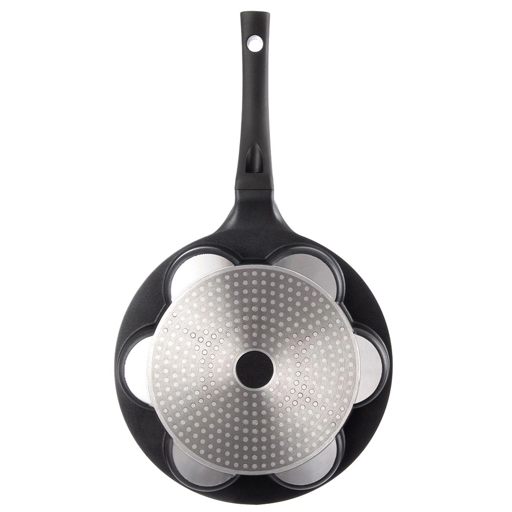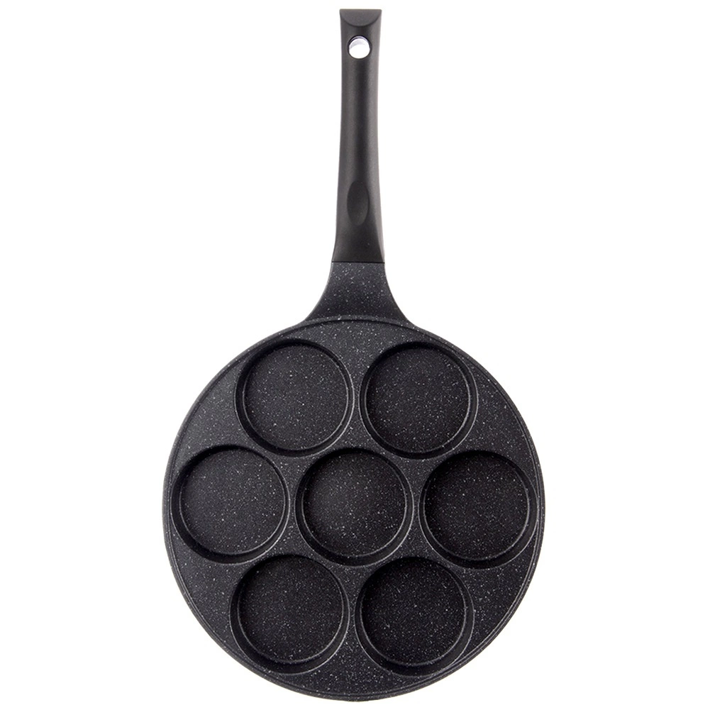 Tato stylová pánev s nepřilnavým žulovým povrchem je ideální pro rychlou přípravu snídaně i svačin. Díky sedmi kulatým formám získáte vždy stejné porce s perfektním tvarem – od vajec „na oko“ přes lívanečky až po mini palačinky. Hliníkové tělo s granitovým povrchem PFLUON GRANIT umožňuje zdravější smažení s minimálním množstvím oleje a usnadňuje čištění.