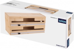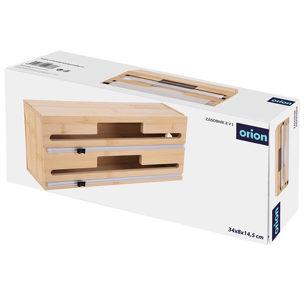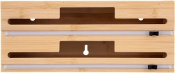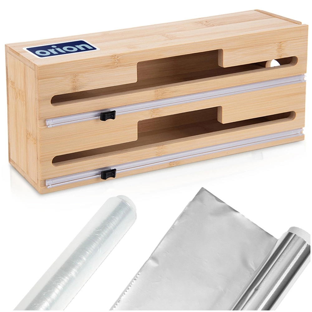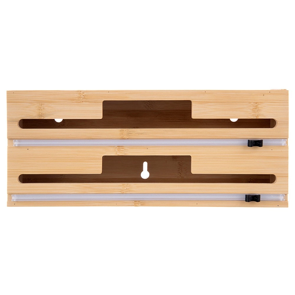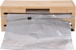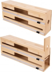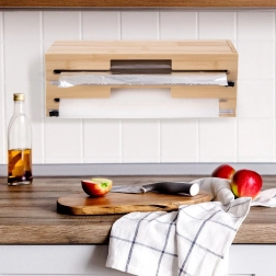 Praktický bambusový dávkovač 2v1 pro potravinovou fólii, alobal a pečicí papír udrží vaši kuchyň přehlednou a efektivní. Nabízí dvě samostatné dráhy s přesnými posuvnými řezáky pro hladké a rovné střihy bez mačkání. Robustní bambusové dřevo s prvky z nerezové oceli vypadá elegantně, šetří místo a lze jej postavit na pracovní desku, zavěsit na stěnu nebo uložit do zásuvky.