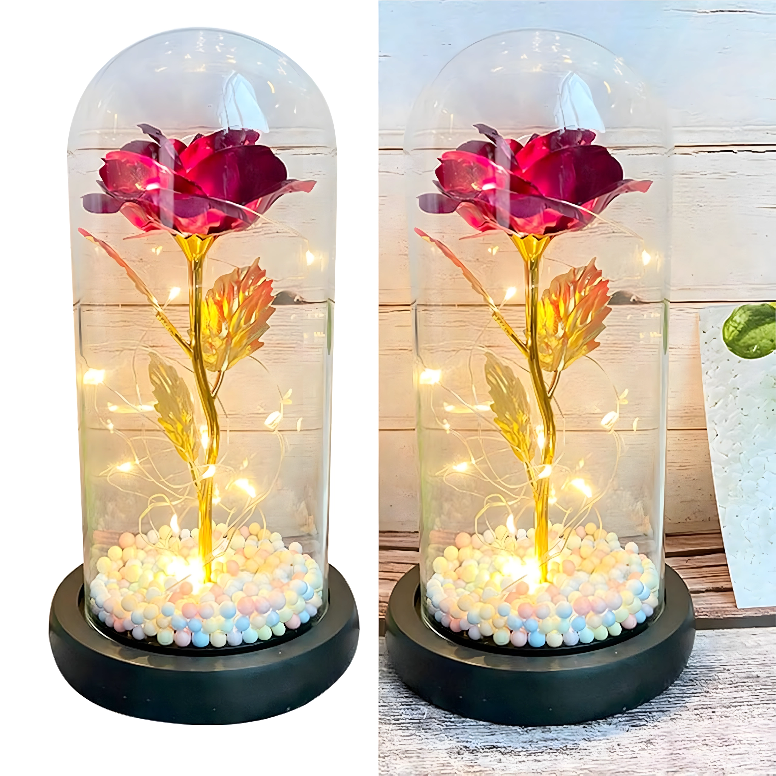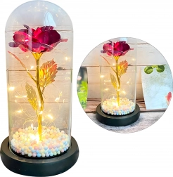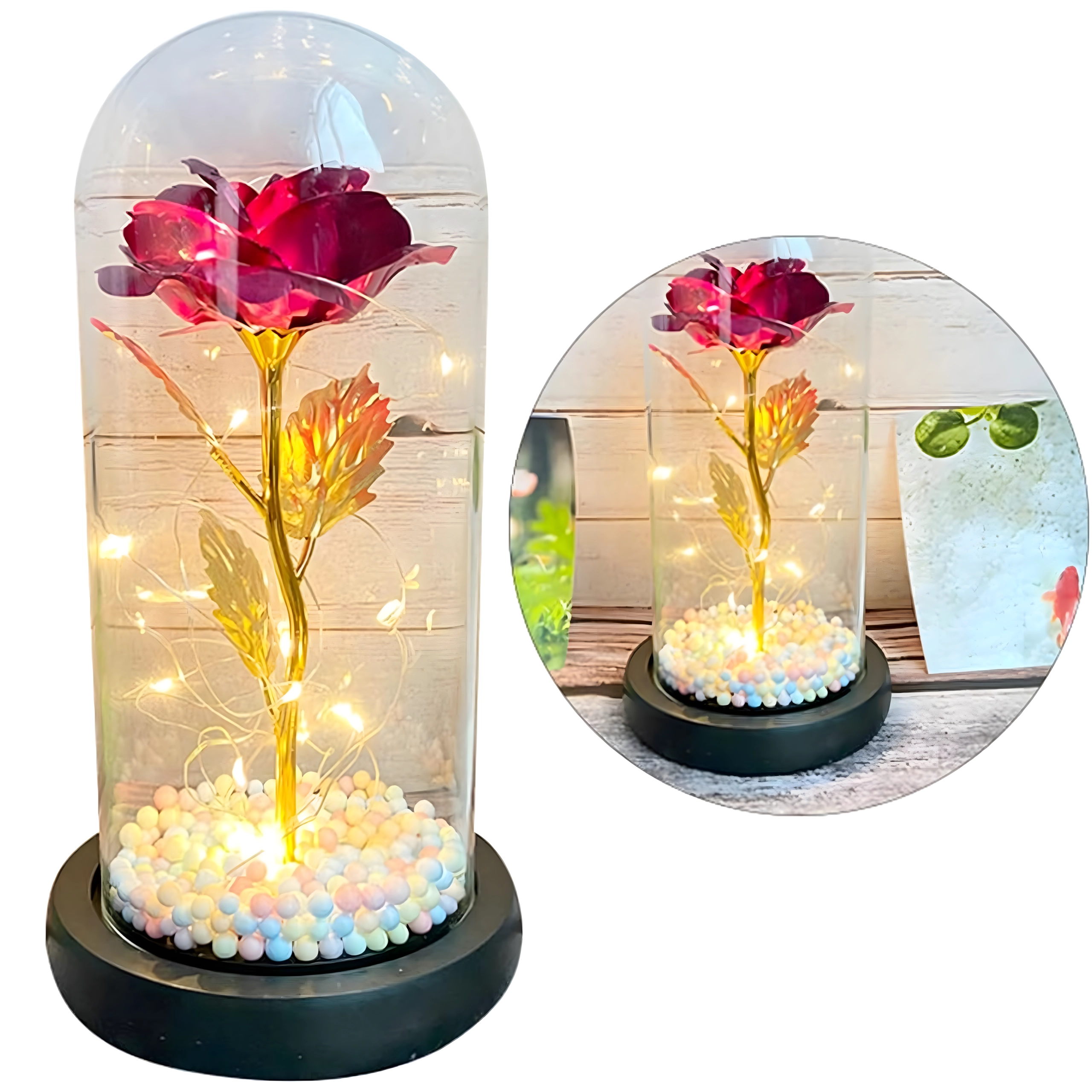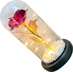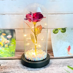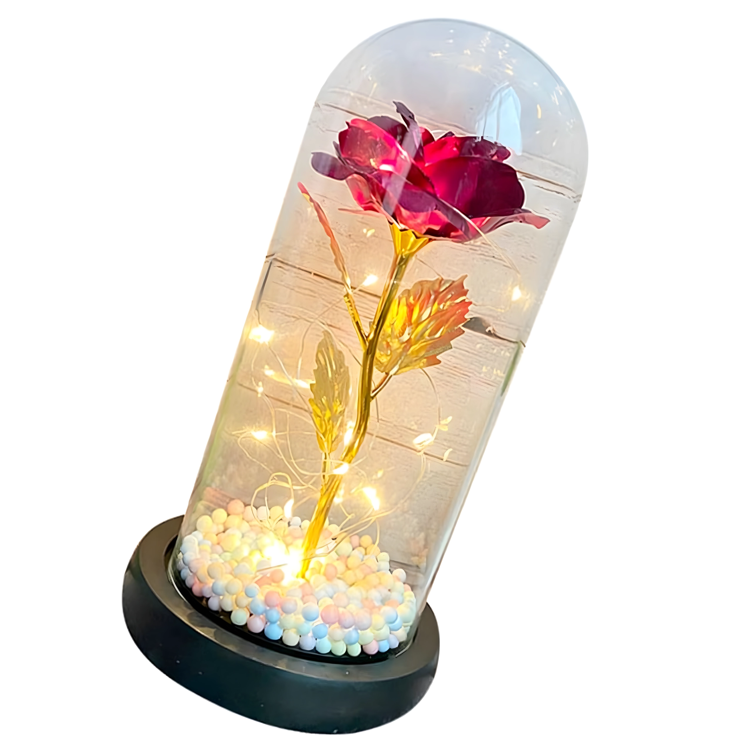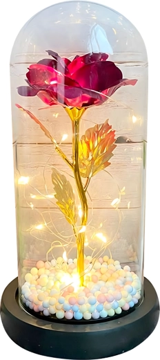 Okouzlující dekorace, která spojuje krásu růže a hřejivé světlo. Skleněný klos chrání květ před prachem, zatímco LED řetízek vytváří jemné odlesky na zlatém stonku a listech. Barevné/pastelové korálky v podstavci dodávají jemný, hravý akcent.