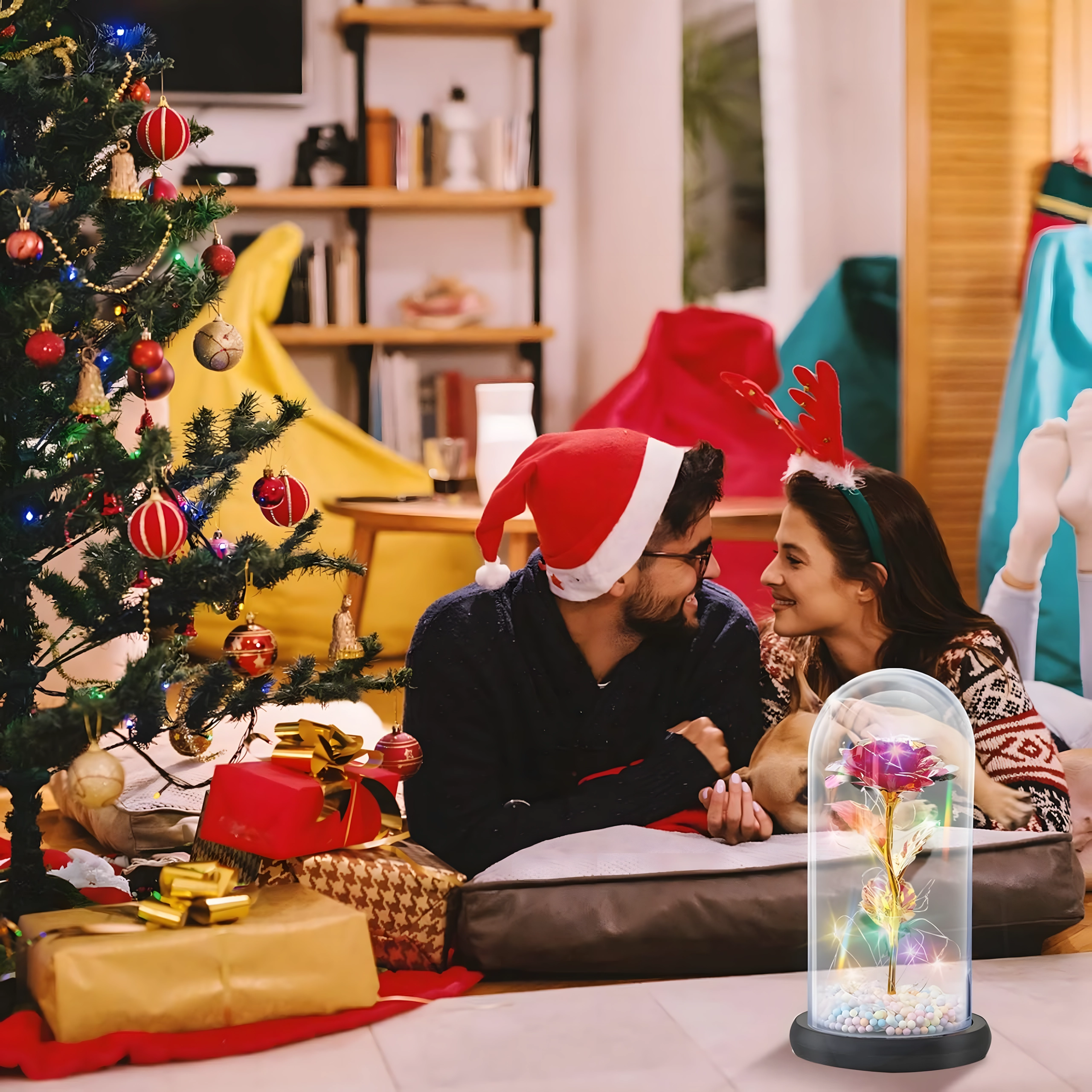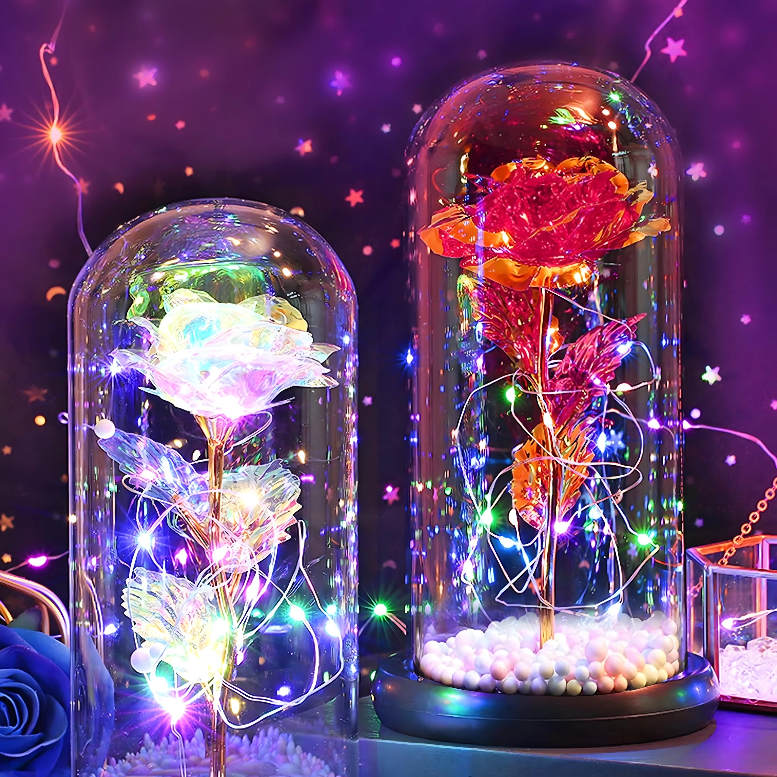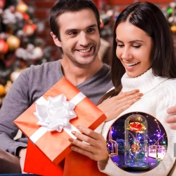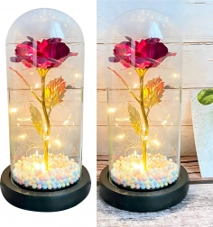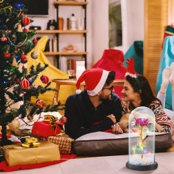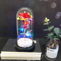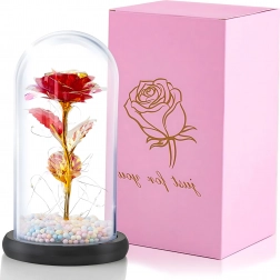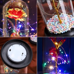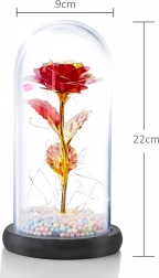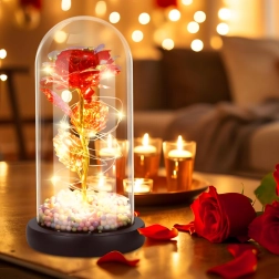 Okouzlující dekorace, která spojuje krásu růže a hřejivé světlo. Skleněný klos chrání květ před prachem, zatímco LED řetízek vytváří jemné odlesky na zlatém stonku a listech. Barevné/pastelové korálky v podstavci dodávají jemný, hravý akcent.