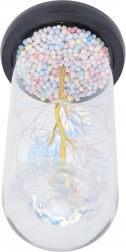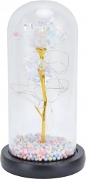 Tato bílá věčná růže v dómu je symbolem nadčasové lásky a vkusného designu. Skleněný kryt chrání jemné detaily květu, zatímco drobné LED drátky obtáčejí zlatý stonek a vytvářejí teplé ambientní světlo. Pastelové korálky v podstavci dodávají dekoraci hravý akcent.