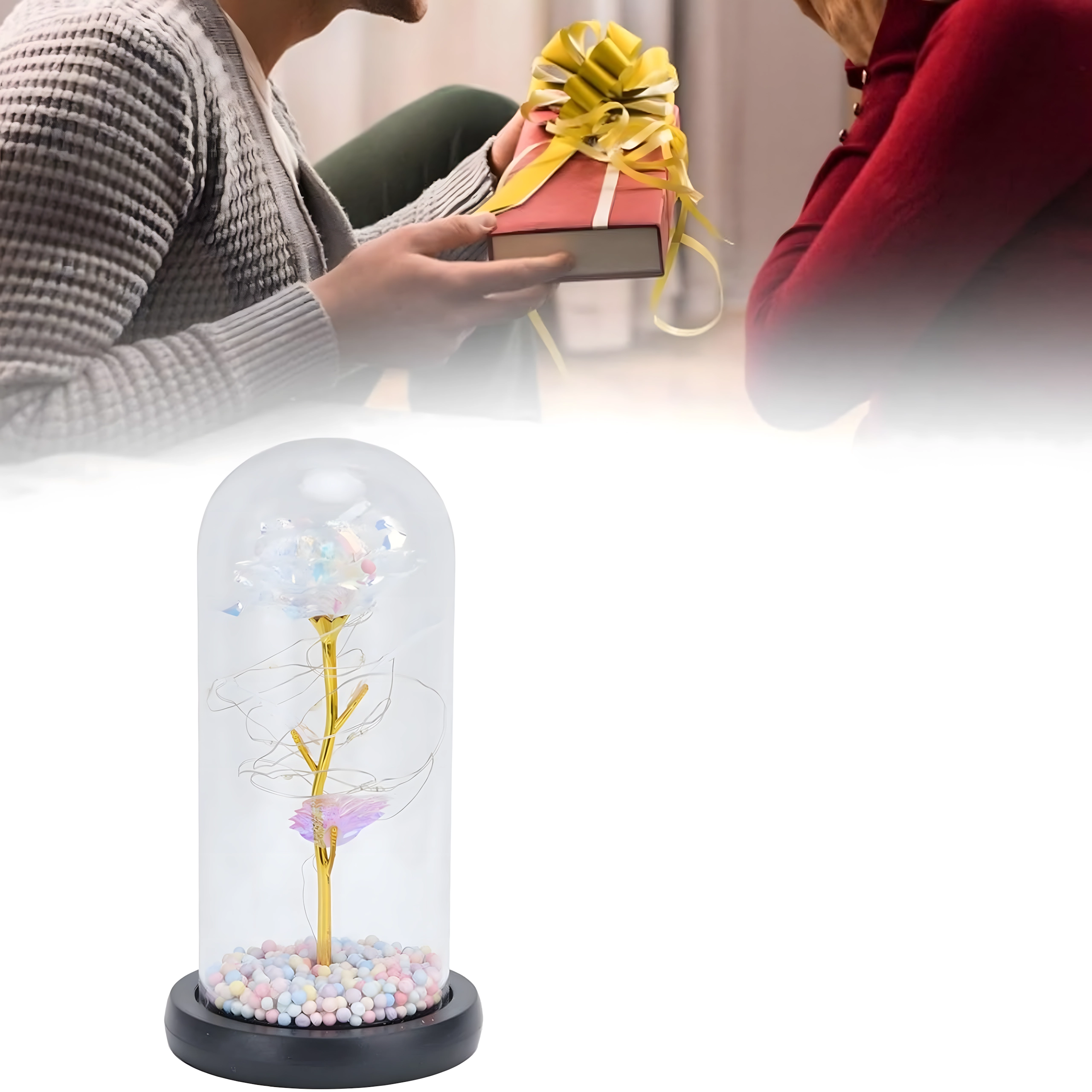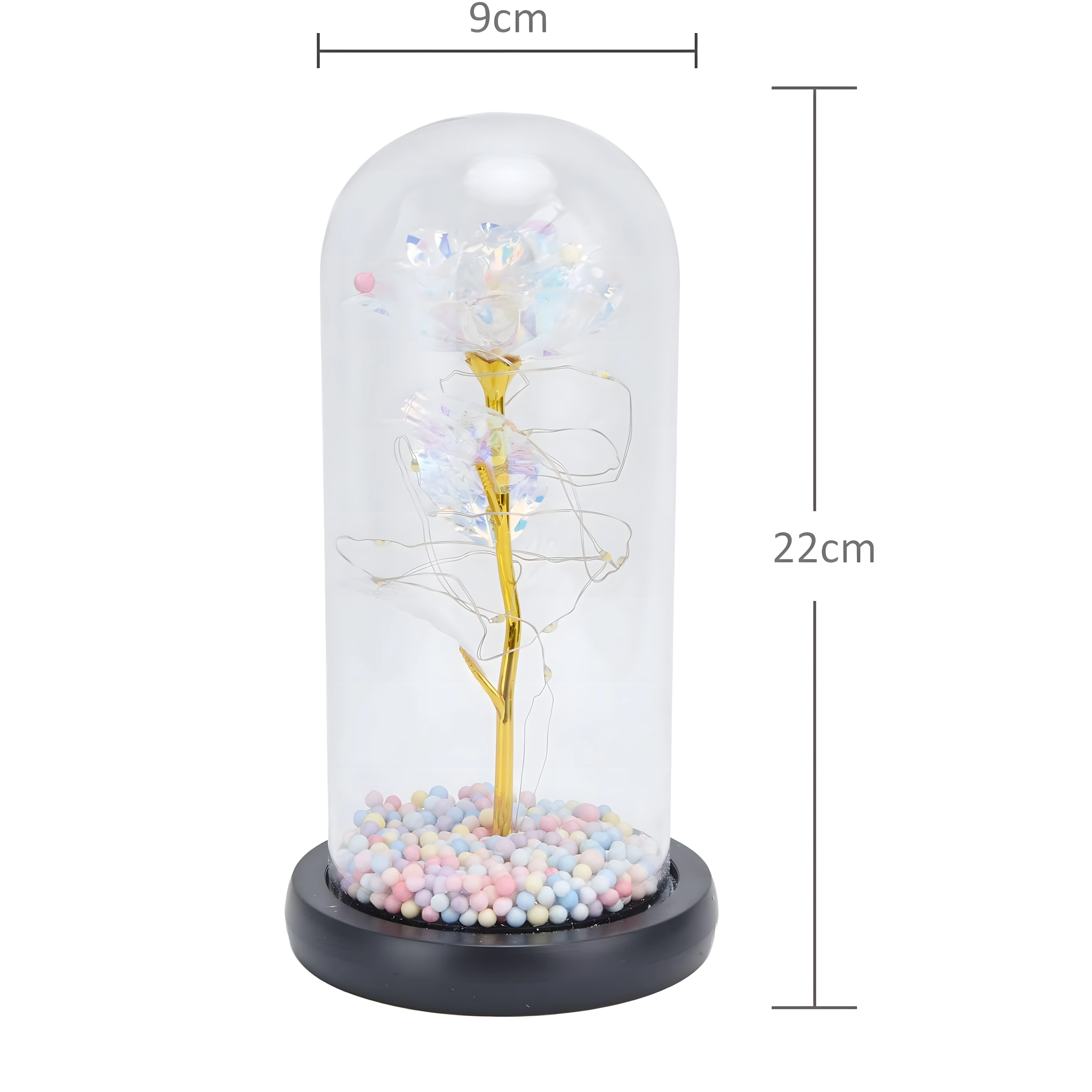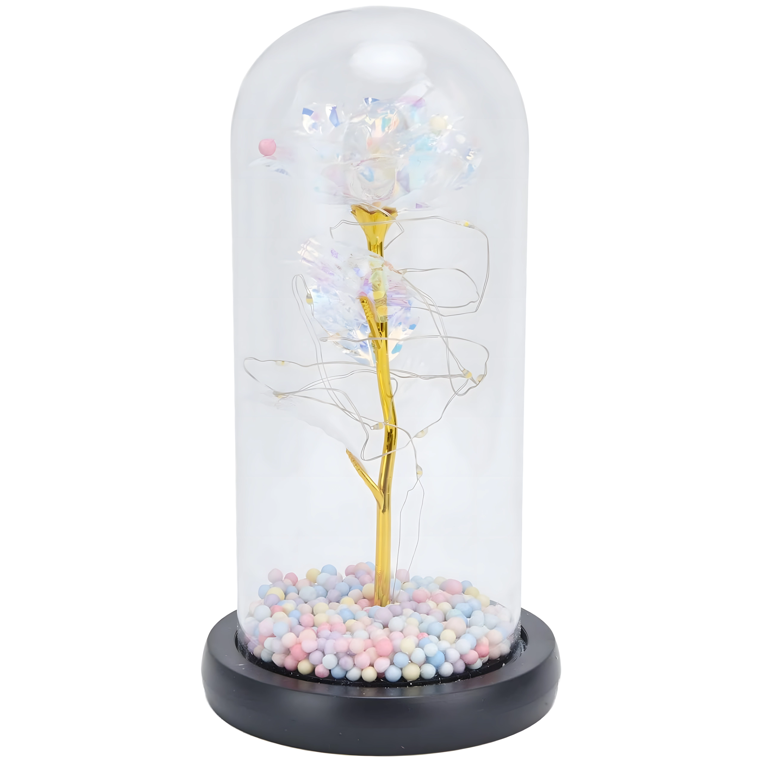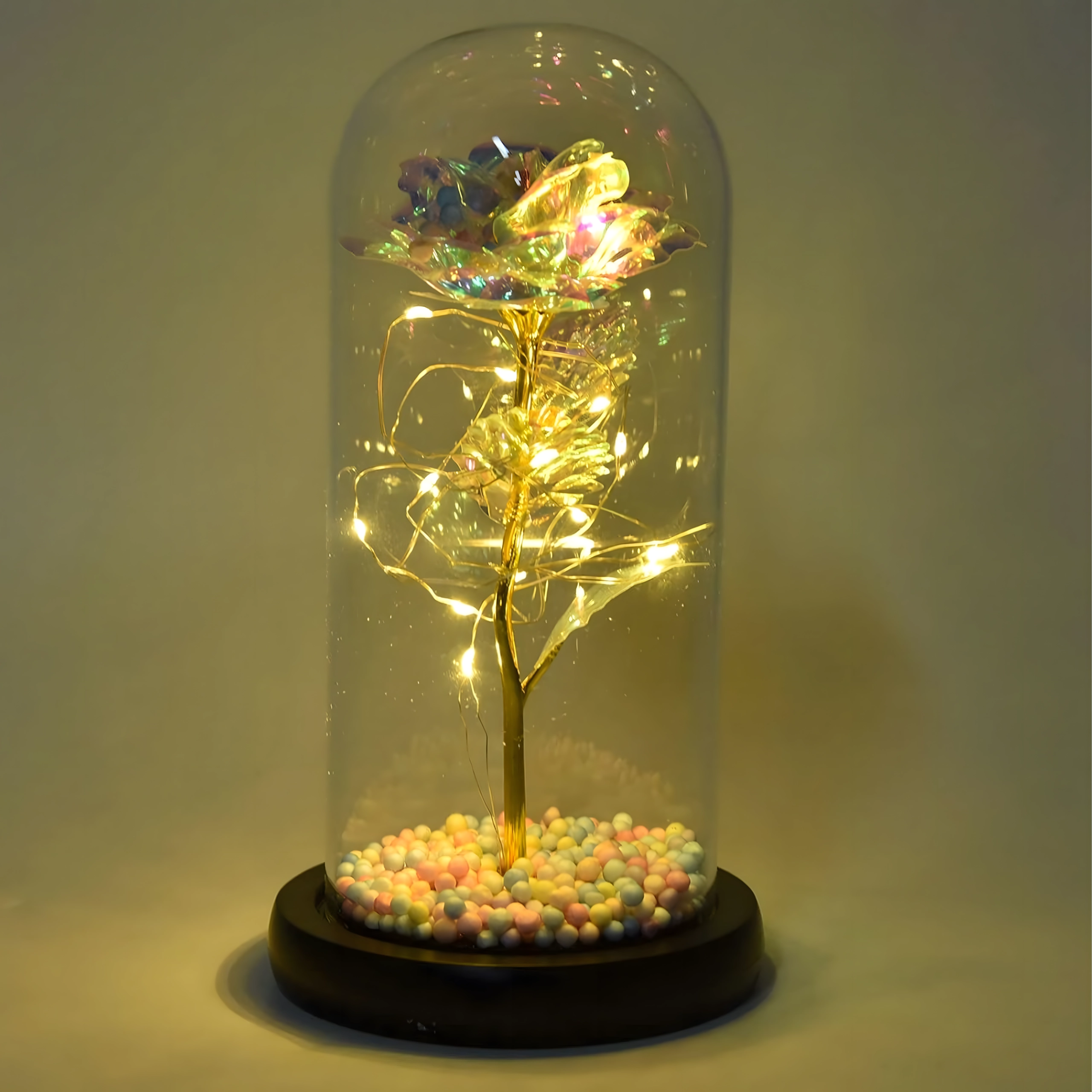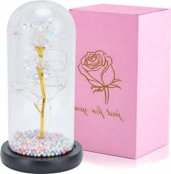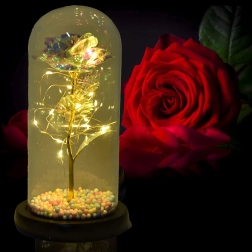Darujte emoce, které přetrvají: tato dekorativní růže pod skleněným dómem se jemně rozzáří díky integrovaným LED světýlkům. Elegantní skleněný kryt, zlatý stonek a duhové okvětní lístky vytvářejí kouzelnou atmosféru – ideální romantický dárek a designová dekorace na stůl či komodu.