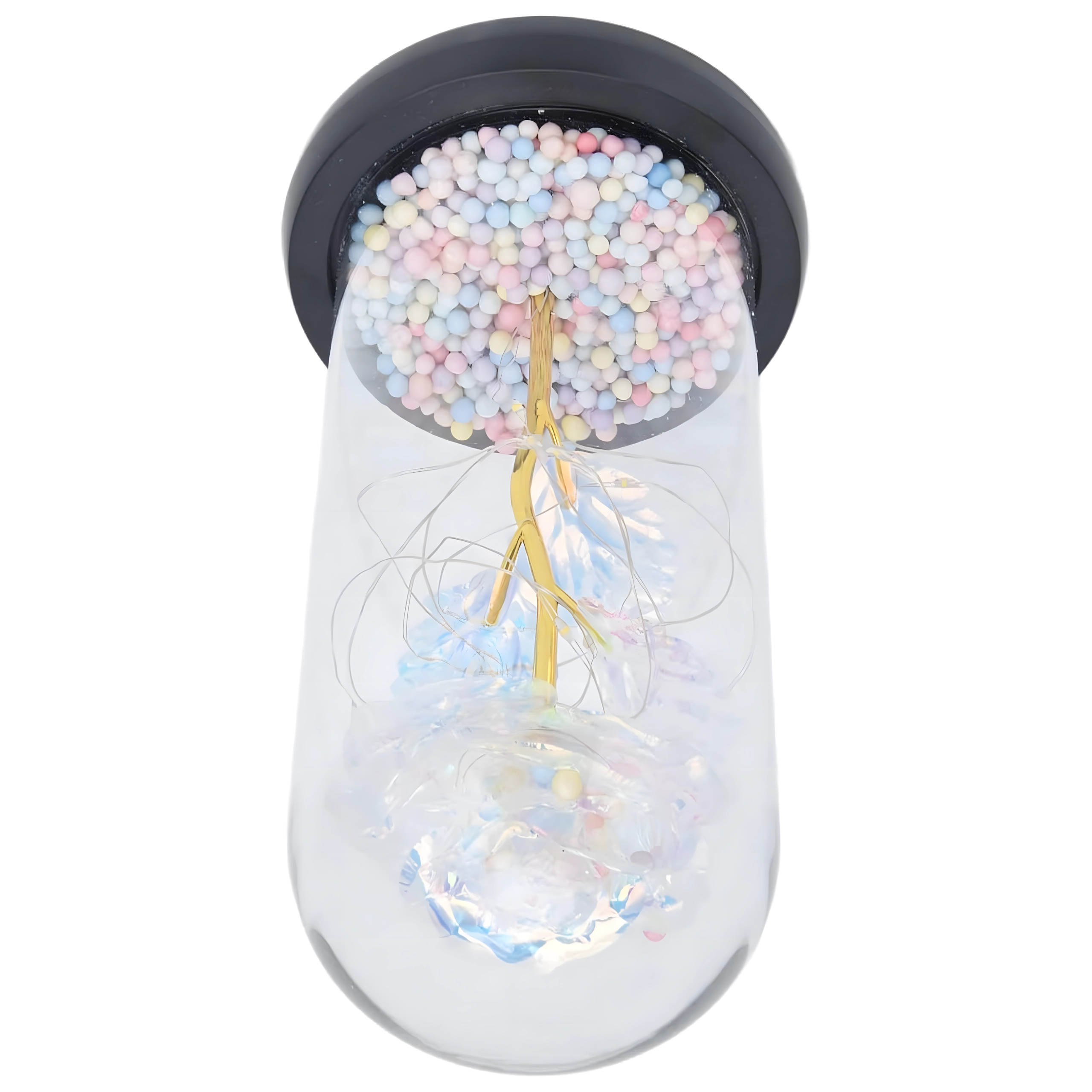 Čirý skleněný kryt chrání květ před prachem a podtrhuje jeho třpytivé, duhové lístky – dekorace září z každého úhlu.