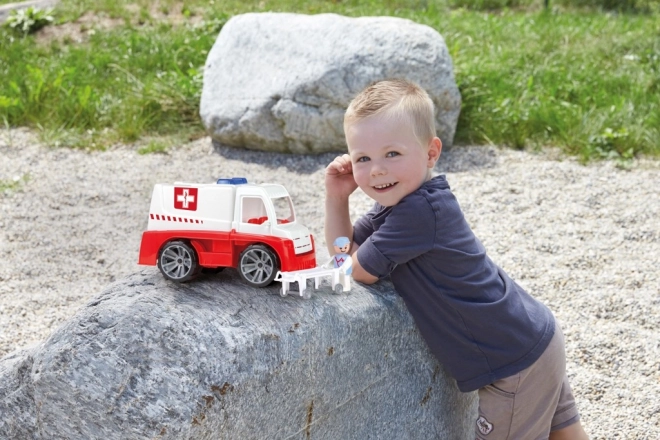 Robustní plastová sanitka LENA TRUXX pro malé záchranáře nabízí mechanickou funkčnost, otevírací dveře a odklopnou kabinu. Součástí je figurka záchranáře a nosítka pro realistickou hru. Délka 29 cm, vhodná od 2 let, ideální na písek i domů, bez baterií.