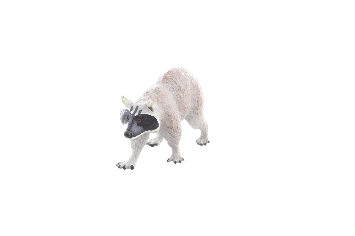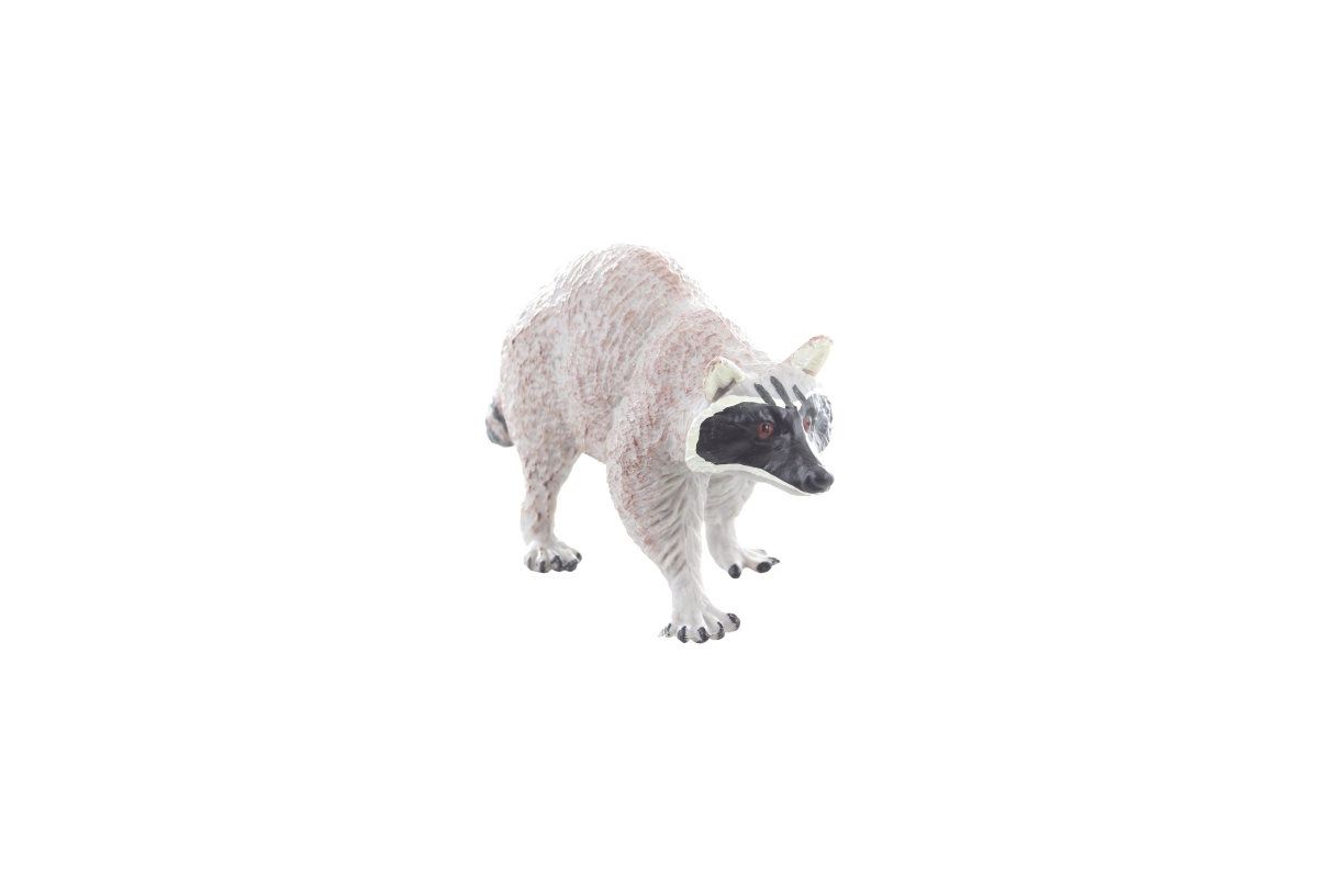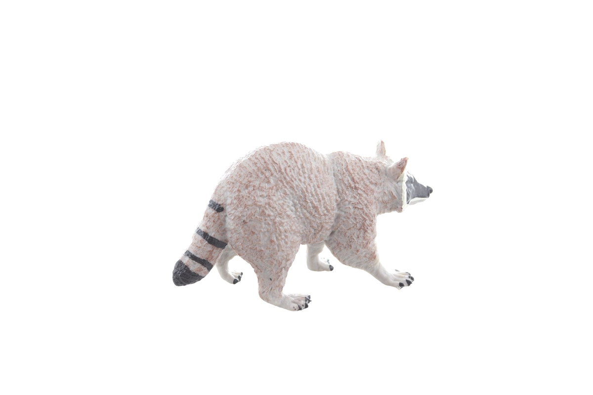 Detailní textura srsti, přesná malba obličejové masky a pruhovaného ocasu přináší autentický vzhled mývala pro edukativní i volnou hru.